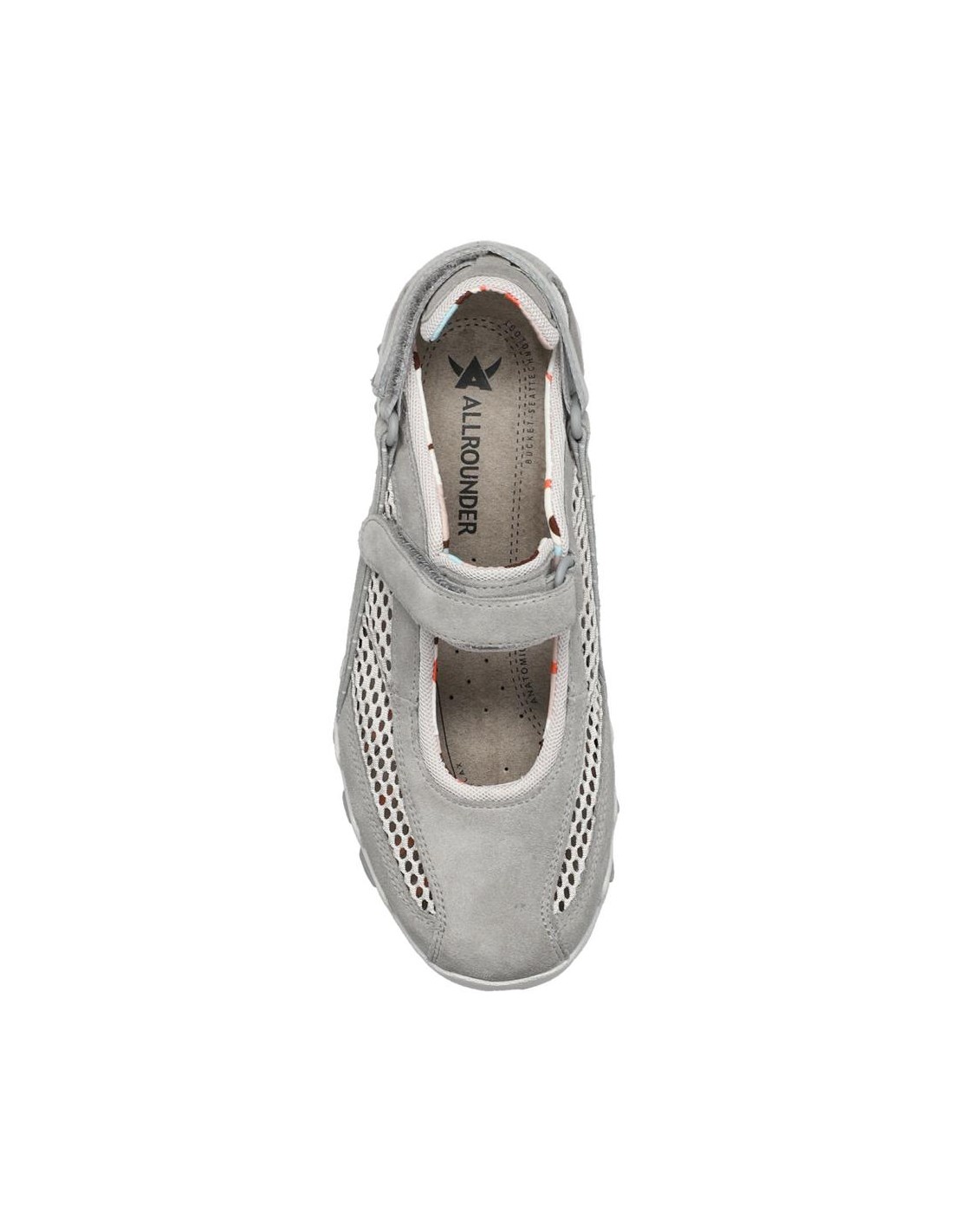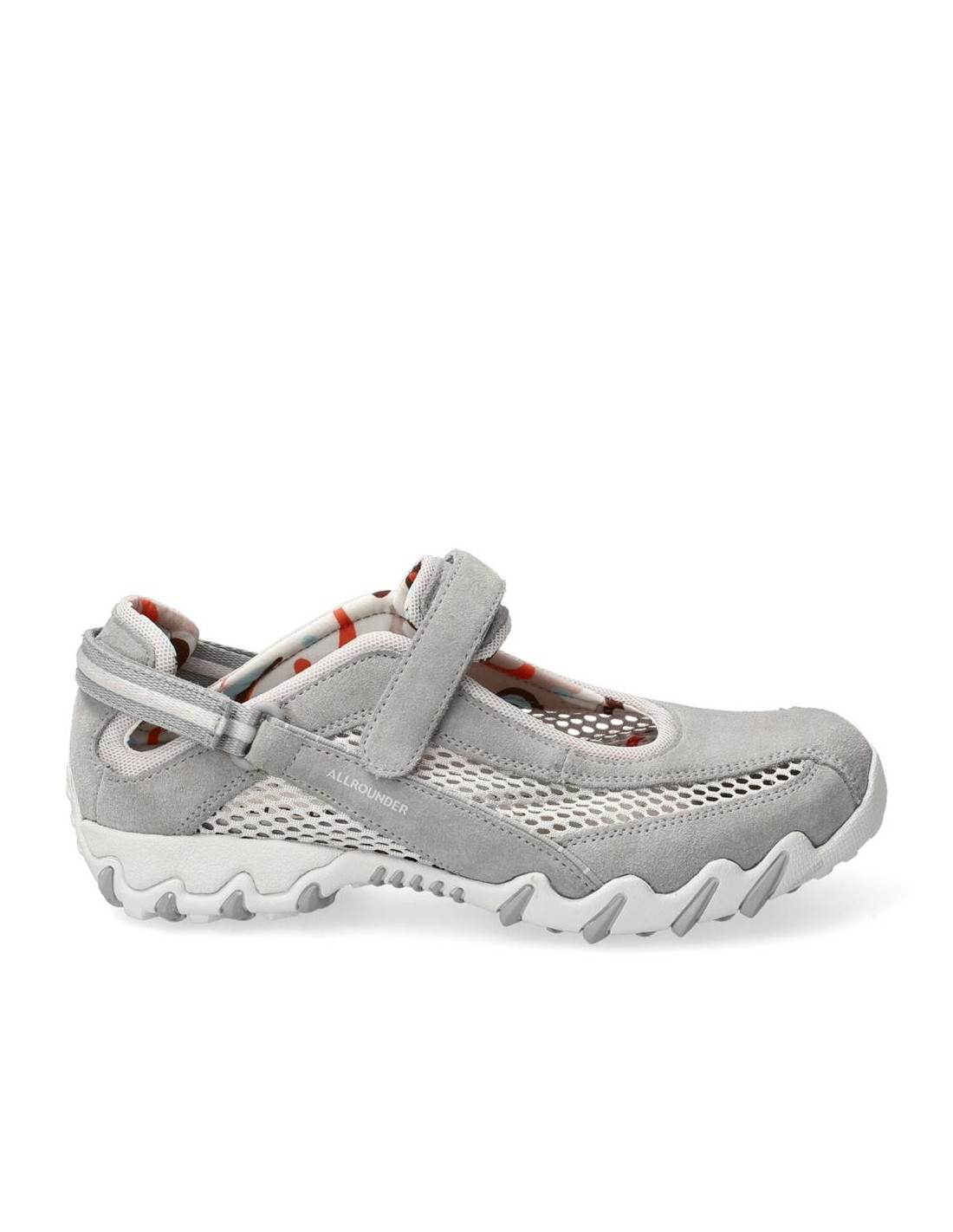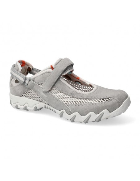 Descripción: Deportiva estilo bailarina NIRO de ALLROUNDER en nubuck gris y rejilla, con ajuste de dos velcros. Plantilla anatómica móvil. Suela con tecnología óptima de amortiguación, flexible y antideslizante.