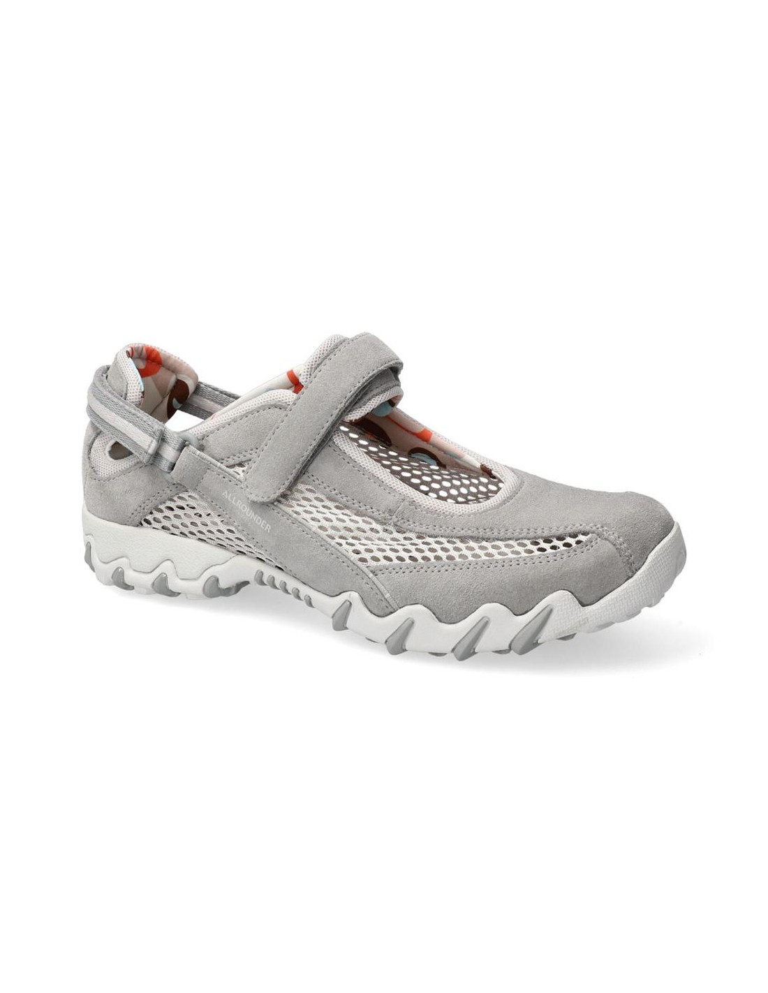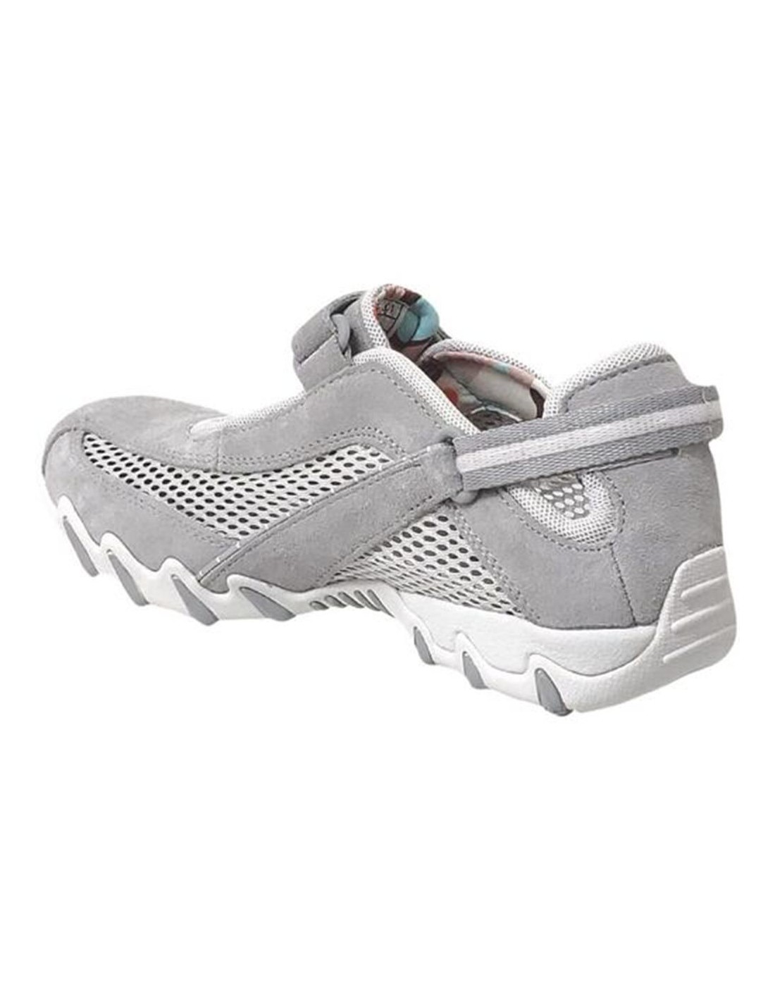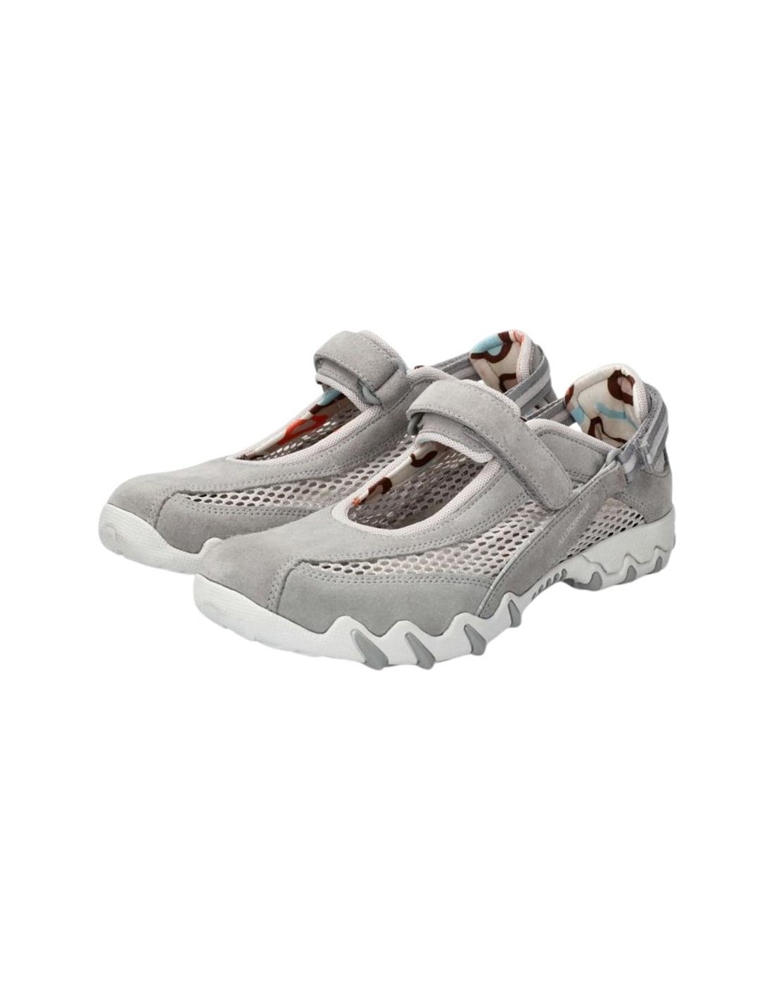 Descripción: Deportiva estilo bailarina NIRO de ALLROUNDER en nubuck gris y rejilla, con ajuste de dos velcros. Plantilla anatómica móvil. Suela con tecnología óptima de amortiguación, flexible y antideslizante.