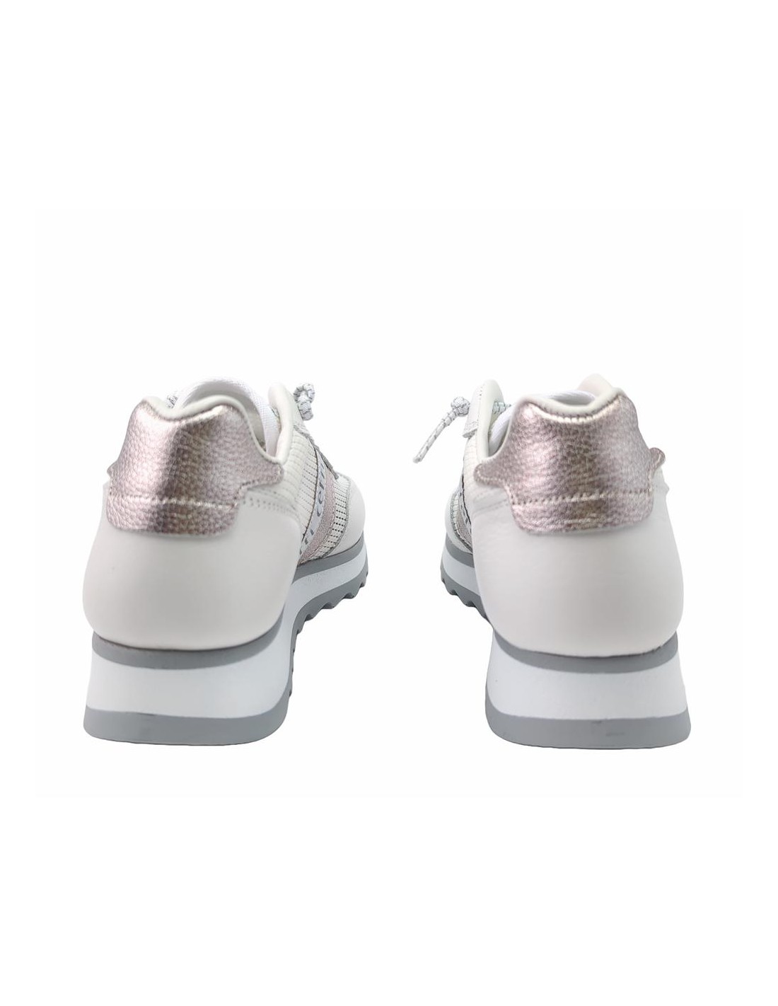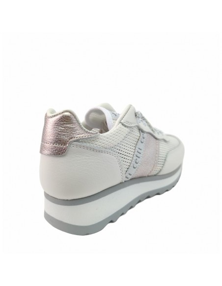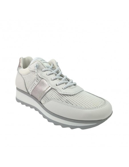 Descripción: Deportiva mujer 849 de CETTI en rejilla y fuerzos en piel lisa blanca, talonera ante azul y detalle oro. Cordones elásticos. Plantilla extraible acolchada. Ligero piso bicolor con patín dentado antideslizante.
