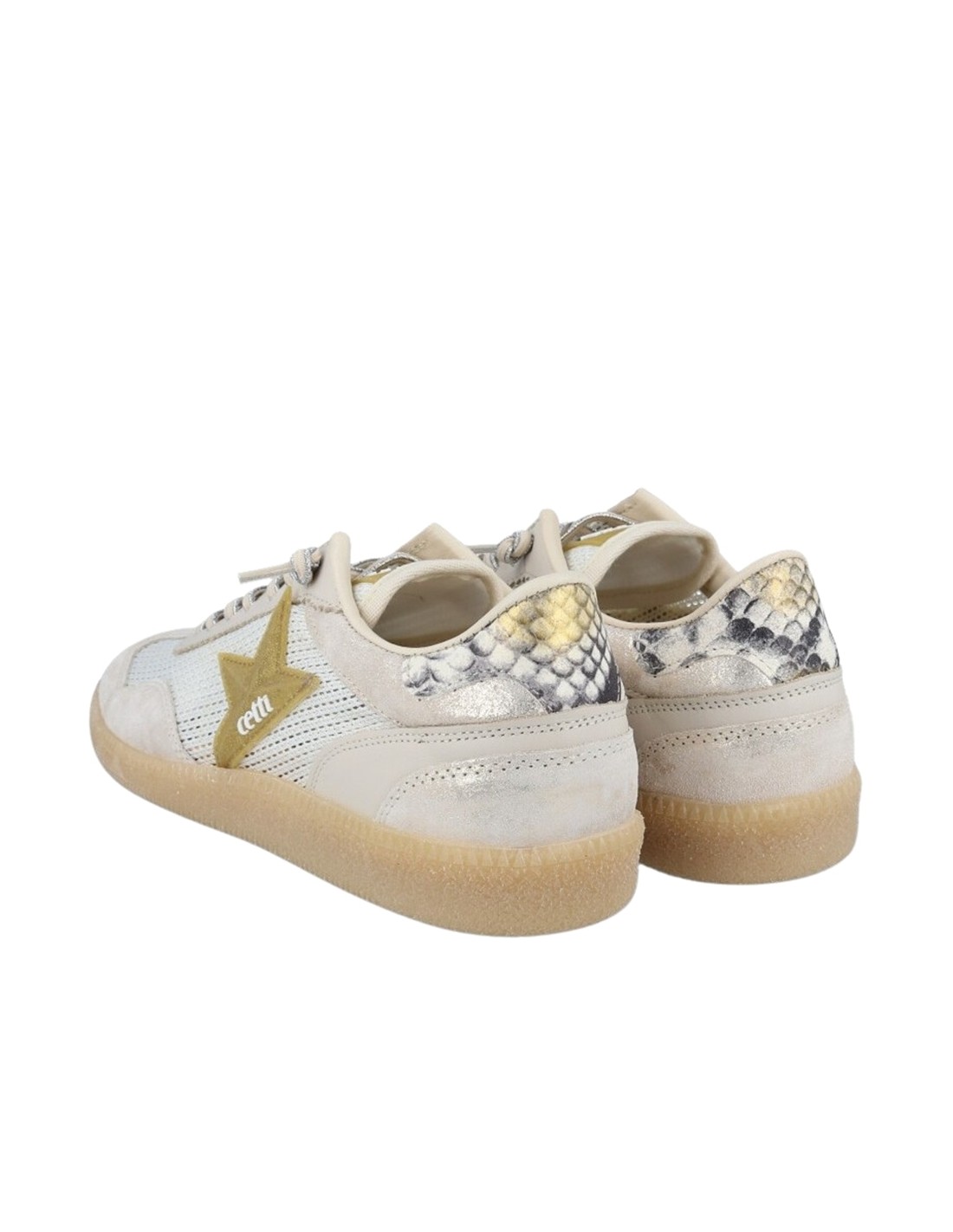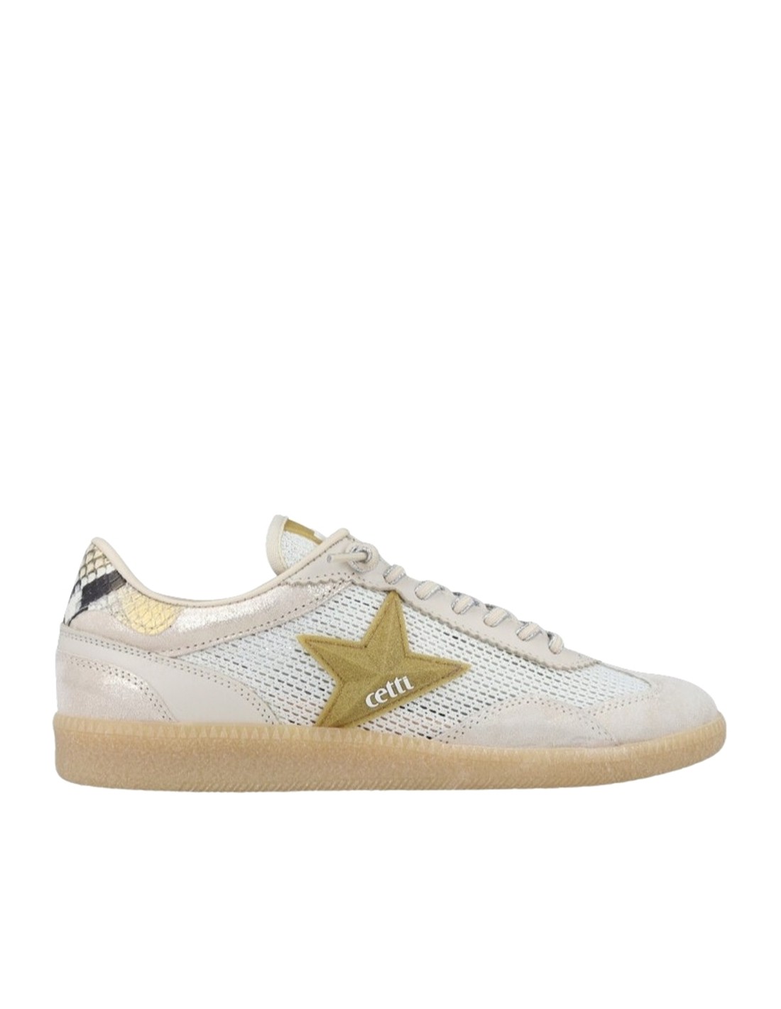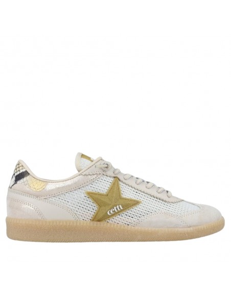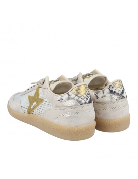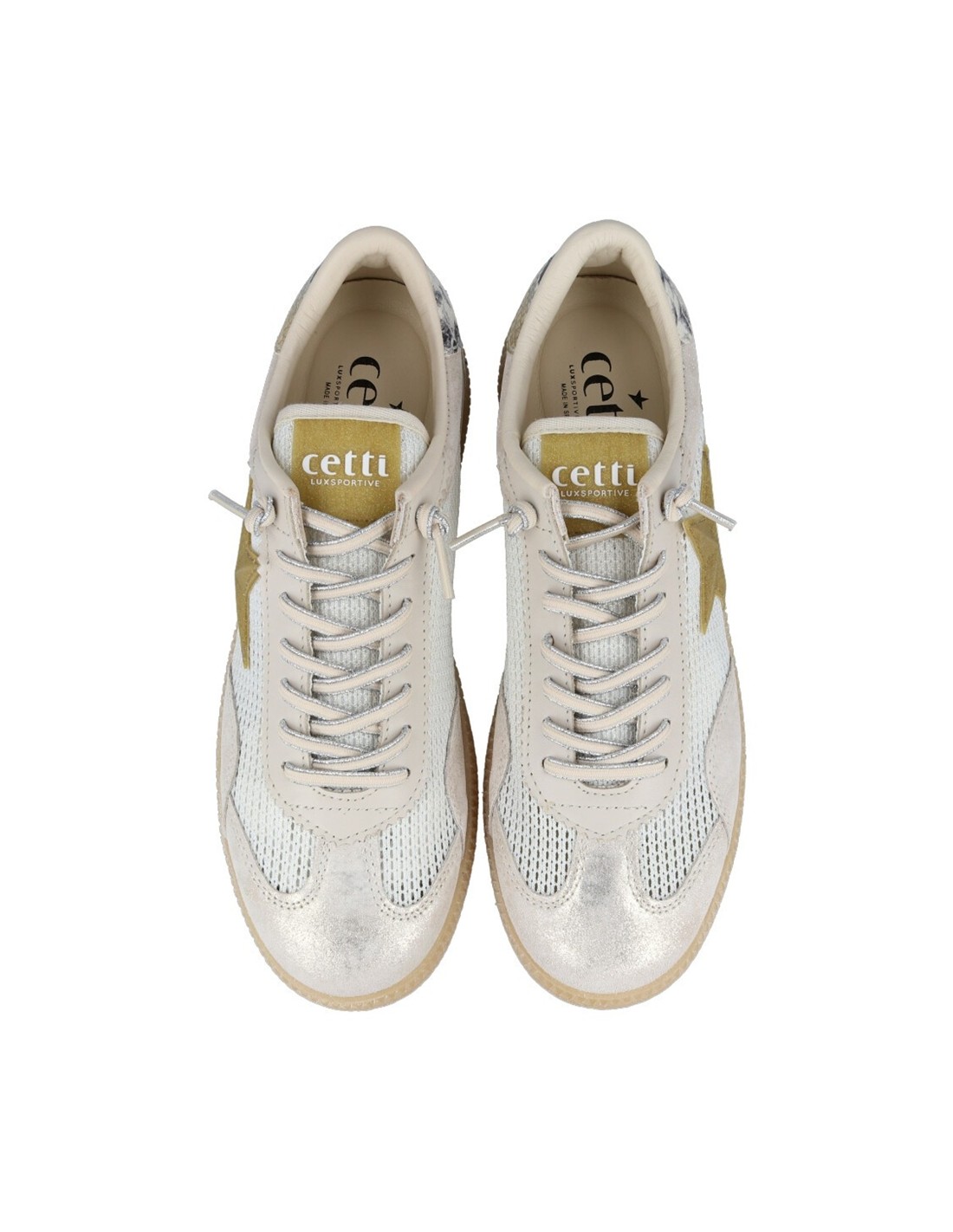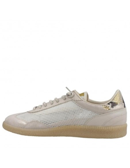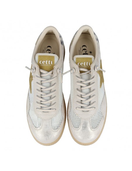Descripción: Deportiva mujer 1385 de CETTI en fresca rejilla blanca refuerzos en piel metalizada y detalle animal print. Cordones elásticos. Plantilla extraible acolchada. Ligero piso tono caramelo antideslizante.