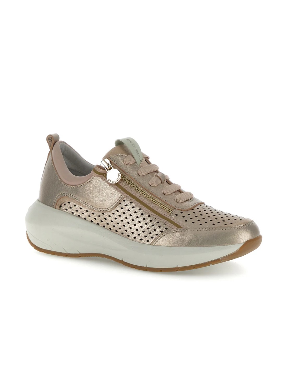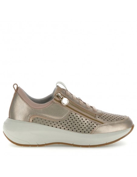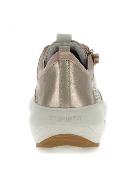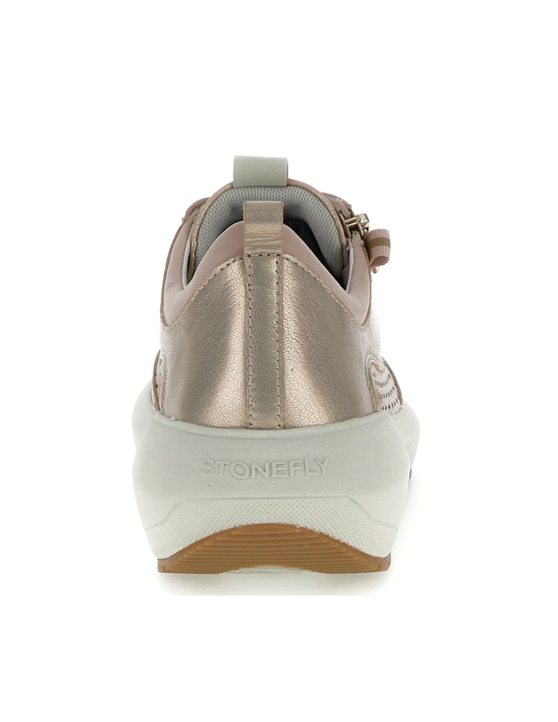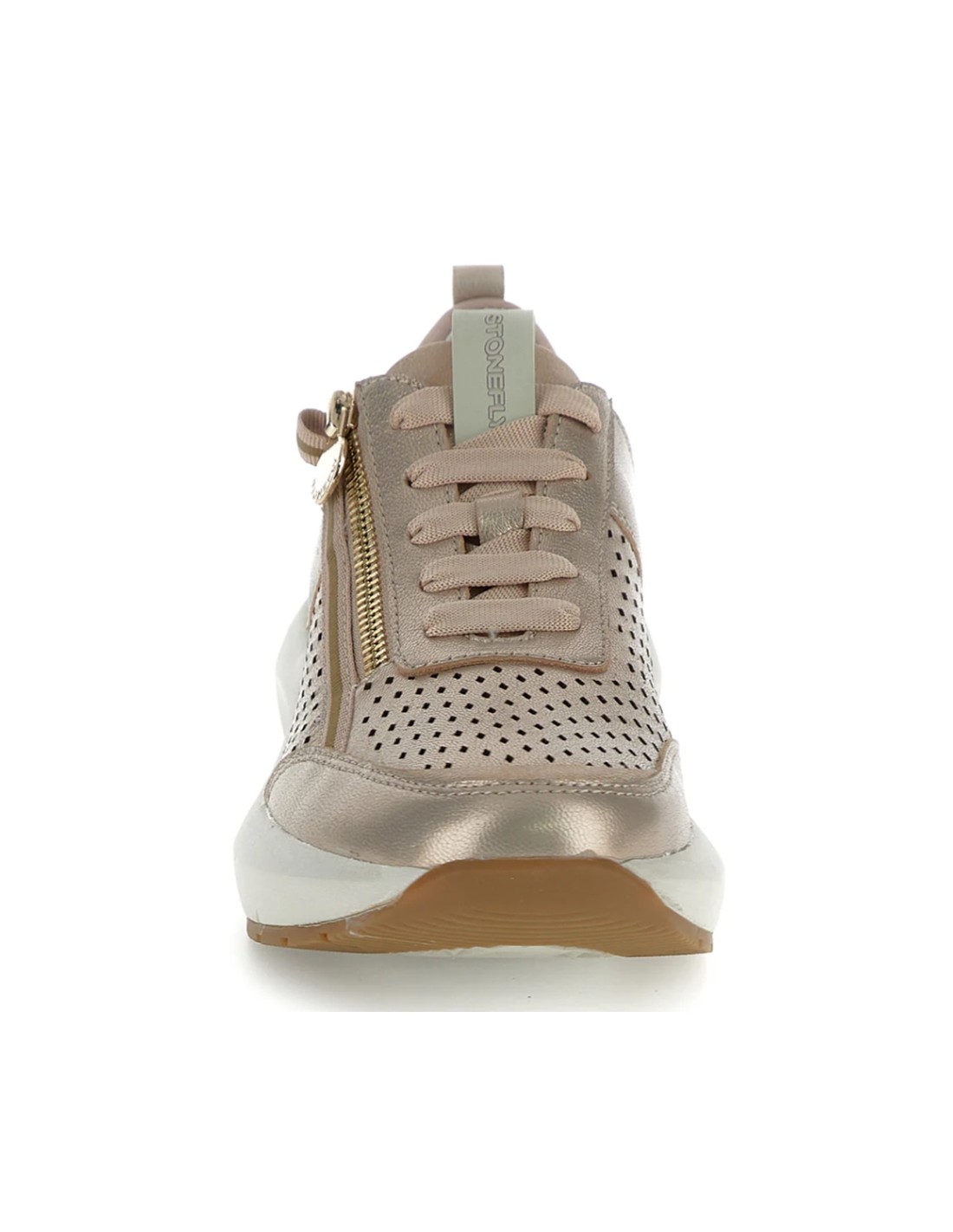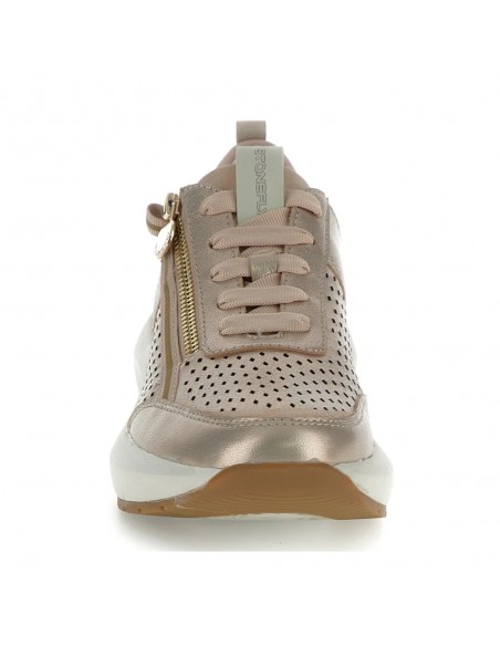 Descripción: Cómoda y elegante deportiva mujer de Stonefly TWINS-5 en suave piel perforada tono taupe metalizado. Ligera cuña con tecnología BLUSOFT que garantiza una amortiguación perfecta.