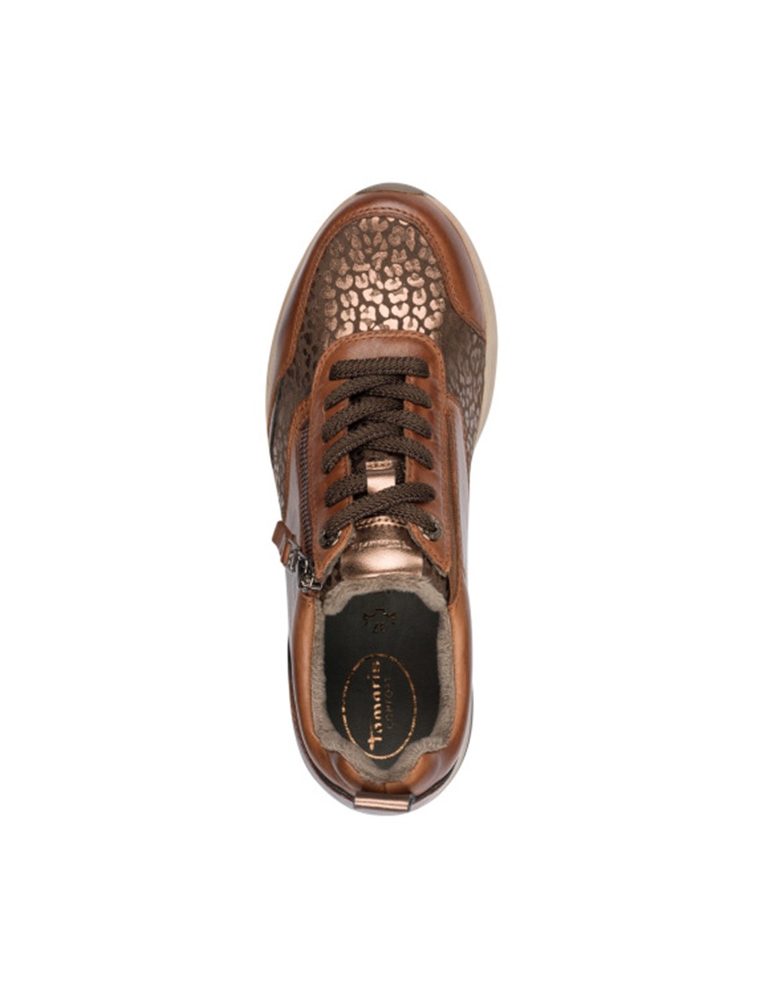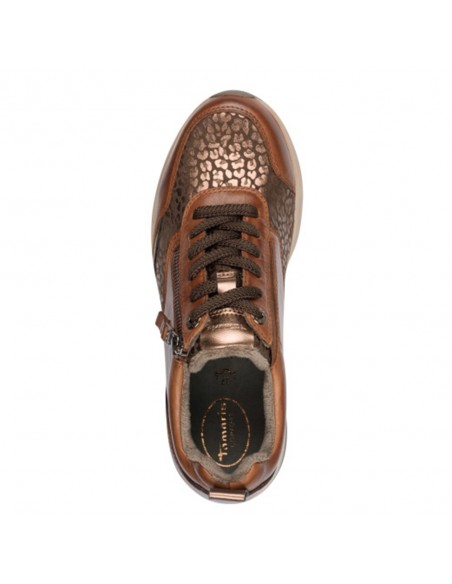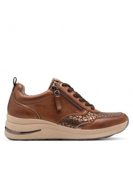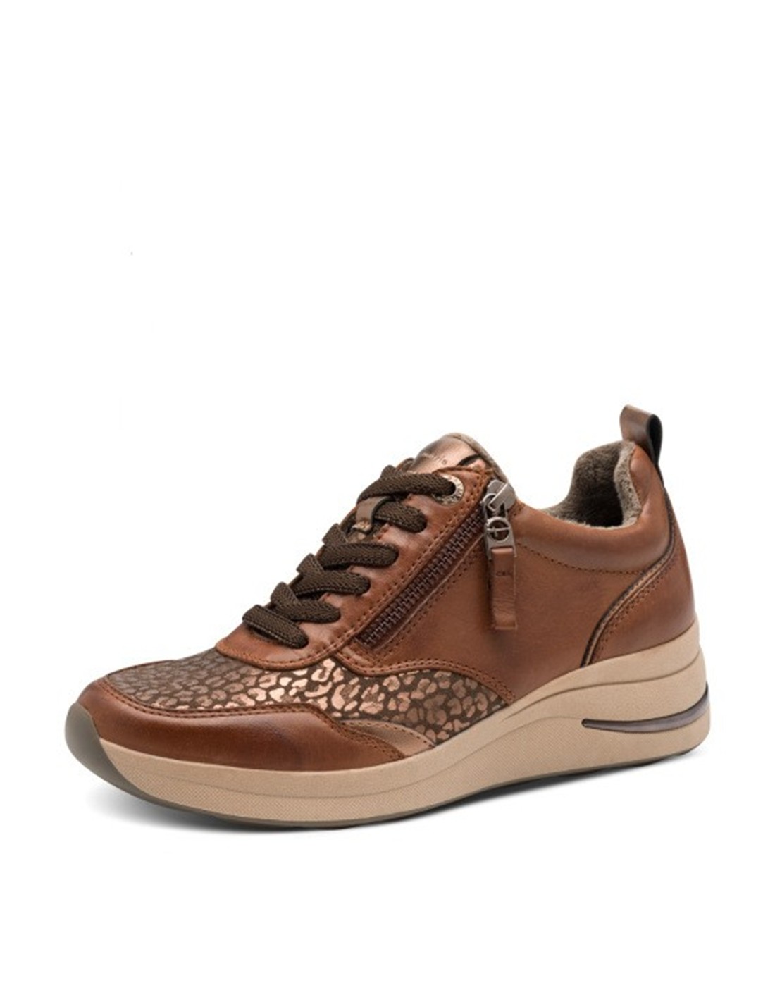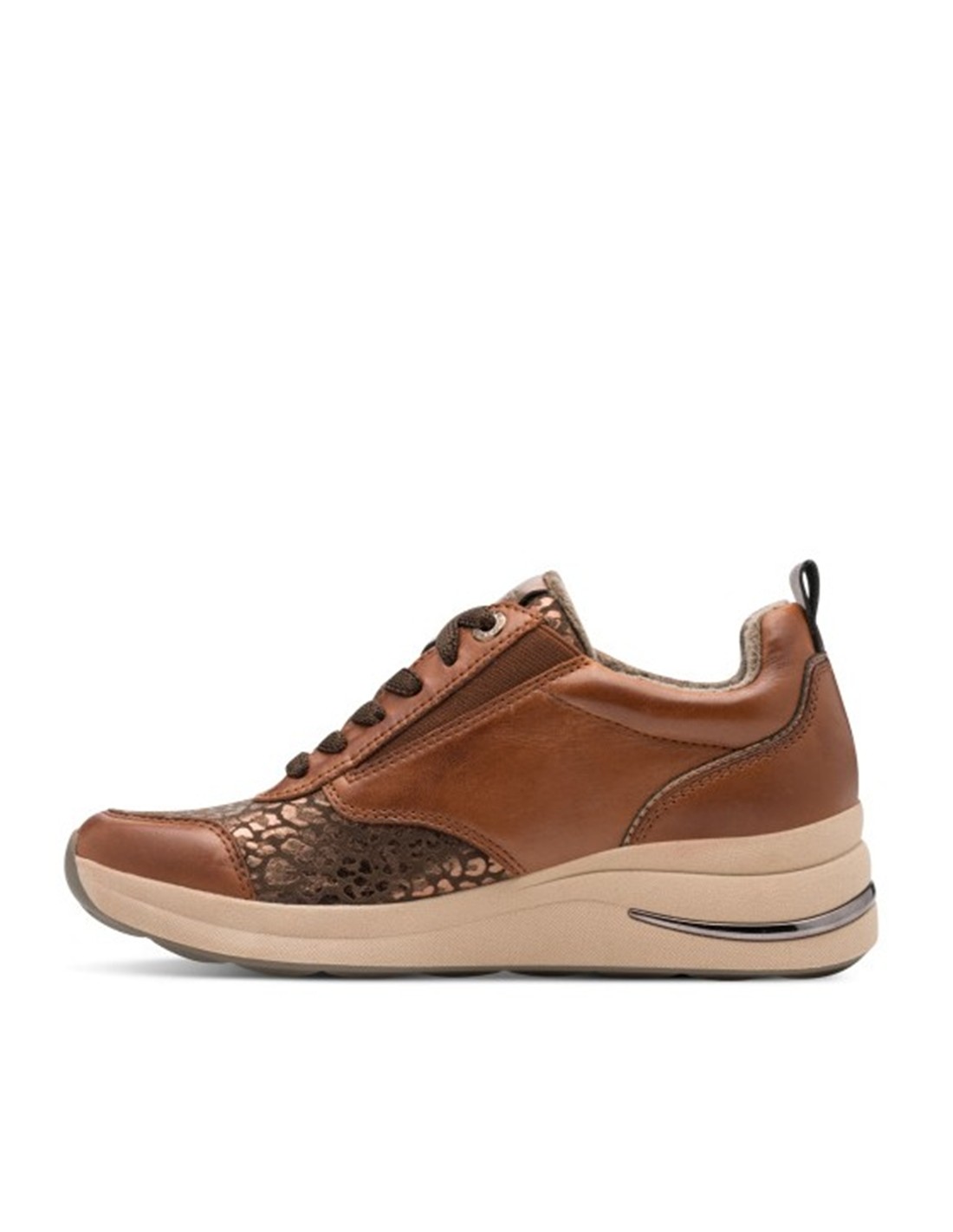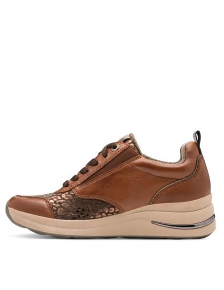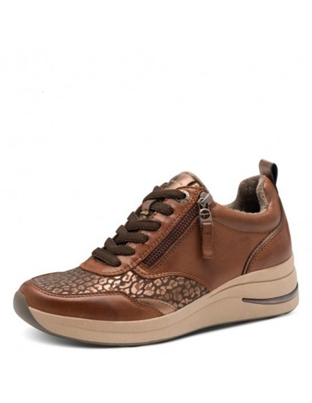 Descripción: Deportiva mujer 83714 de TAMARIS CONFORT en piel y licra adaptable tono cuero. Plantilla anatómica extraible. Ajuste cremallera y cordones. Cómodo piso con tecnología TFlow amortiguadora