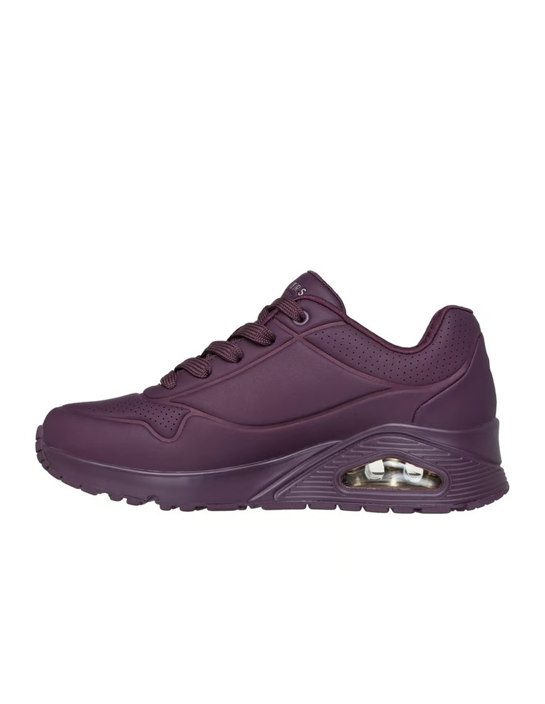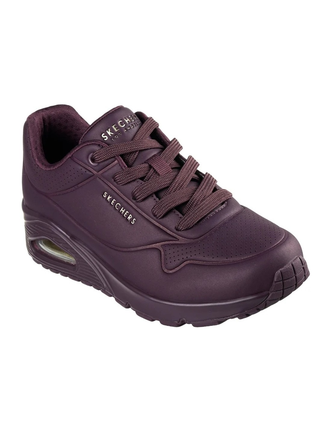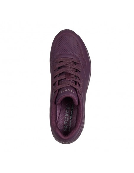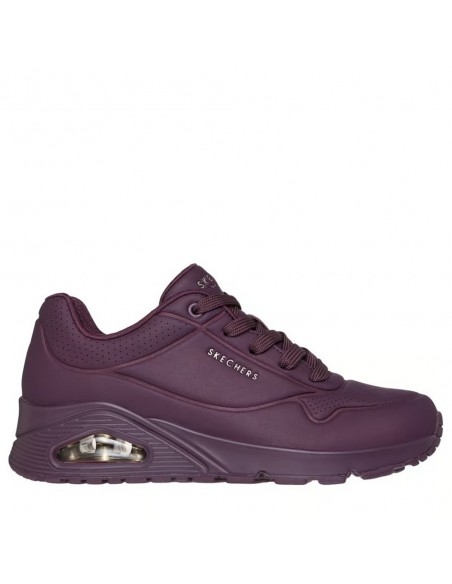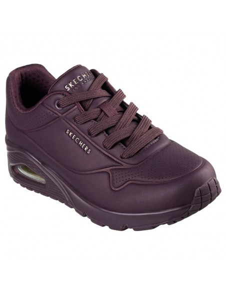 Descripción: Zapatillas urbanas de mujer Skechers UNO STAND ON AIR con entresuela de aire que proporciona amortiguación perfecta. Plantilla SKECHERS Air-Cooled Memory Foam™ En suave tejdo burdeos con textura de piel y perforaciones. Piso al tono.