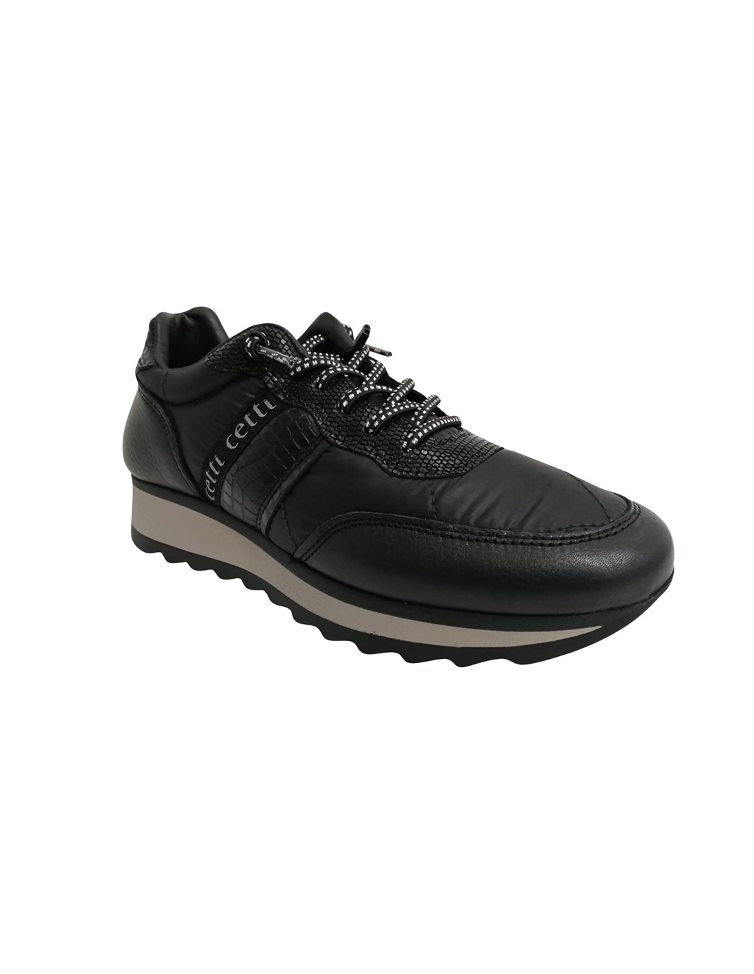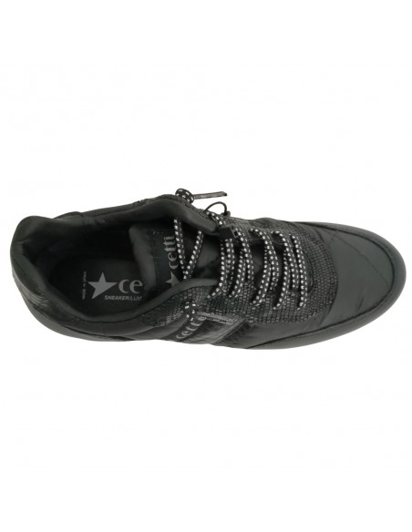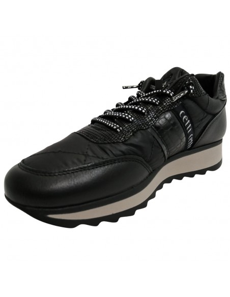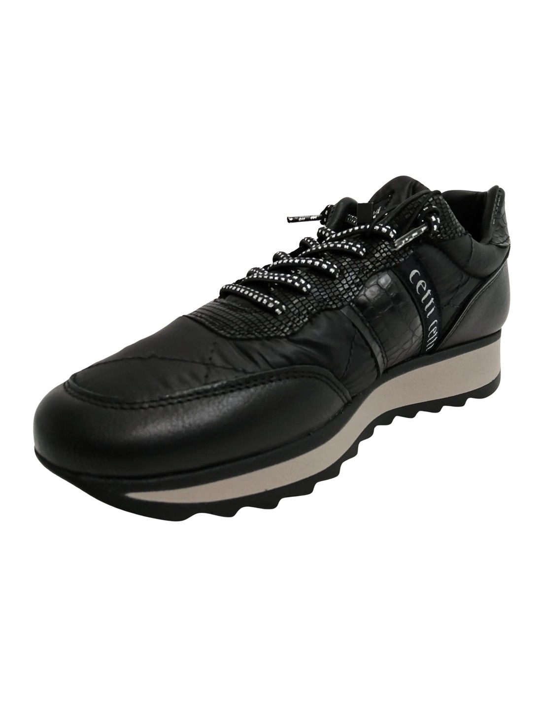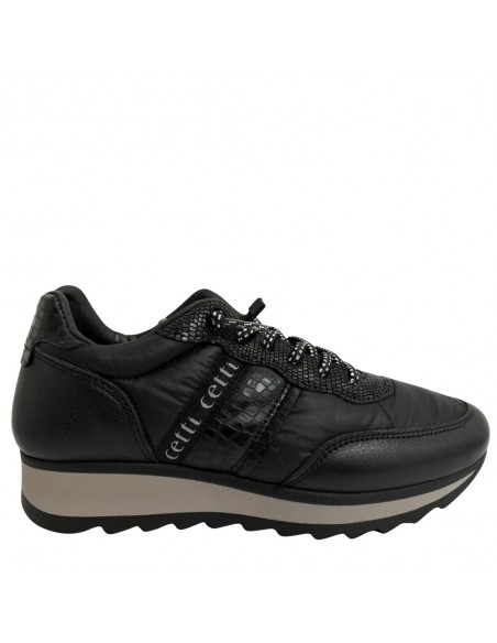 Descripción: Zapatilla mujer 849 de CETTI en naylon acolchado y refuerzos en piel lisa negra con detalle piel texturizada. Cordones elásticos. Plantilla extraible acolchada. Ligero piso bicolor con patín dentado antideslizante.