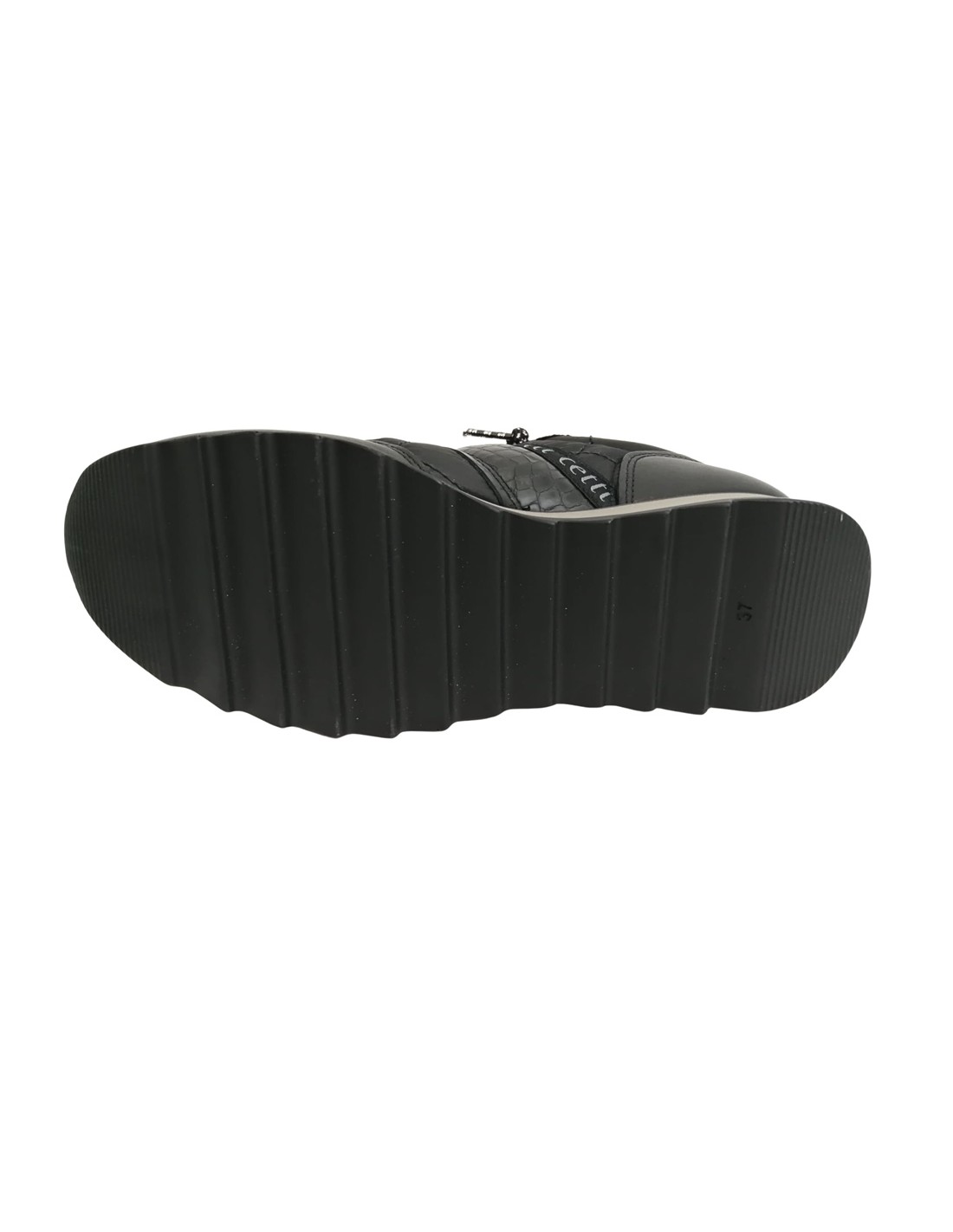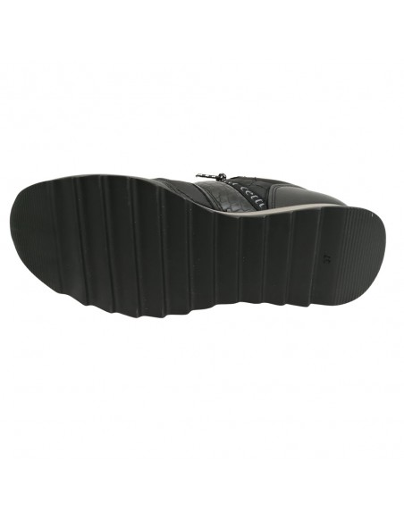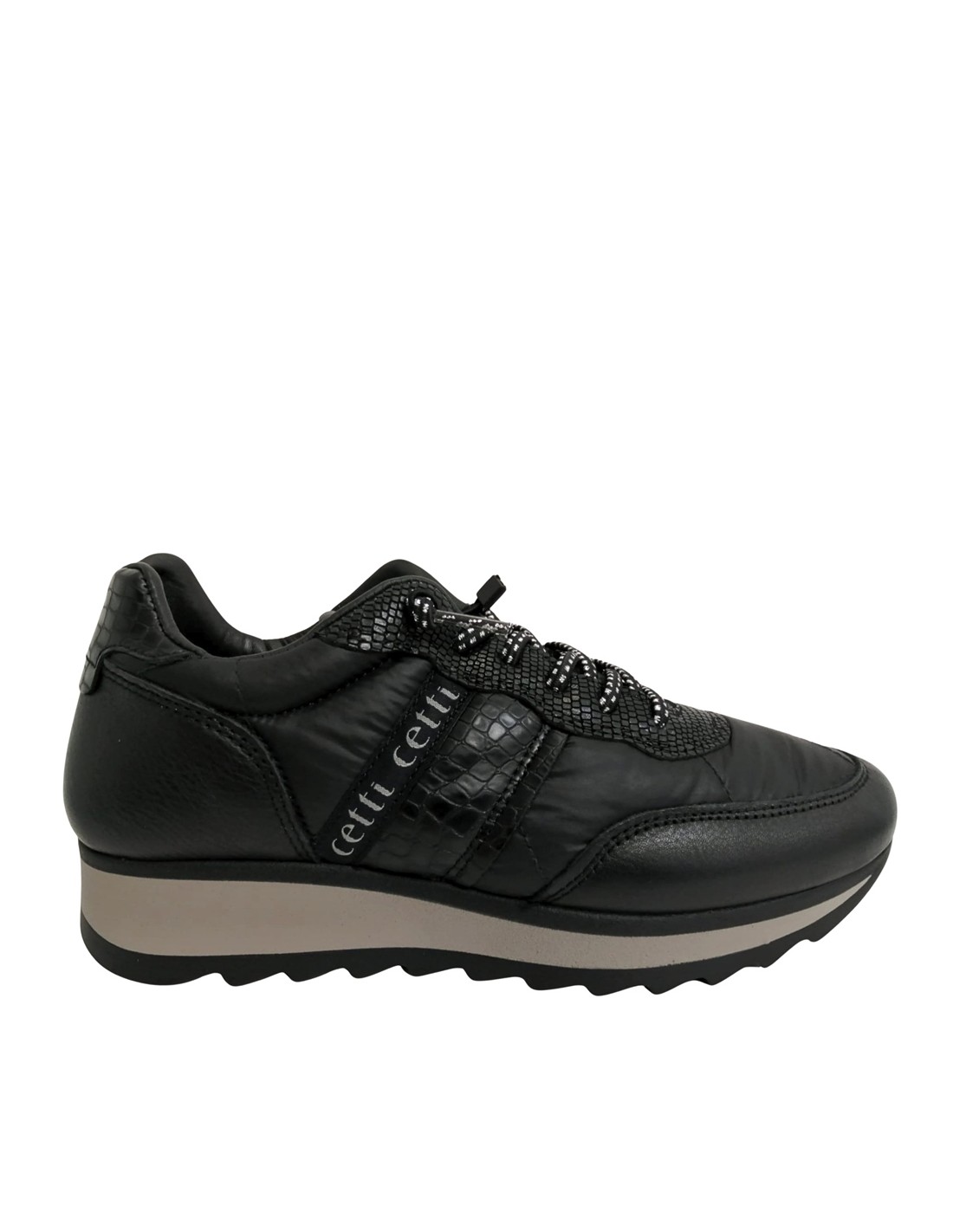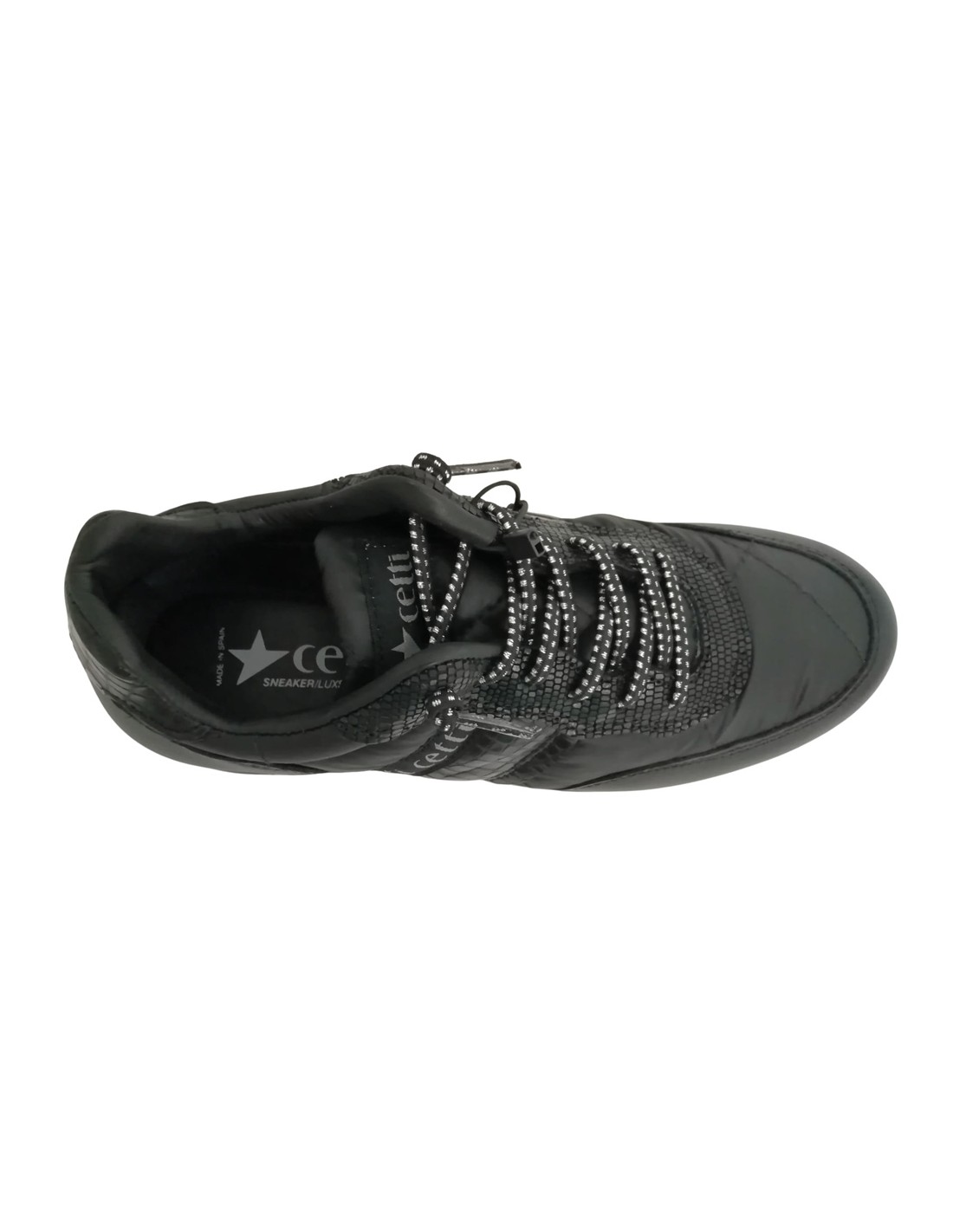 Descripción: Zapatilla mujer 849 de CETTI en naylon acolchado y refuerzos en piel lisa negra con detalle piel texturizada. Cordones elásticos. Plantilla extraible acolchada. Ligero piso bicolor con patín dentado antideslizante.