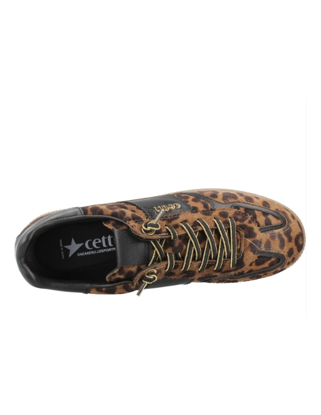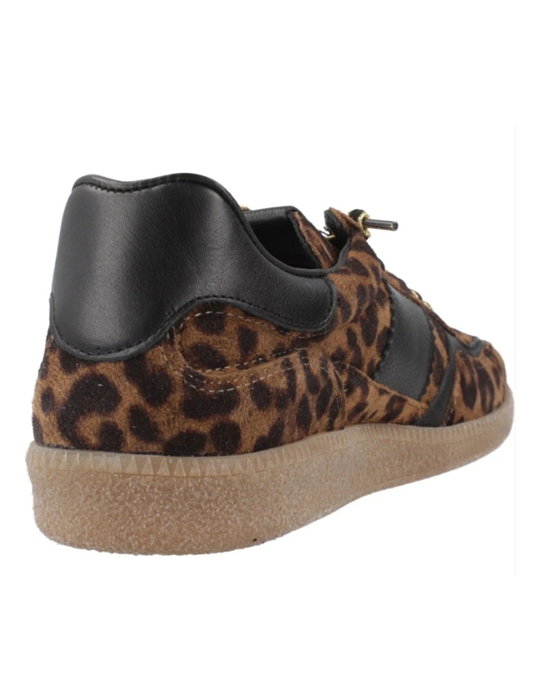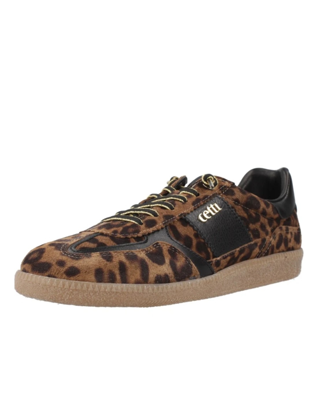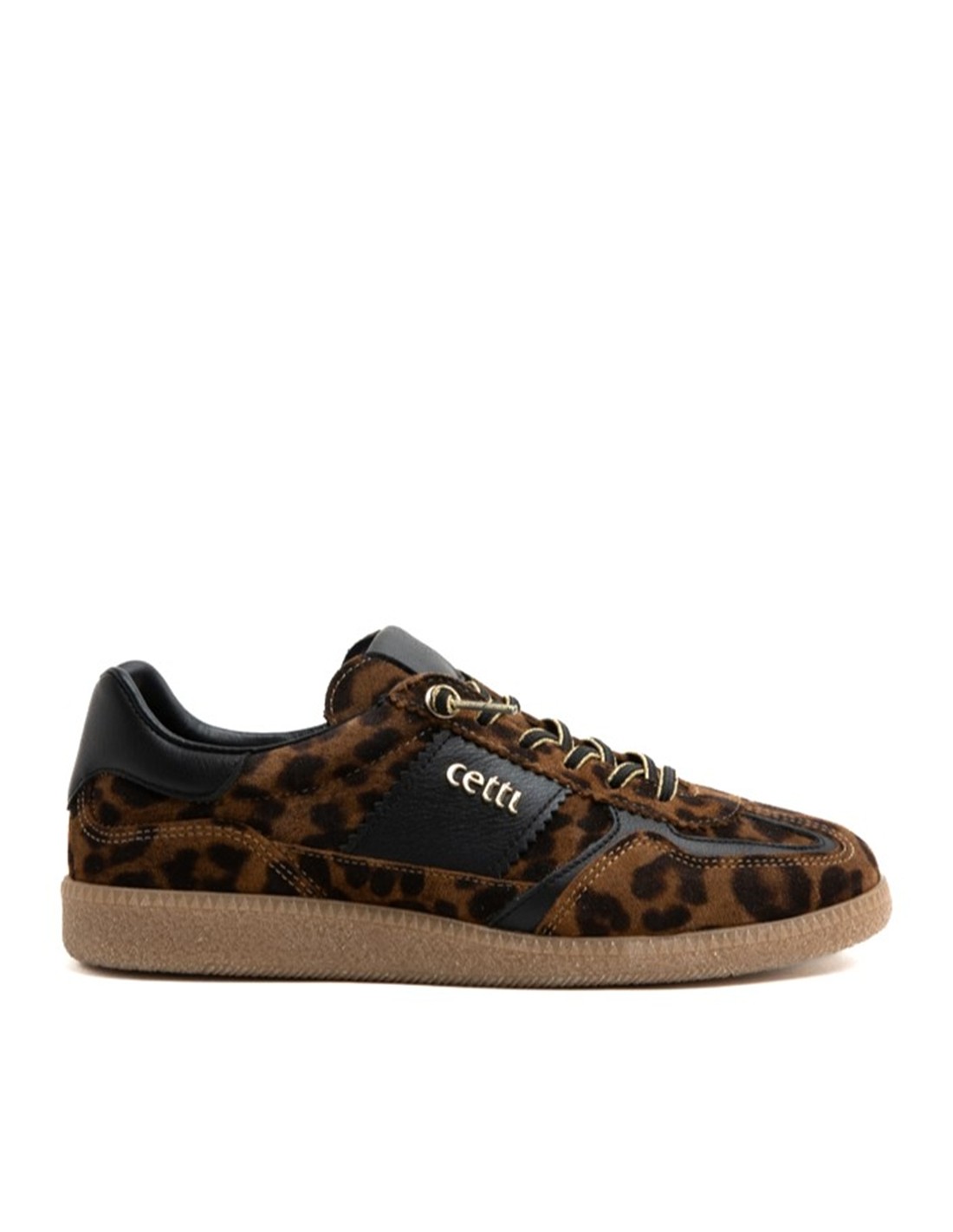 Descripción: Zapatilla mujer 1395 de CETTI en piel con estampado leopardo y detalles negros. Cordones elásticos. Plantilla extraible acolchada. Ligero piso tono caramelo antideslizante.