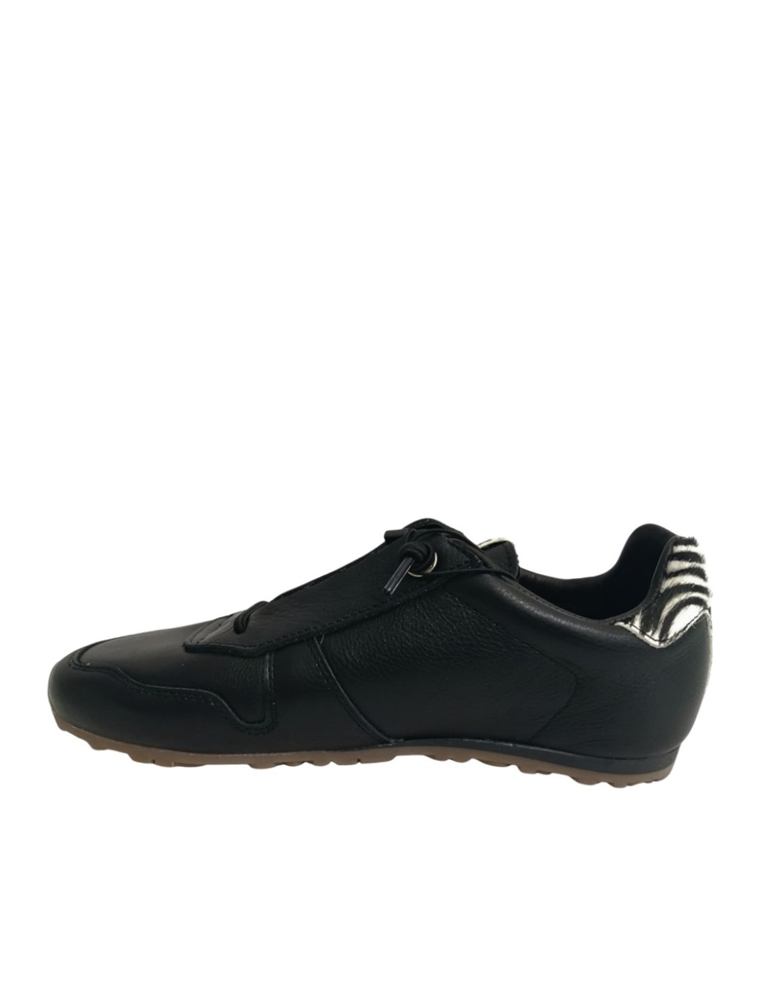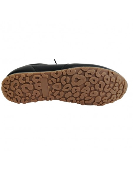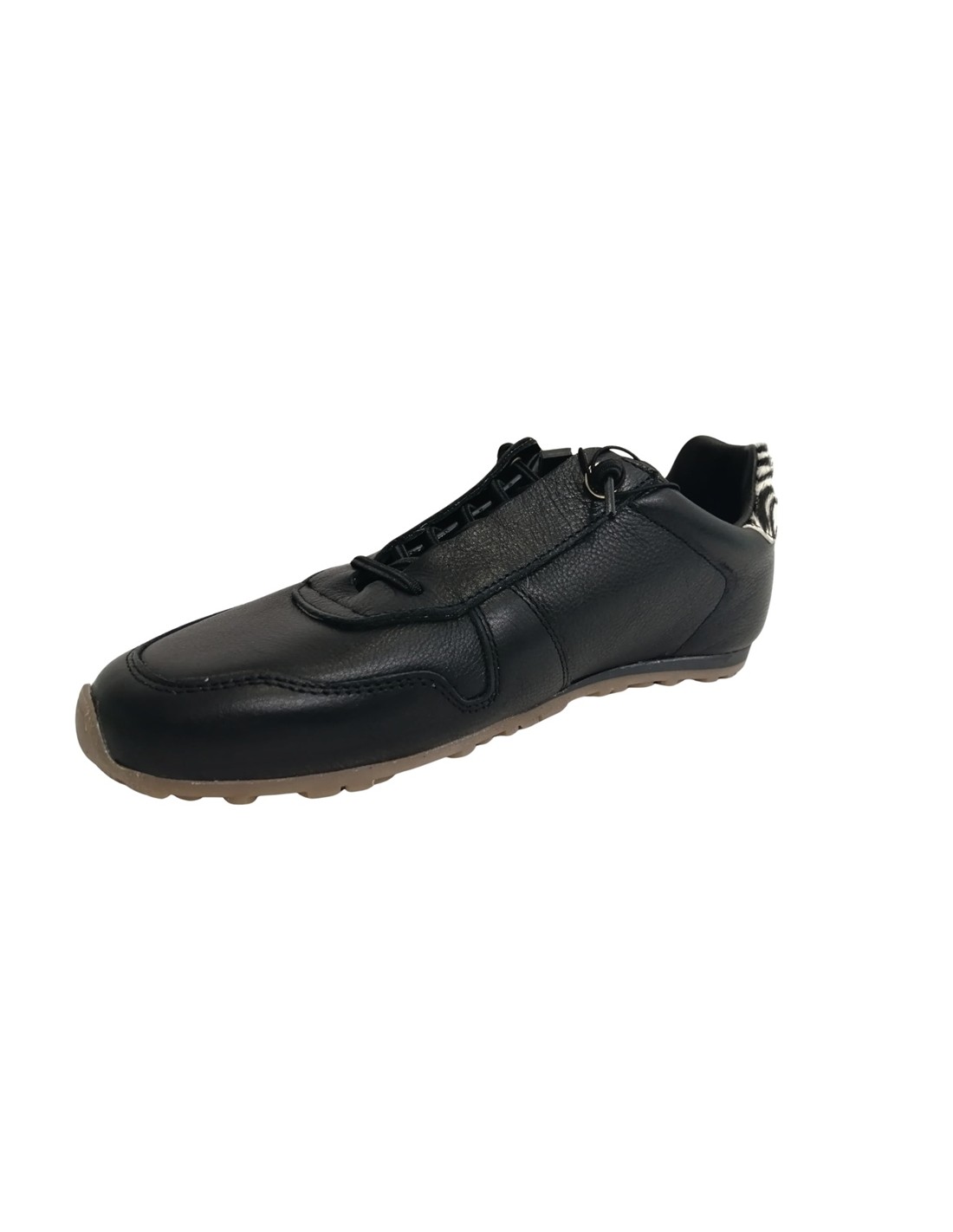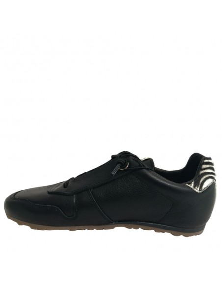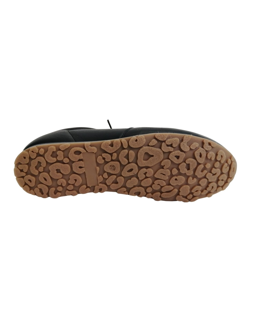 Descripción: Zapatilla mujer 1379 de CETTI en suave piel negra con detalle animal print. Cordones elásticos. Plantilla extraible acolchada. Ligera cuña con piso flexibe dentado en tono caramelo.