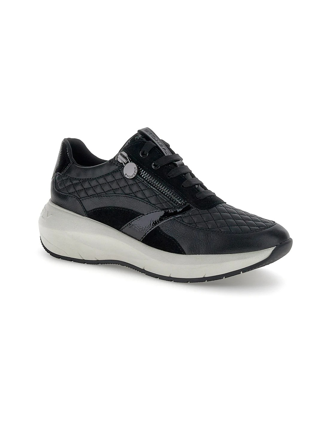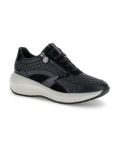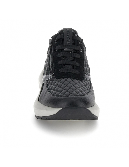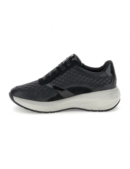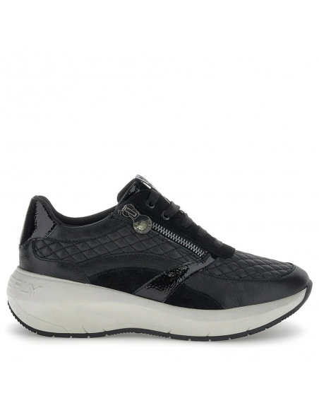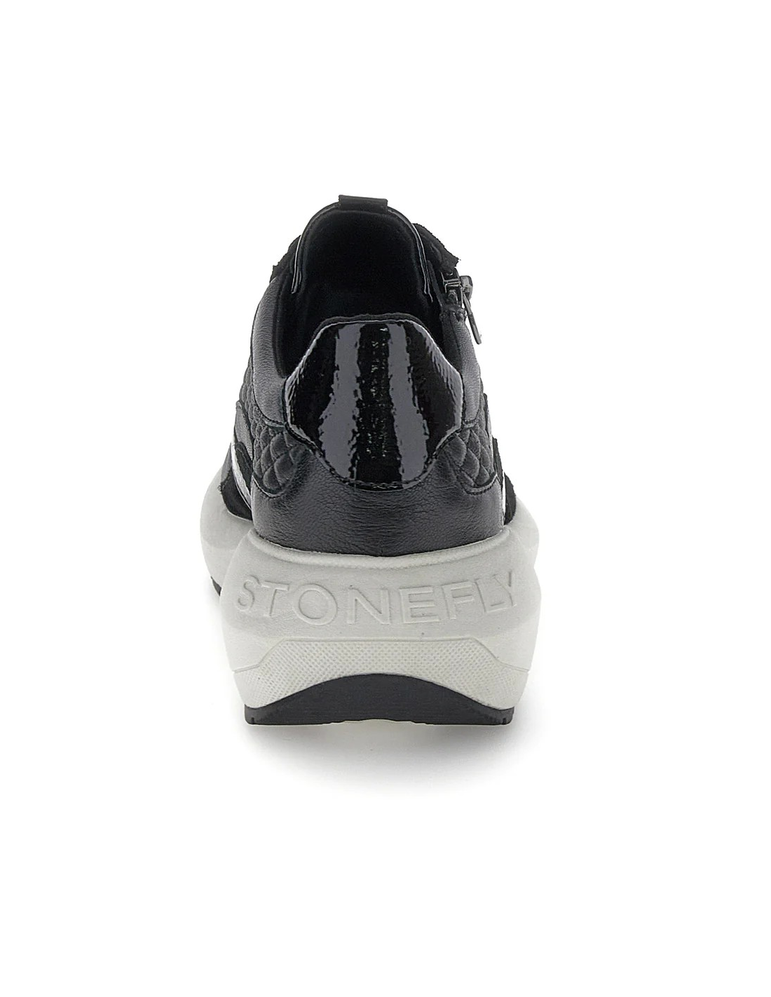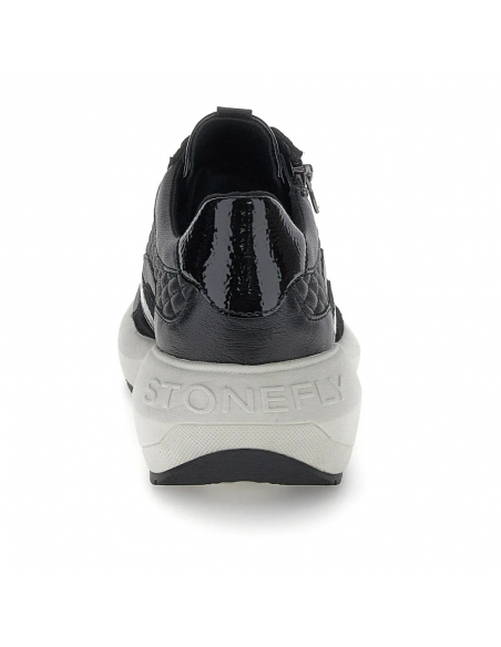 Descripción: Cómoda y elegante zapatilla mujer de Stonefly TWINS-2 en suave piel negra texturizada y detalles de charol. Ajuste con cremallera. Ligera cuña con tecnología BLUSOFT con óptima amortiguación.
