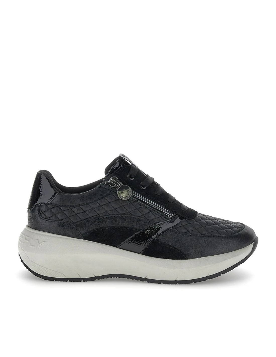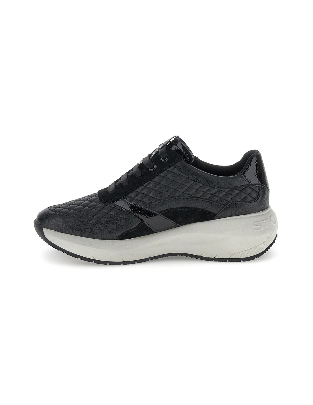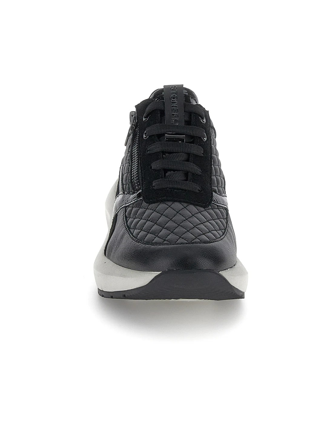 Descripción: Cómoda y elegante zapatilla mujer de Stonefly TWINS-2 en suave piel negra texturizada y detalles de charol. Ajuste con cremallera. Ligera cuña con tecnología BLUSOFT con óptima amortiguación.