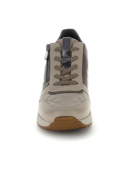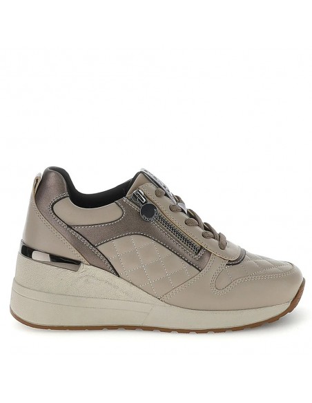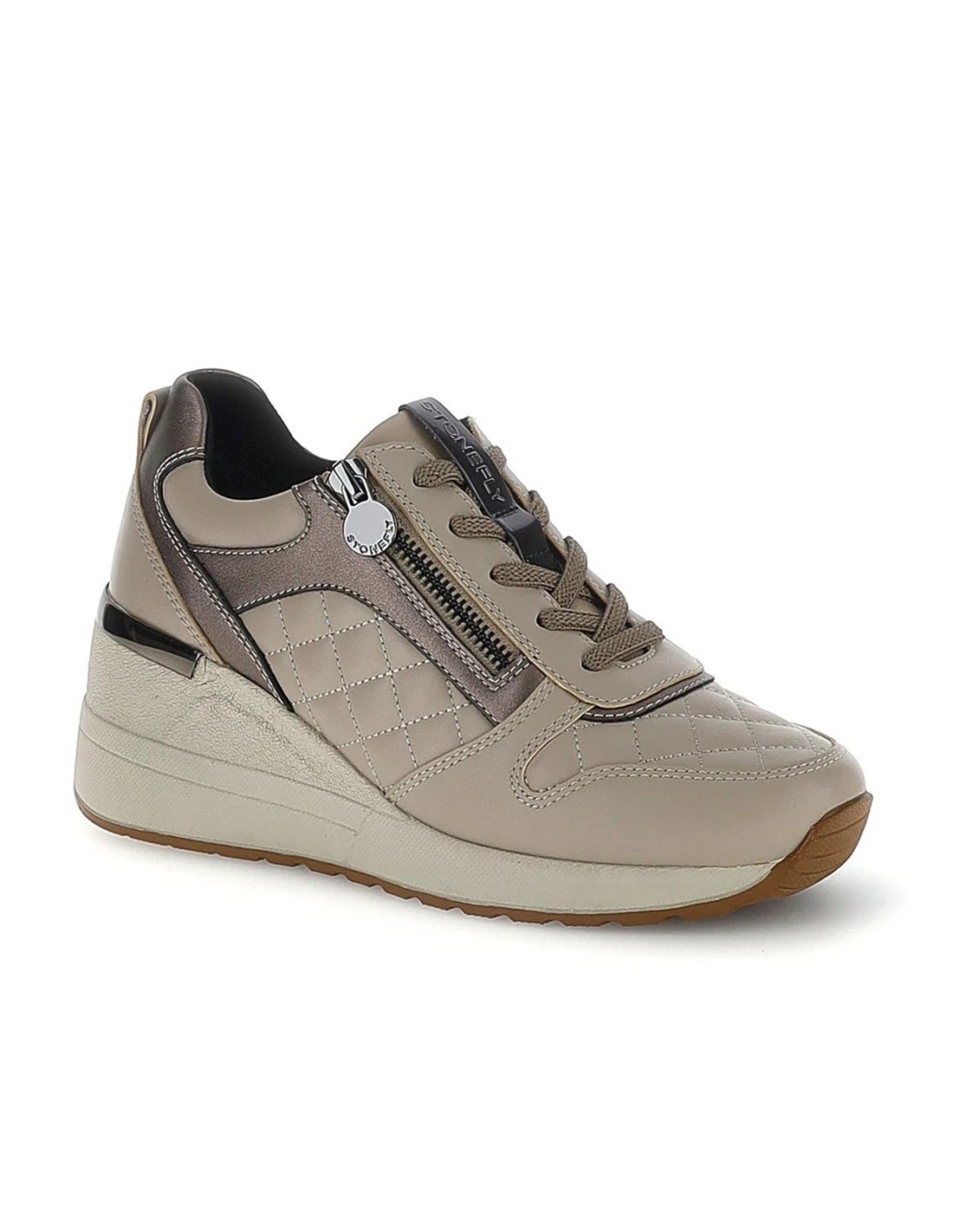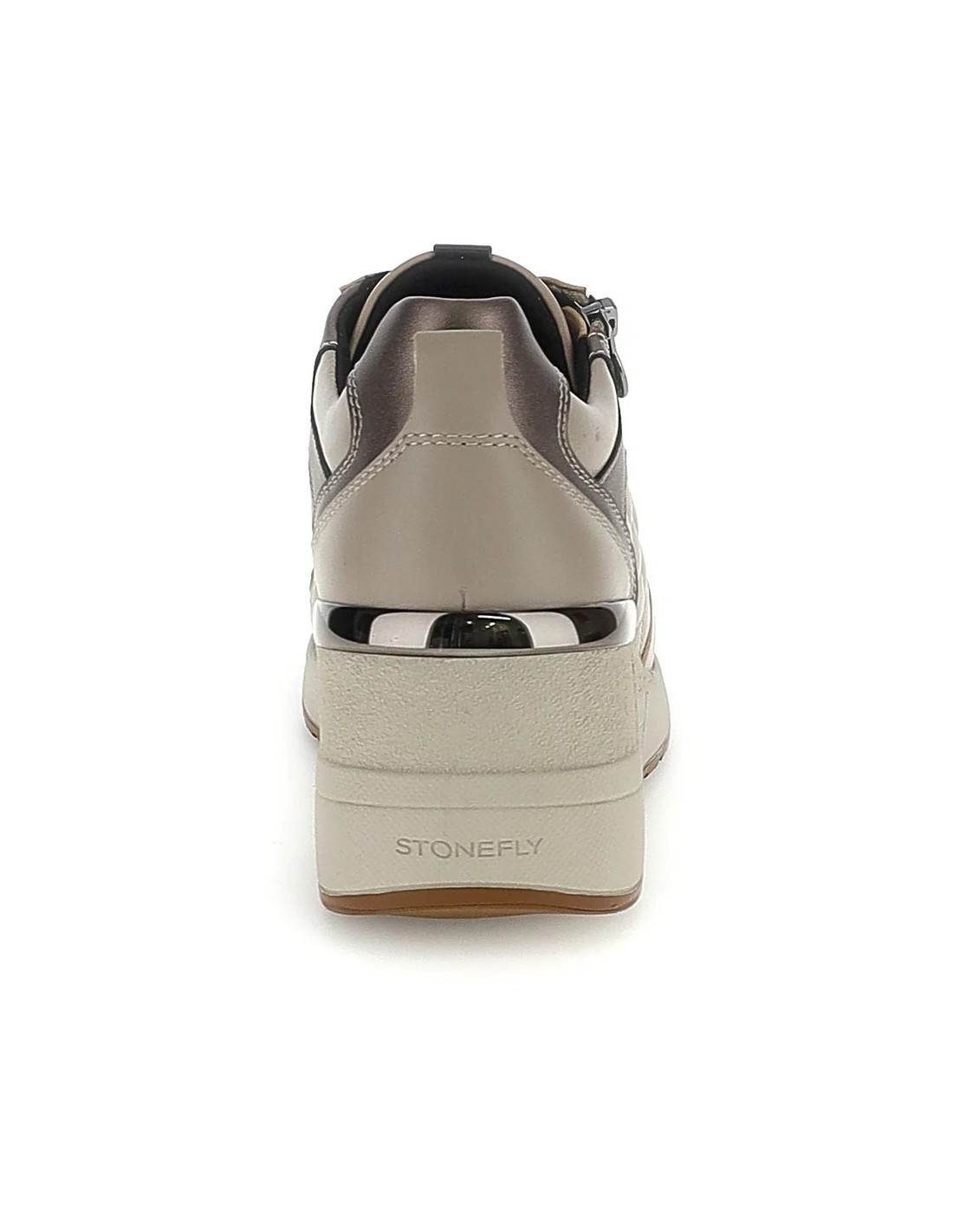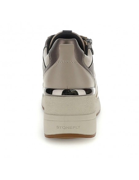 Descripción: Cómoda y elegante zapatilla mujer de Stonefly MINA-1 en suave piel texturizada beig y detalles piel metalizada. Ajuste con cremallera. Ligera cuña con tecnología BLUSOFT amortiguadora.