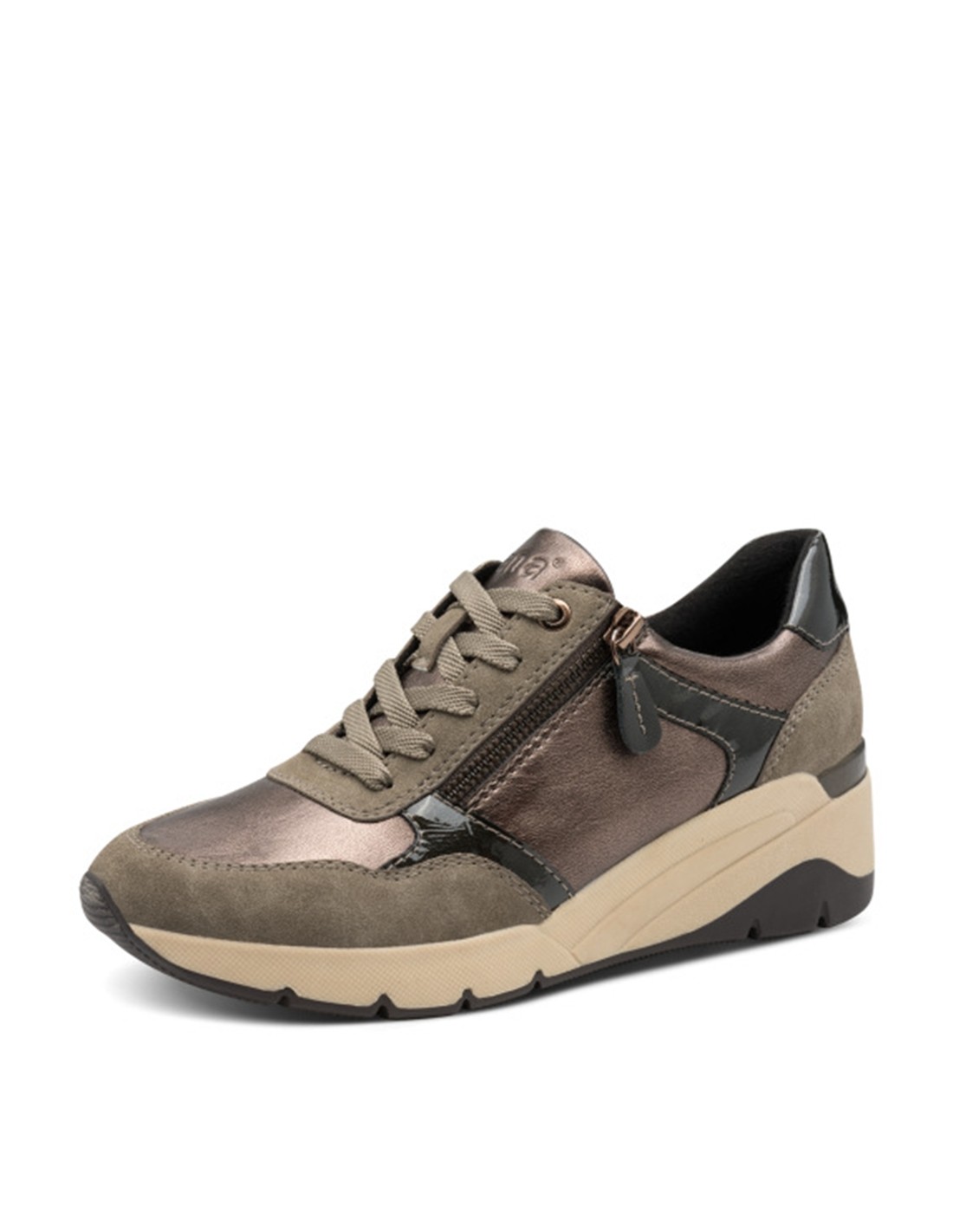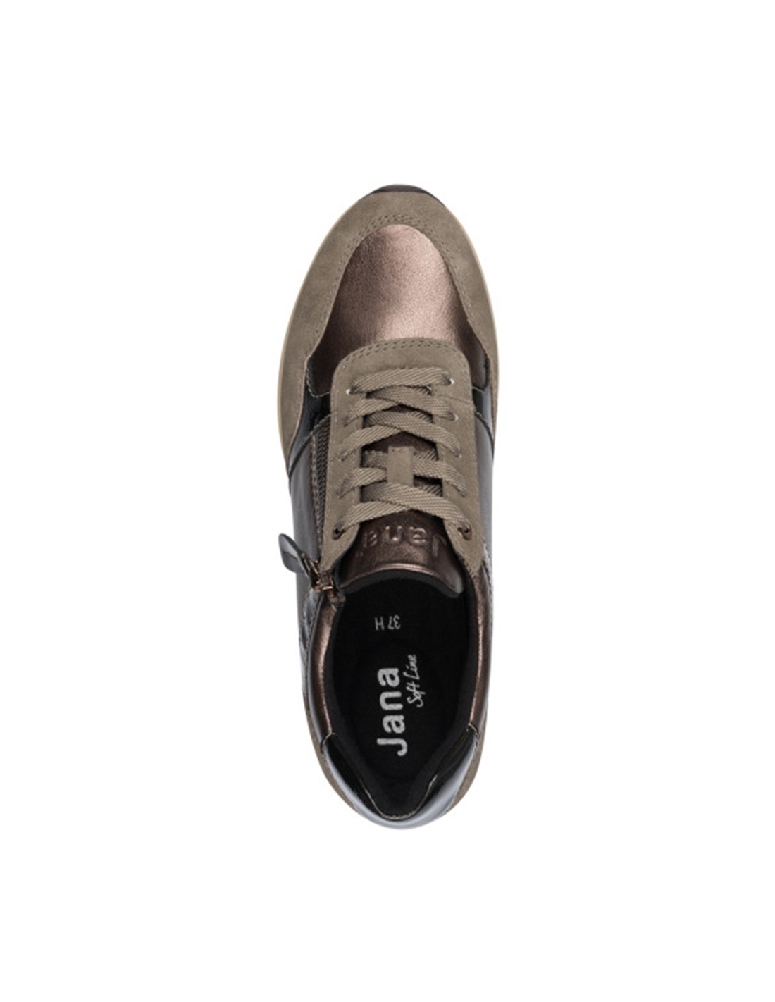 Descripción: Zapatilla vegano Jana 23763 taupe metalizado, con ajuste de cremallera y cordón, plantilla extraíble Cuña ligera y antideslizante para máxima comodidad y estilo.