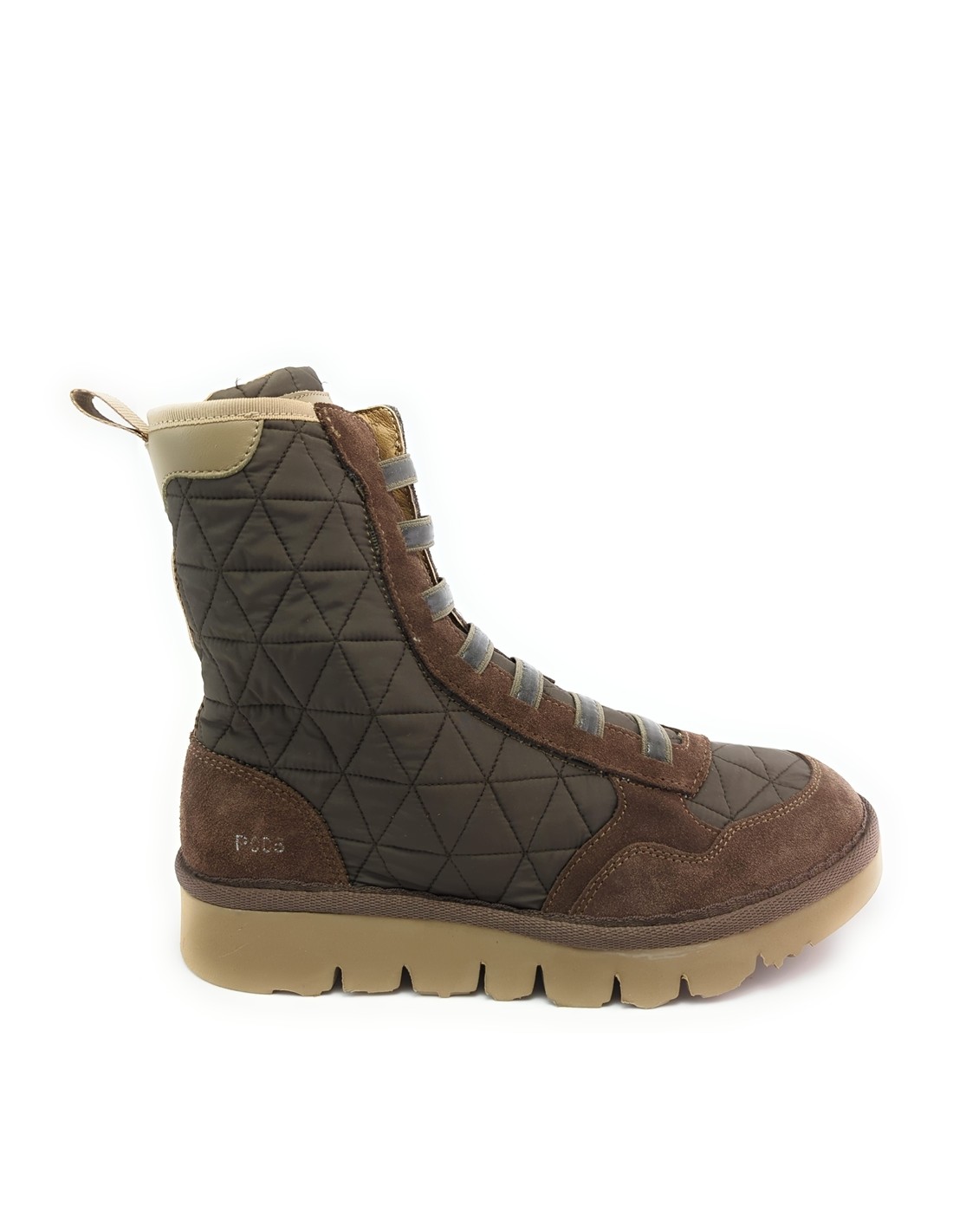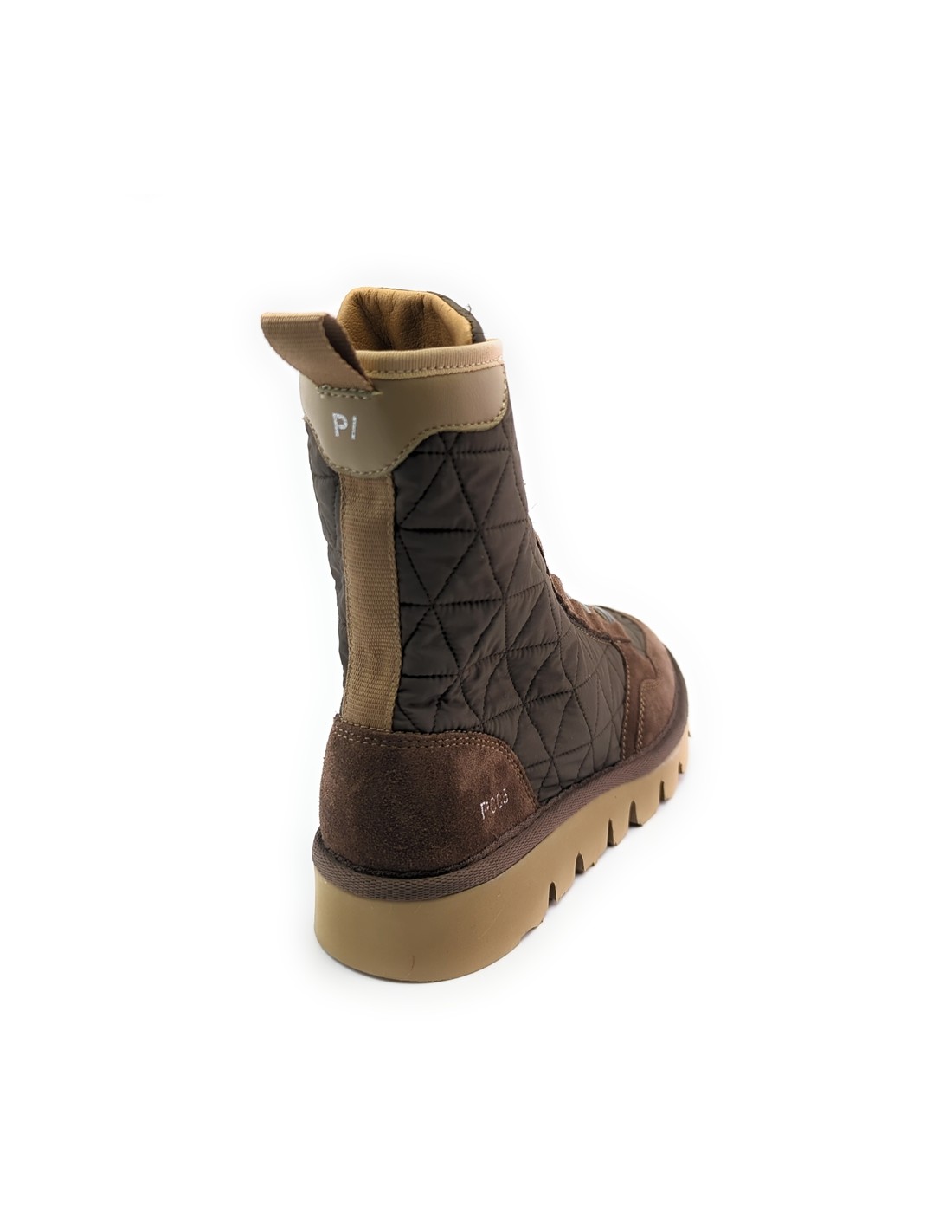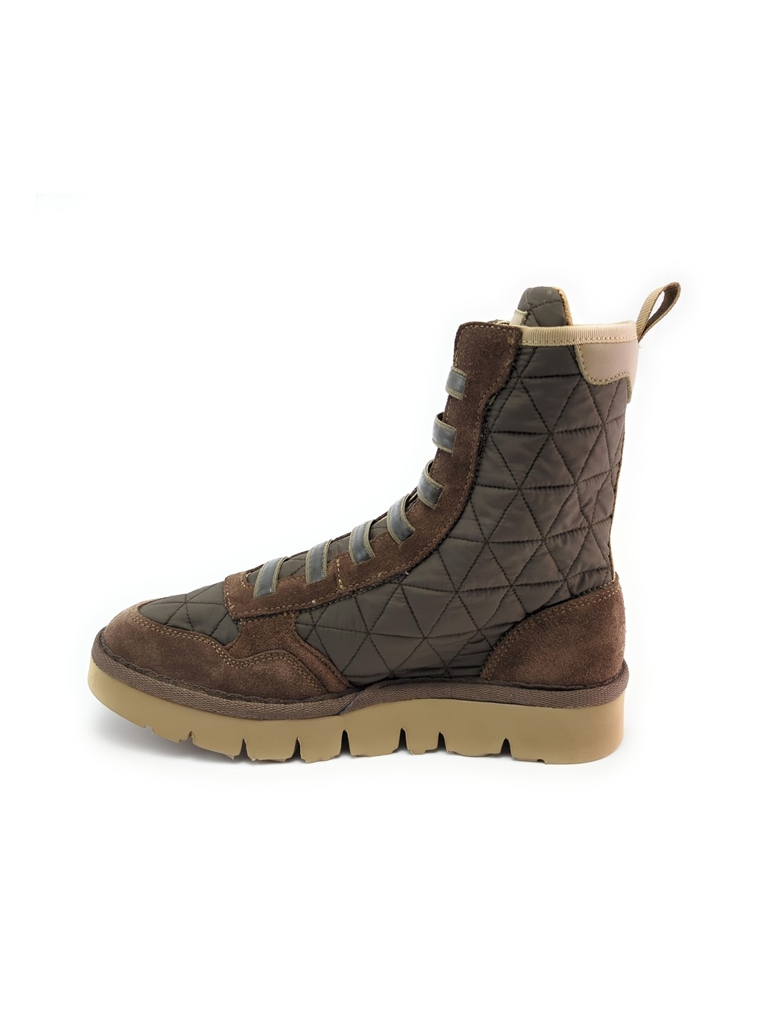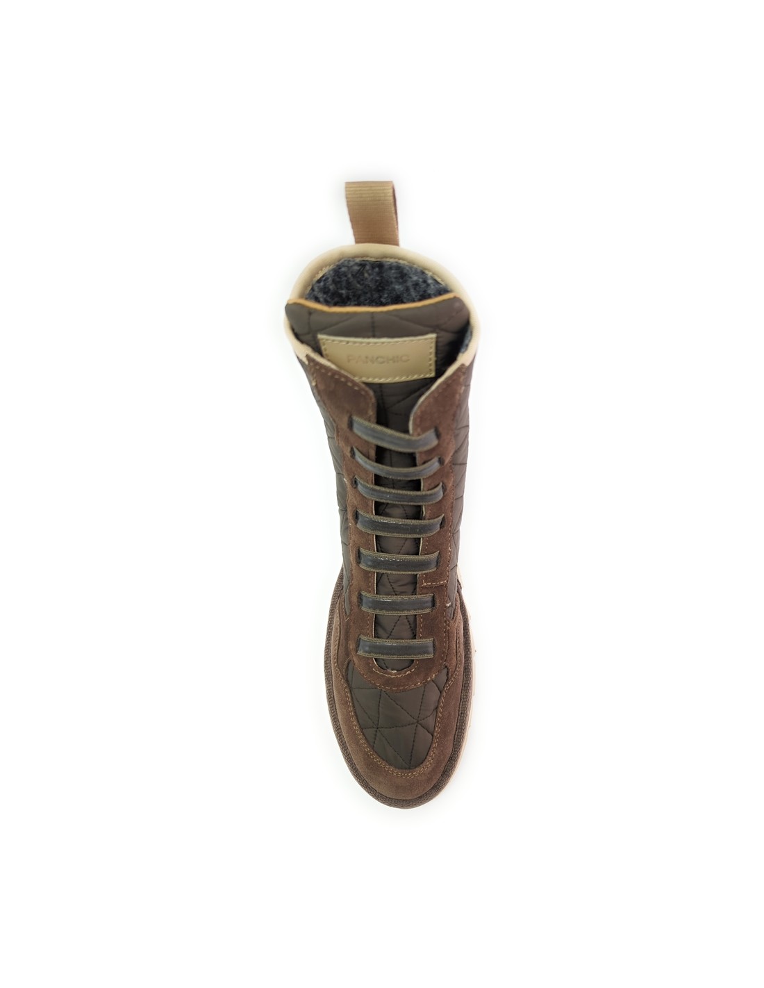 Descripción: Moda italiana artesana para mujer de PANCHIC, bota deportiva COMBAT de la línea P05, con naylon acolchado marrón, refuerzos en piel y forro cálido. Cordones elásticos. Cómodo piso ligero y flexible.
