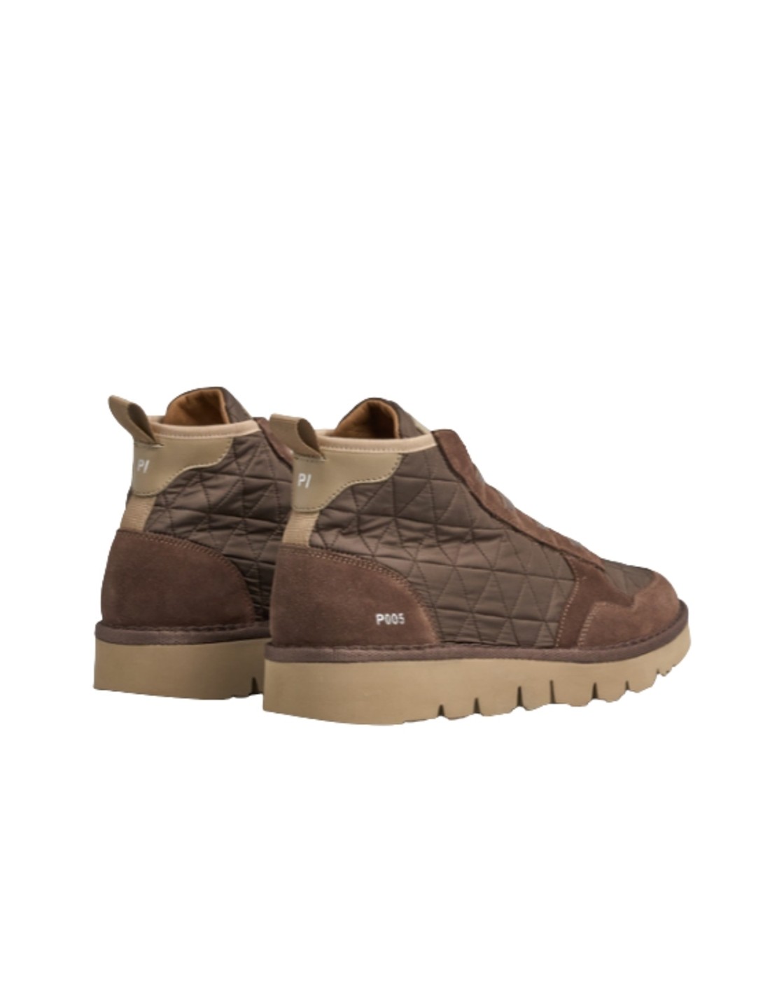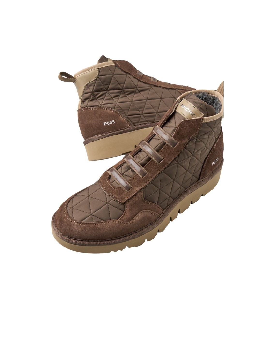 Descripción: Moda italiana artesana para mujer de PANCHIC, botín deportivo de la línea P05, con naylon acolchado marrón, refuerzos en piel y forro cálido. Cordones elásticos. Cómodo piso ligero y flexible.