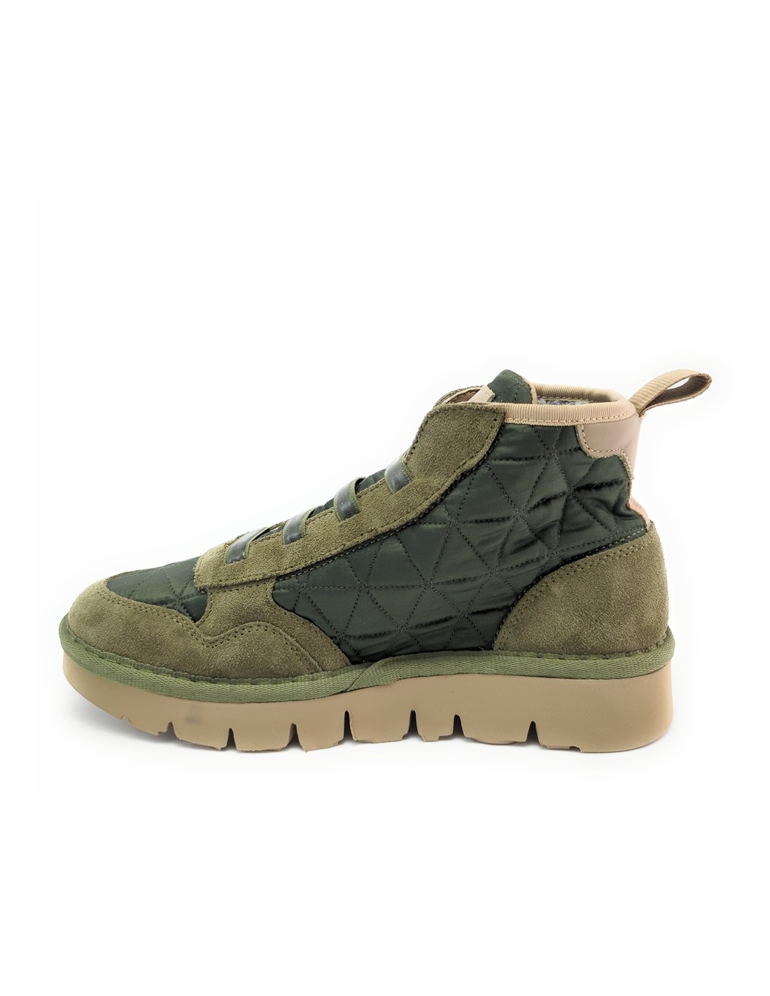 Descripción: Zapatilla abotinada italiana de fabricación artesana para hombre de Panchic de la línea P05 en suave naylon acolchado kaki, refuerzos en serraje y forro cálido. Cordones elásticos. Cómodo piso ligero y flexible.