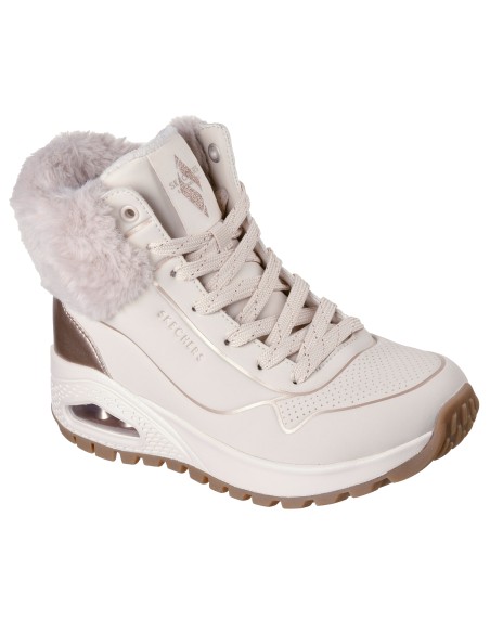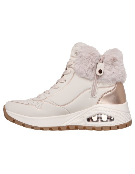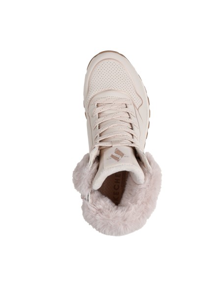 Descripción: Zapatilla urbana abotinada de mujer Skechers UNO RUGGED - FALL SHIMMER con entresuela amortiguadora. En suave tejido con textura de piel beig y talle cuello de pelo. Plantilla Air Coled Memory Foam