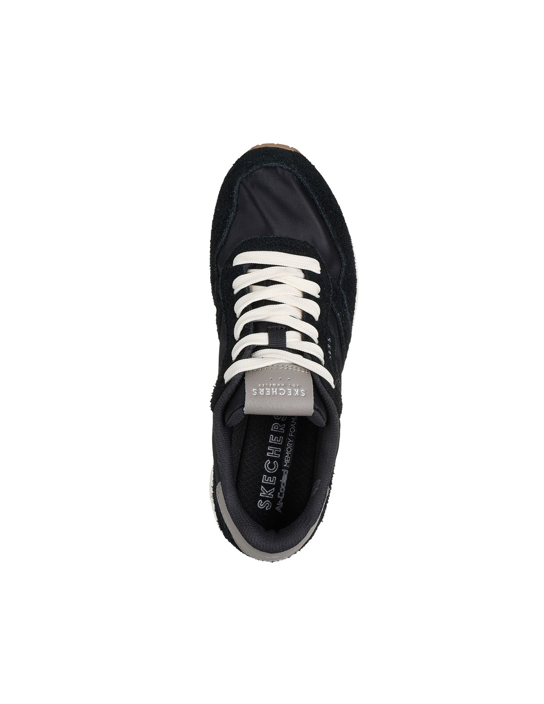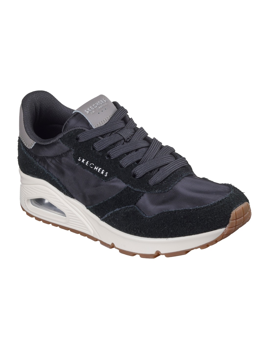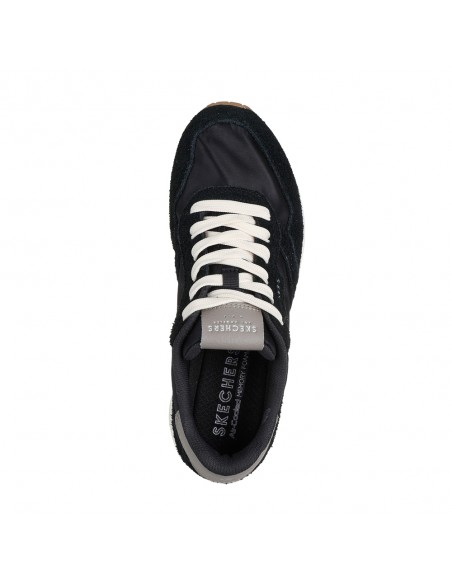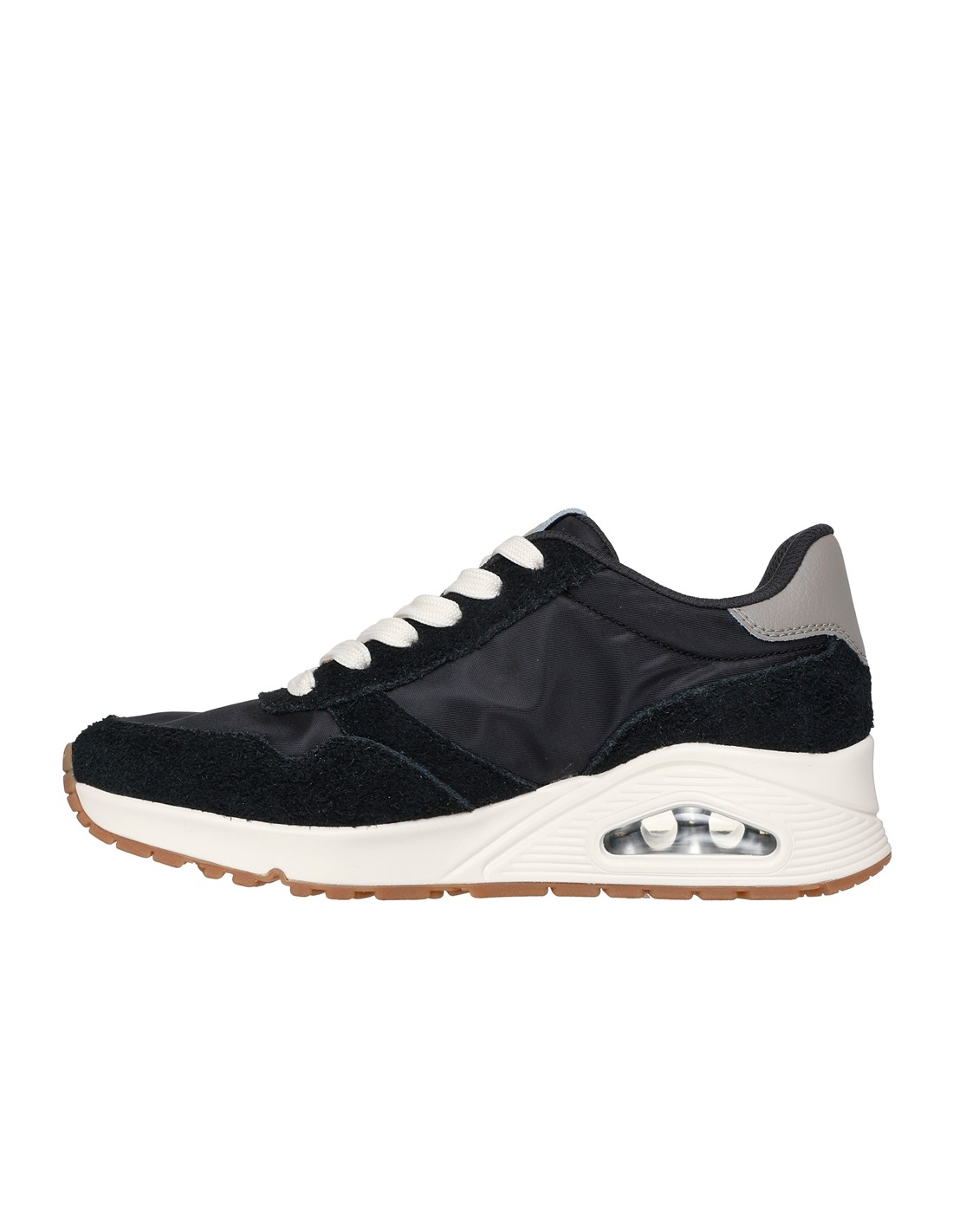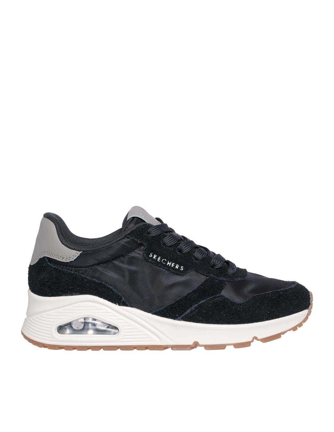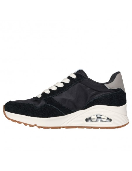 Descripción: Zapatilla mujer estilo running clásico Skechers UNO vintage ON AIR DAYZ de suave naylon negro con refuerzos en serraje. Plantilla Air Coled Memory Foam acolchada. Suela con cámara de aire visible amortiguadora.