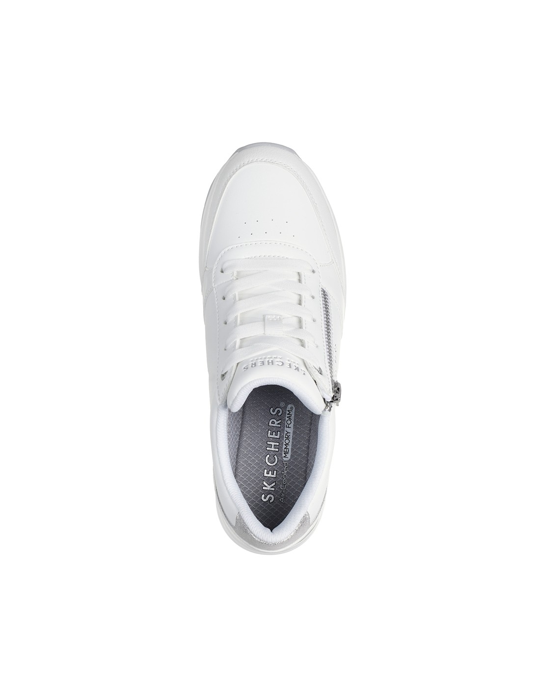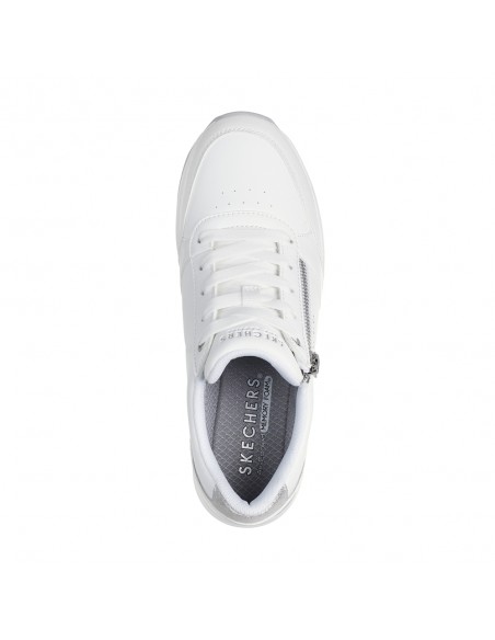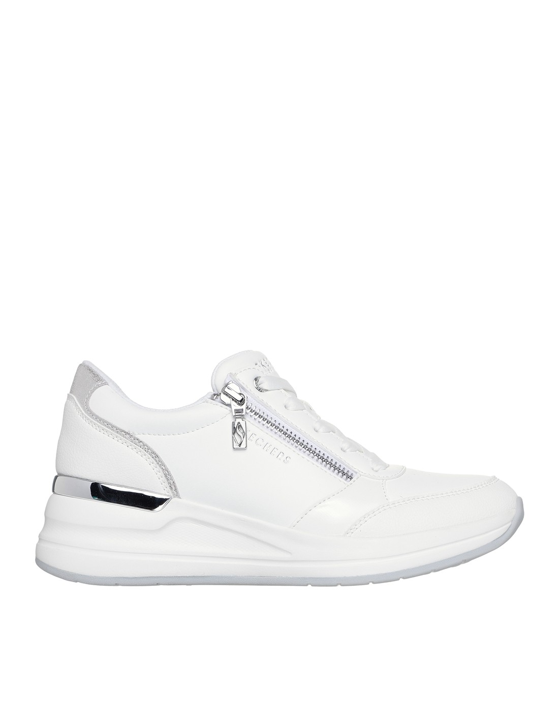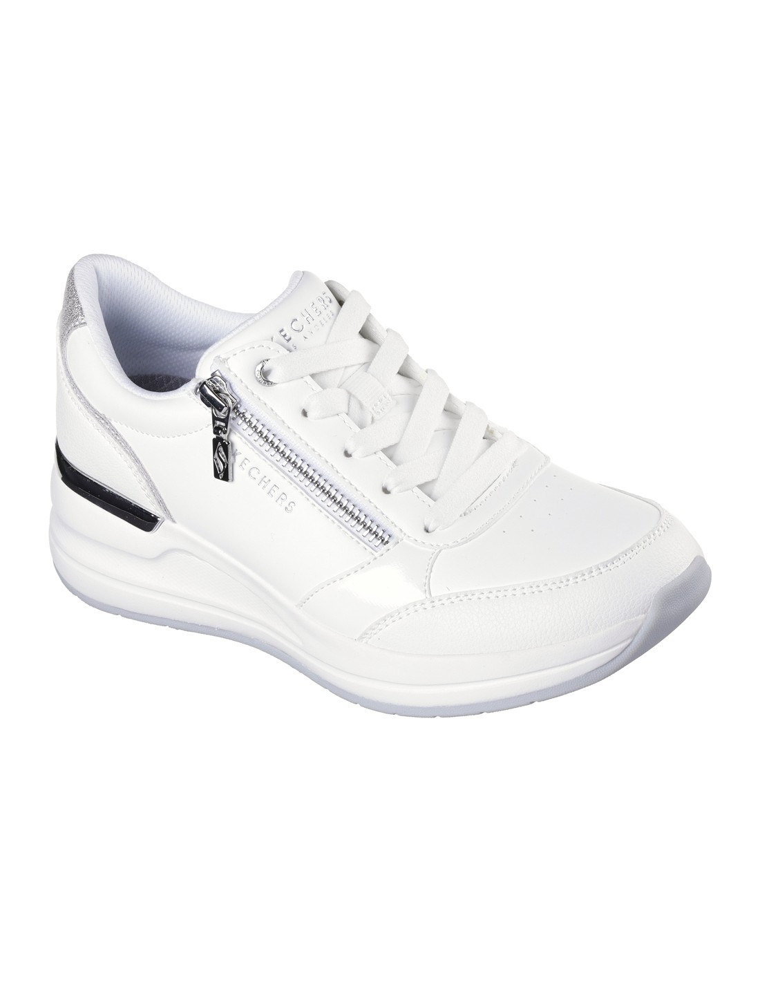 Descripción: Zapatilla deportiva mujer BILLION 2 HIGH-END en tejido blanco aspecto piel. Ajuste cordones y cremallera. Plantilla de confort SKECHERS Air Cooled Memory Foam® Cómoda y elegante cuña blanca con patín de goma antideslizante.