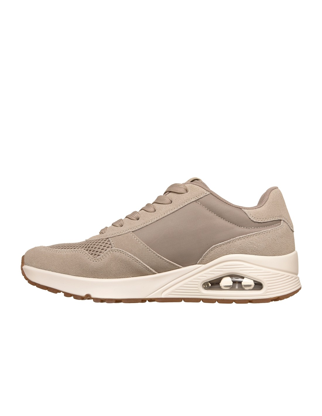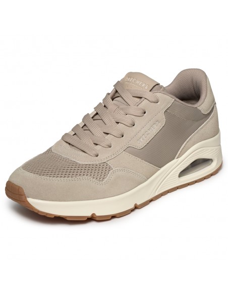 Descripción: Zapatilla hombre Skechers UNO ON AIR VINAGE de suave y cómodo tejido taupe con refuerzos. Plantilla Air Coled Memory Foam. Amortiguación con Skech AIR® visible. Piso antideslizante. Cómodo todo el día.