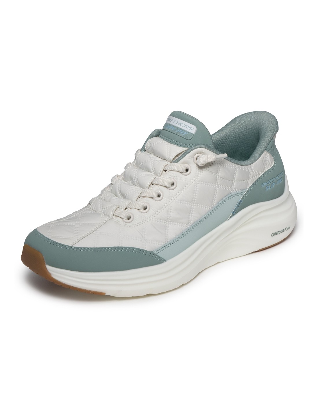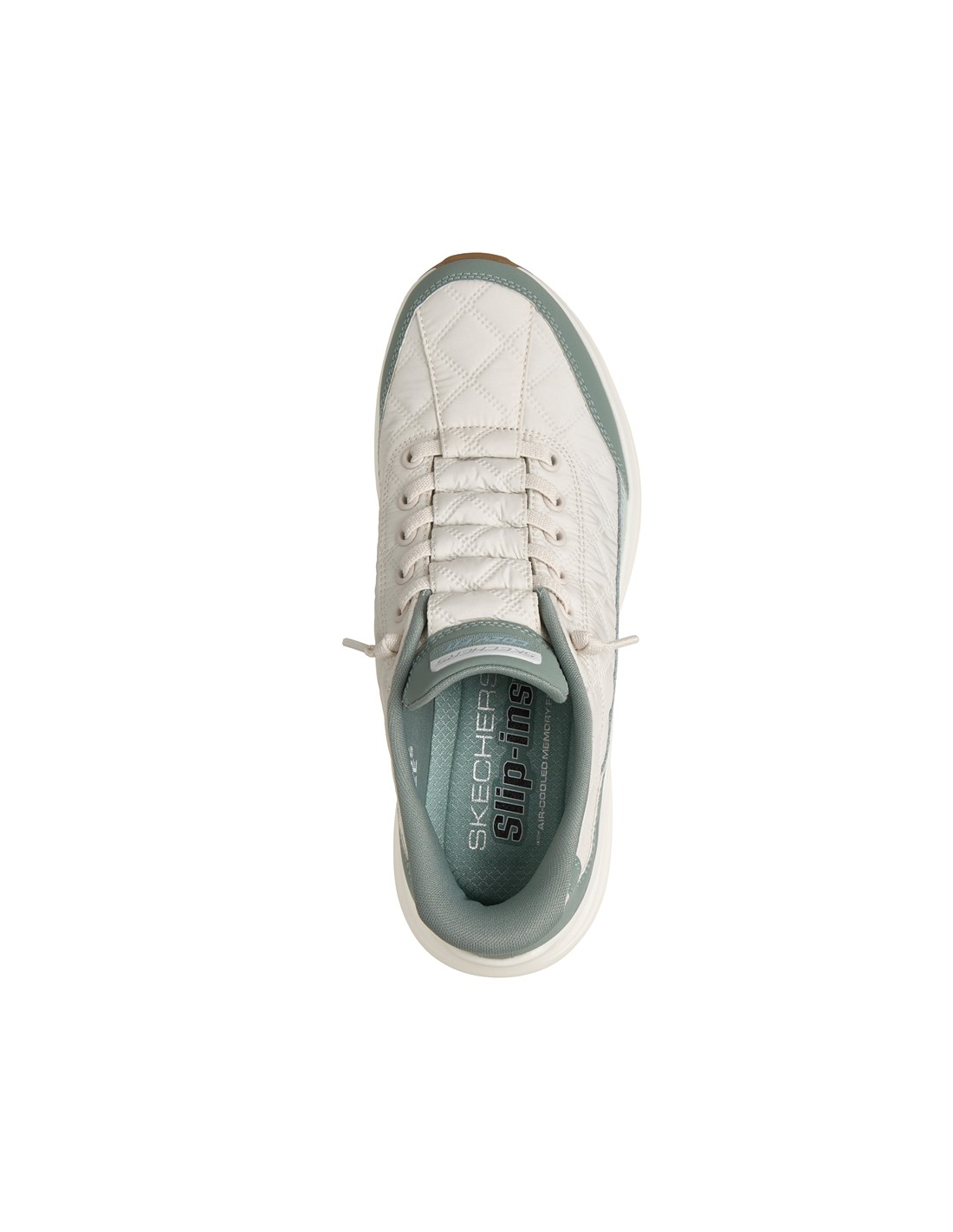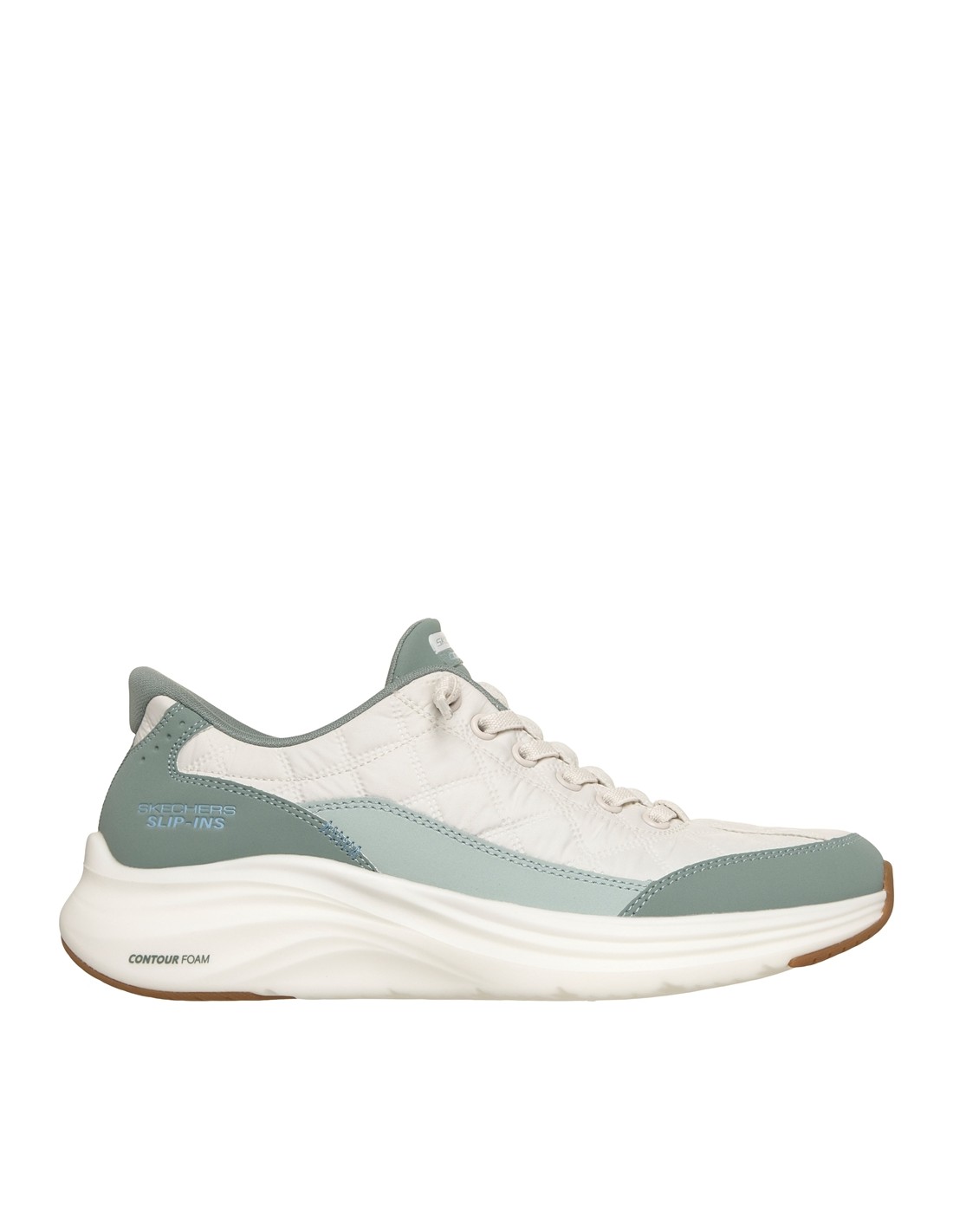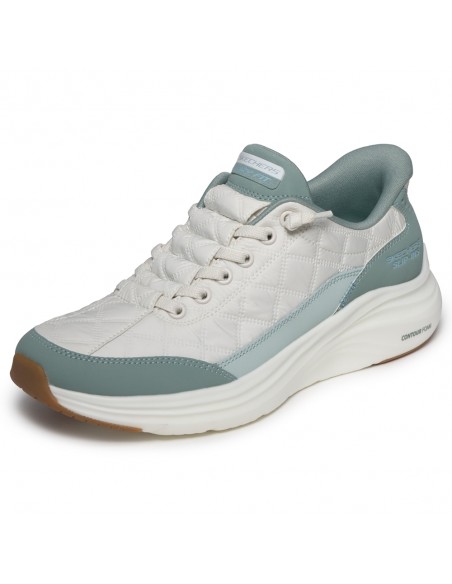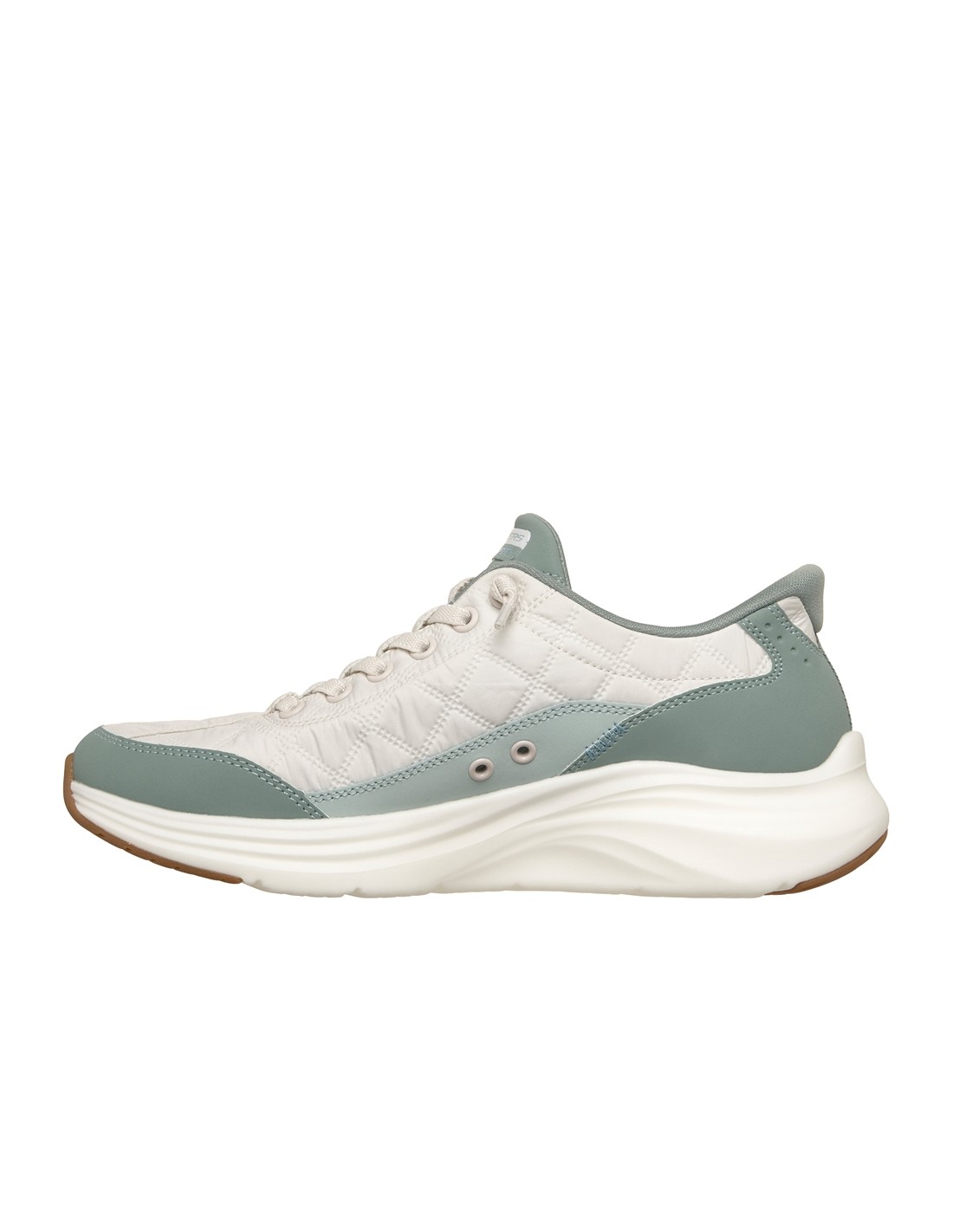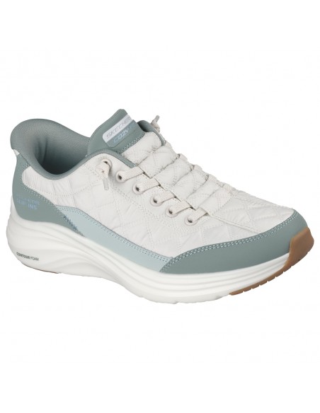 Descripción: Zapatilla mujer Skechers SLIP-INS VAPOR FOAM de suave malla blanca texturizada con refuerzos verdes. Plantilla amortiguadora Air Coled Memory Foam. Piso ligero Vapore Lite. Sistema Heel Pillow para calzarte sin manos.