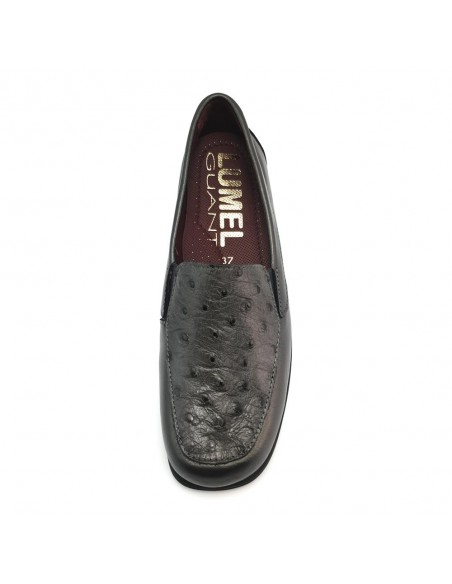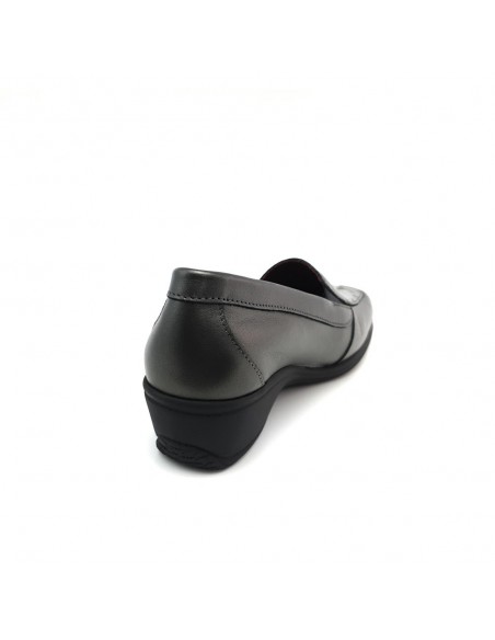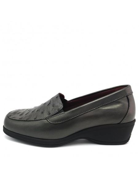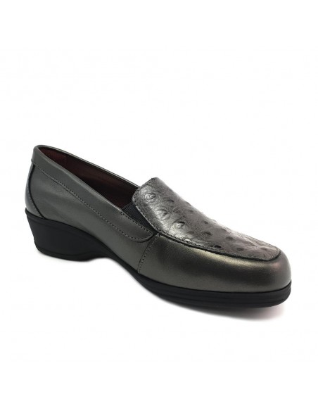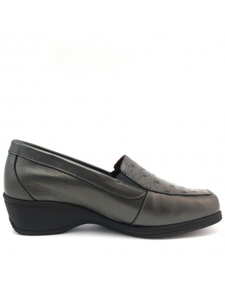 Descripción: Mocasín mujer de LUMEL 2377 en piel metalizada gris y un toque de piel estilo avestruz en la pala. Elásticos laterales. Plantilla extraible. Cómodo y ligero piso antideslizante.