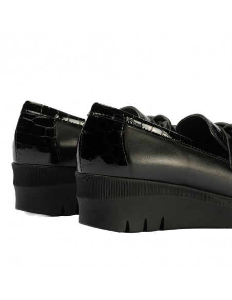 Descripción: Elegante blucher mujer de Pitillos 1640 en suave piel lisa negra con detales de coco y adorno metálico. Plantilla extraible anatómica. Cómoda cuña con plataforma, flexible y antideslizante.