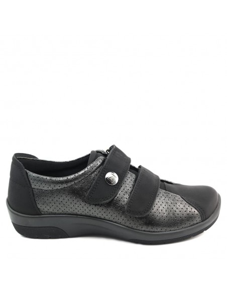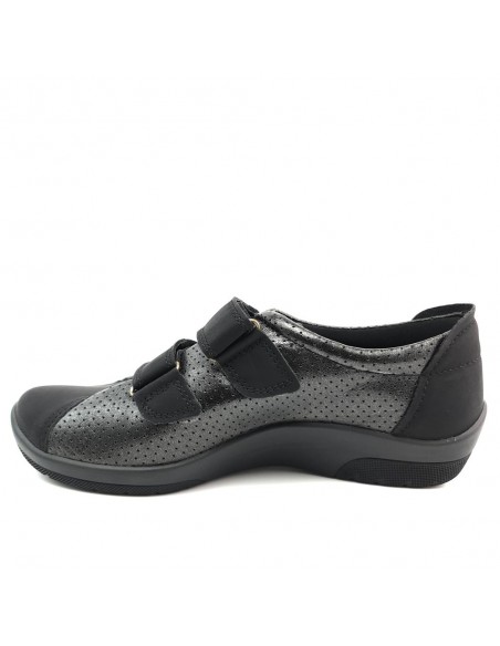 Descripción: Mocasín mujer EDGE de Arcopedico con ajuste de velcros. En licra elástica transpirable antracita y nubuck negro. Suela PU orgánico super ligero. Sistema Doble Arco para mejorra apoyo.