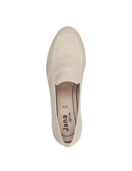 Descripción: Original mocasín mujer con CERTIFICADO VEGANO 24266 de Jana en suave y fresco tejido adaptable beig. Plantilla acolchada. Cómodo tacón tono madera con piso flexible y antideslizante.