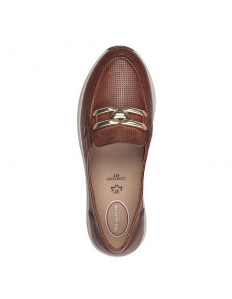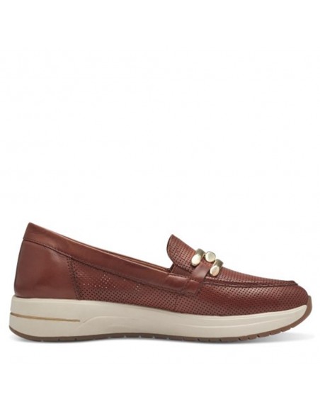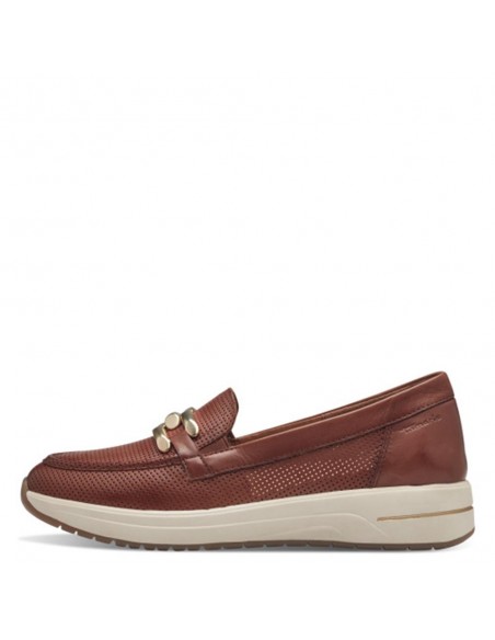 Descripción: Mocasín mujer 84310 de TAMARIS CONFORT en piel perforada tono cuero. con detalle pieza metalizada oro. Plantilla anatómica extraible. Cómodo piso amortiguador súper flexible y antideslizante.