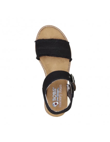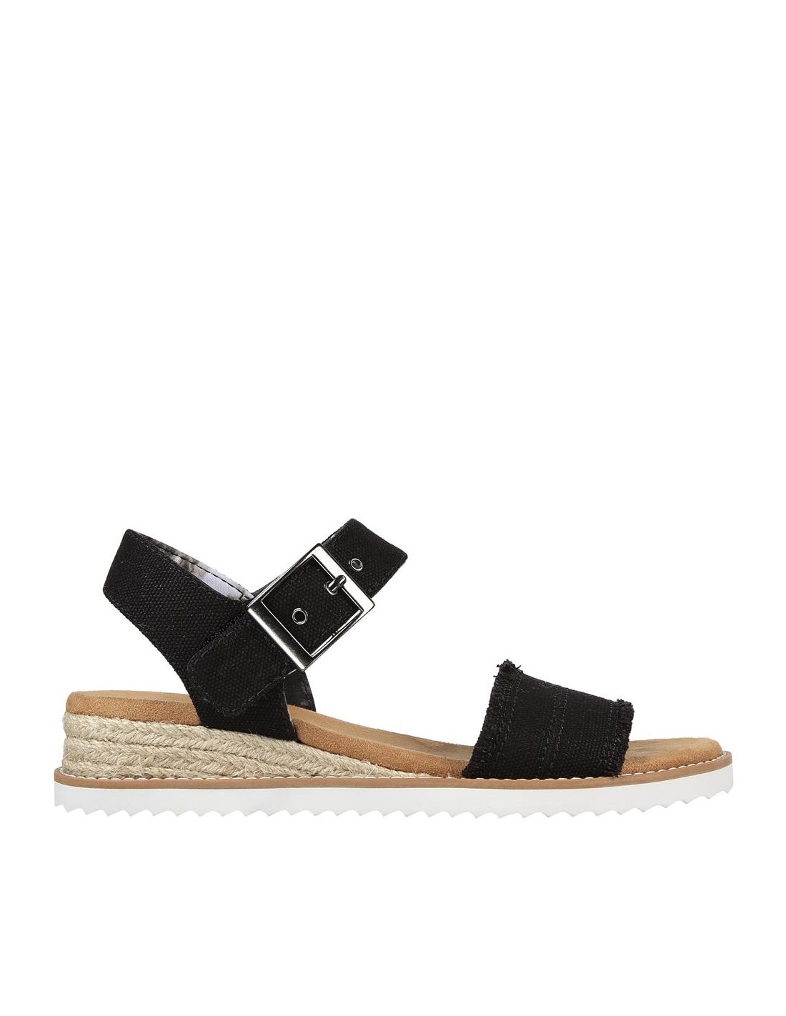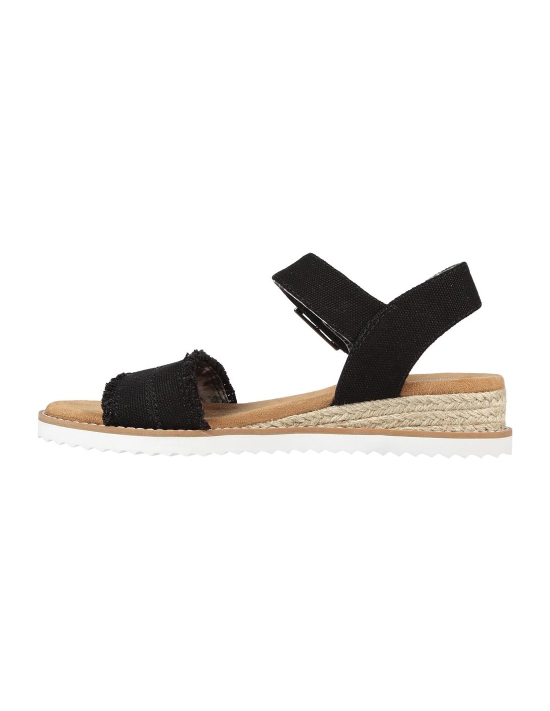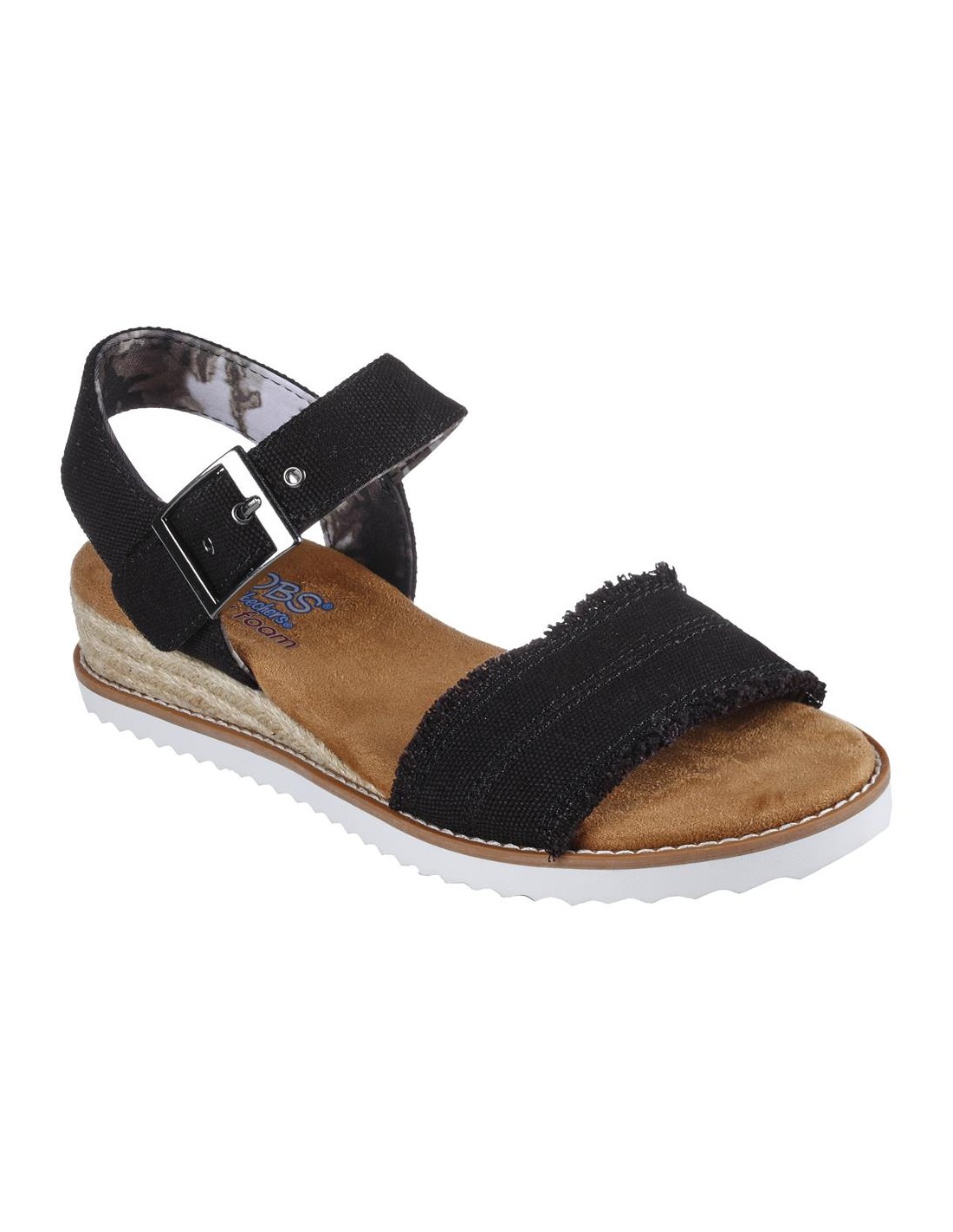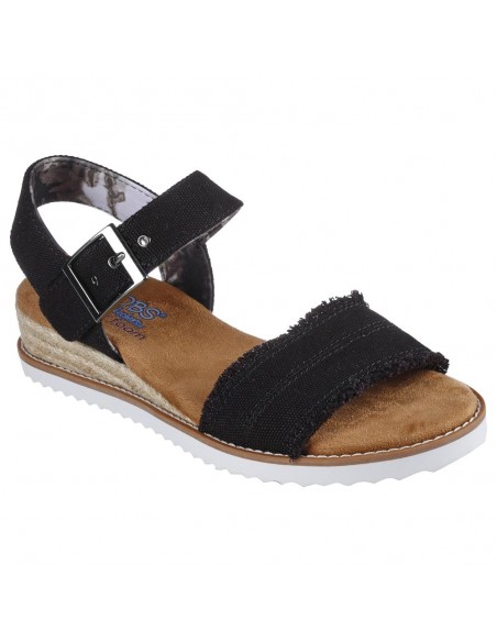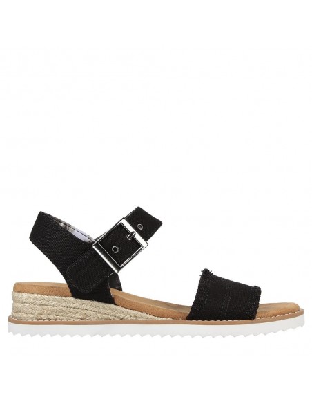Descripción: Sandalia mujer Skechers DESERT KISS - ADOBE PRINCESS en tejido suave negro estilo tejano lavado. Correa tobillera con ajuste de hebilla. Plantilla Memory Foam. Cuña de esparto con piso blanco.