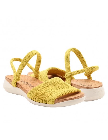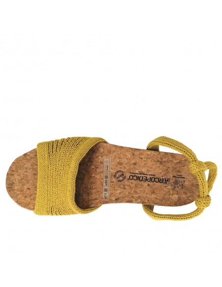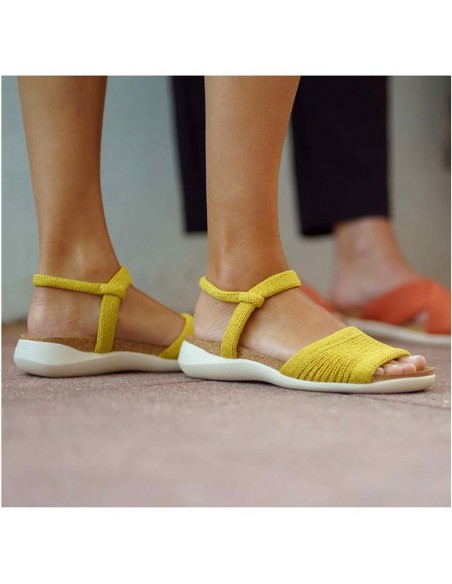Descripción: Nueva sandalia mujer Arcopedico ARENAL en suaves tiras de tejido tricodado amarillo. Plantila anatómica de corcho super cómoda. Cuña blanca ligera y antideslizante.