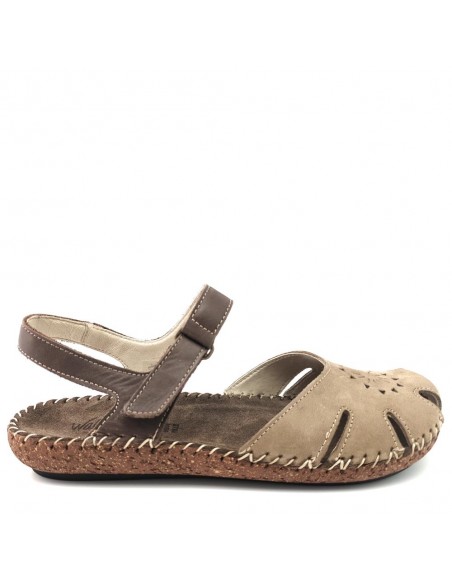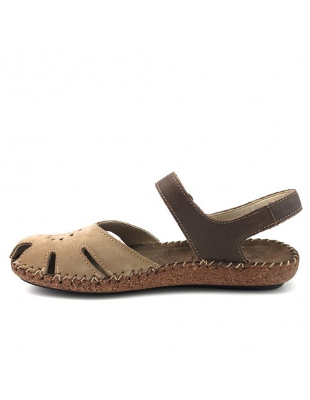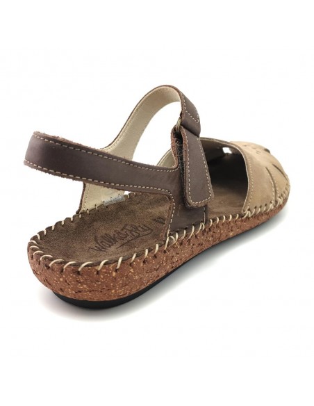 Descripción: Sandalia mujer cerrada punta WALK & FLY 7261-457101 en suave piel natural marrón-beig. Forro y plantilla acolchada de gel forrados en piel. Suela ligera cosida a mano, flexible con suela antideslizante.