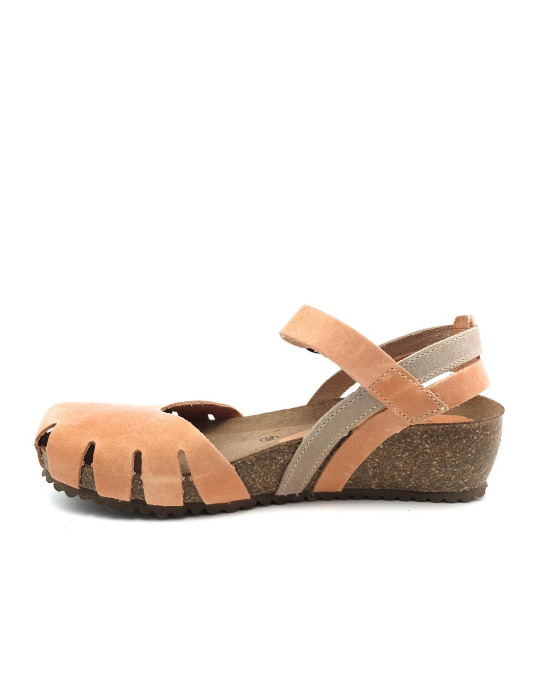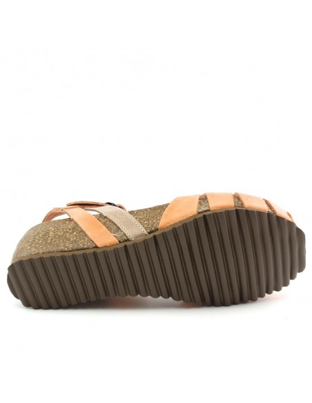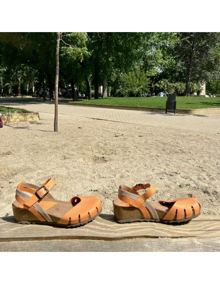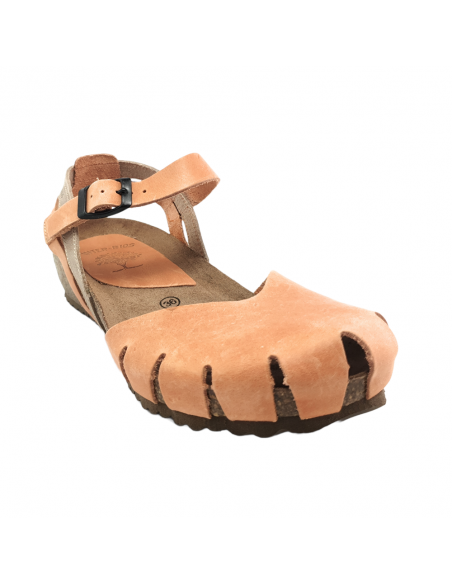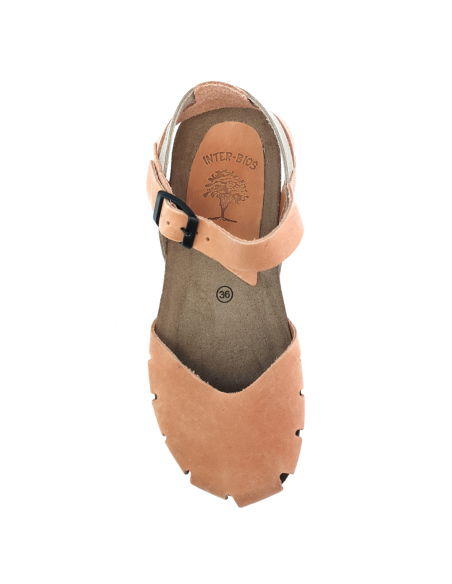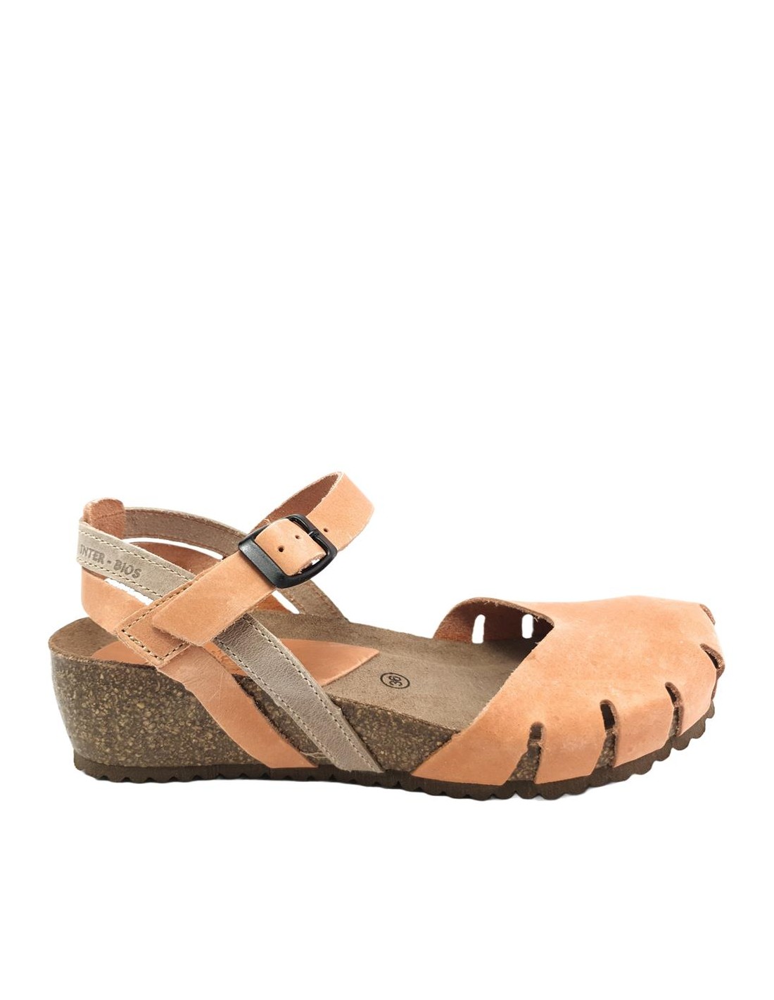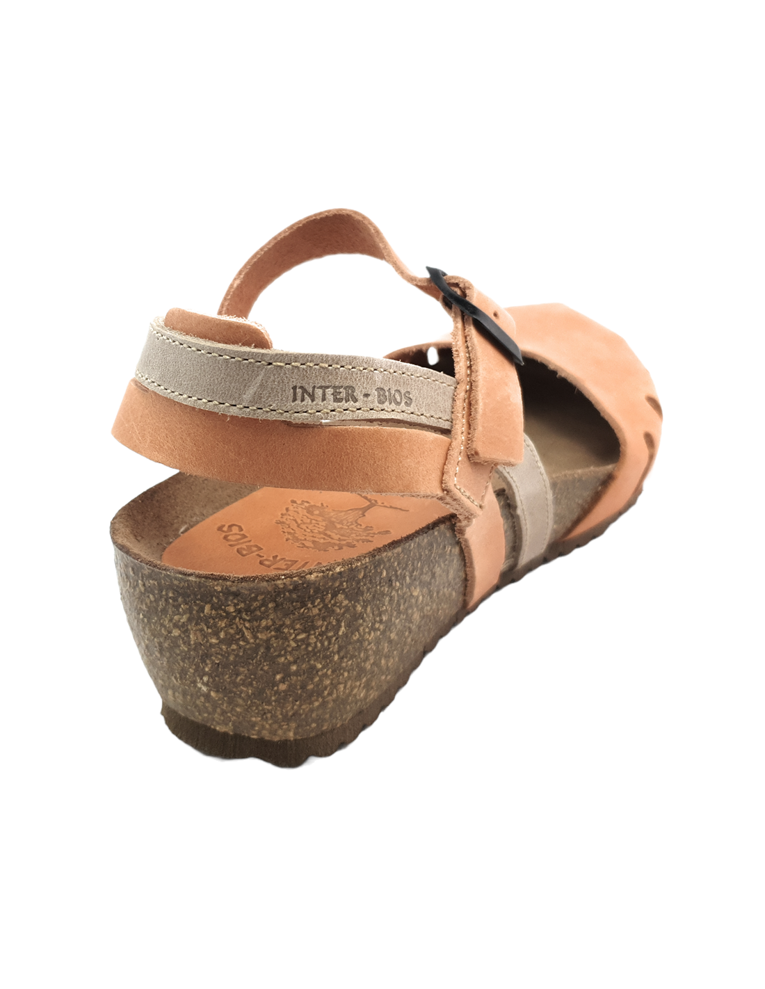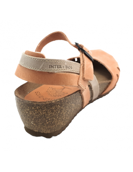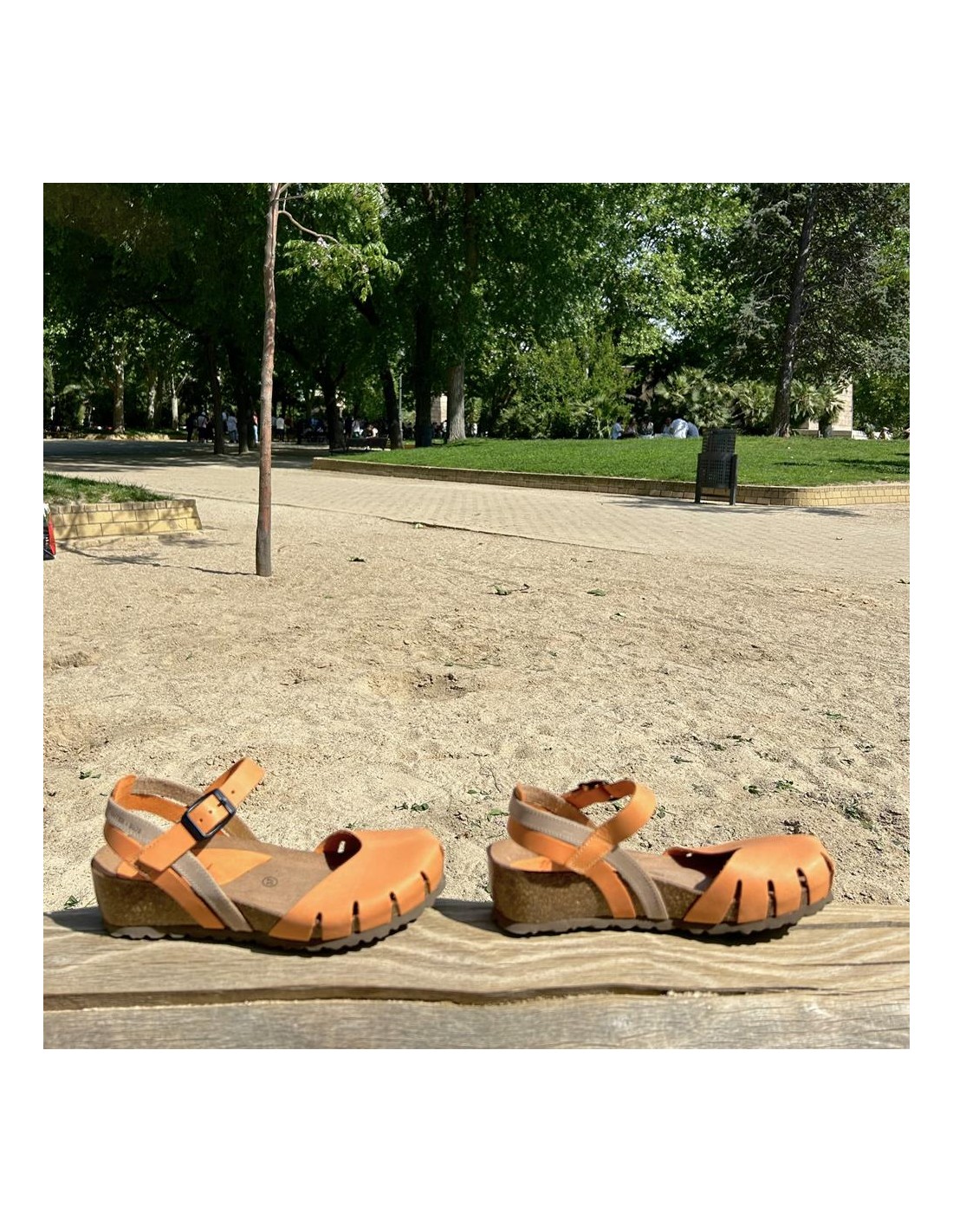 Descripción: Sandalia mujer INTERBIOS 5355 cerrada de la punta y tira tobillera ajustable con hebilla en piel combinada naranja-beig. Cómoda planta anatómica en piel estilo BIO. Cuña ligera de caucho con piso de goma antideslizante.