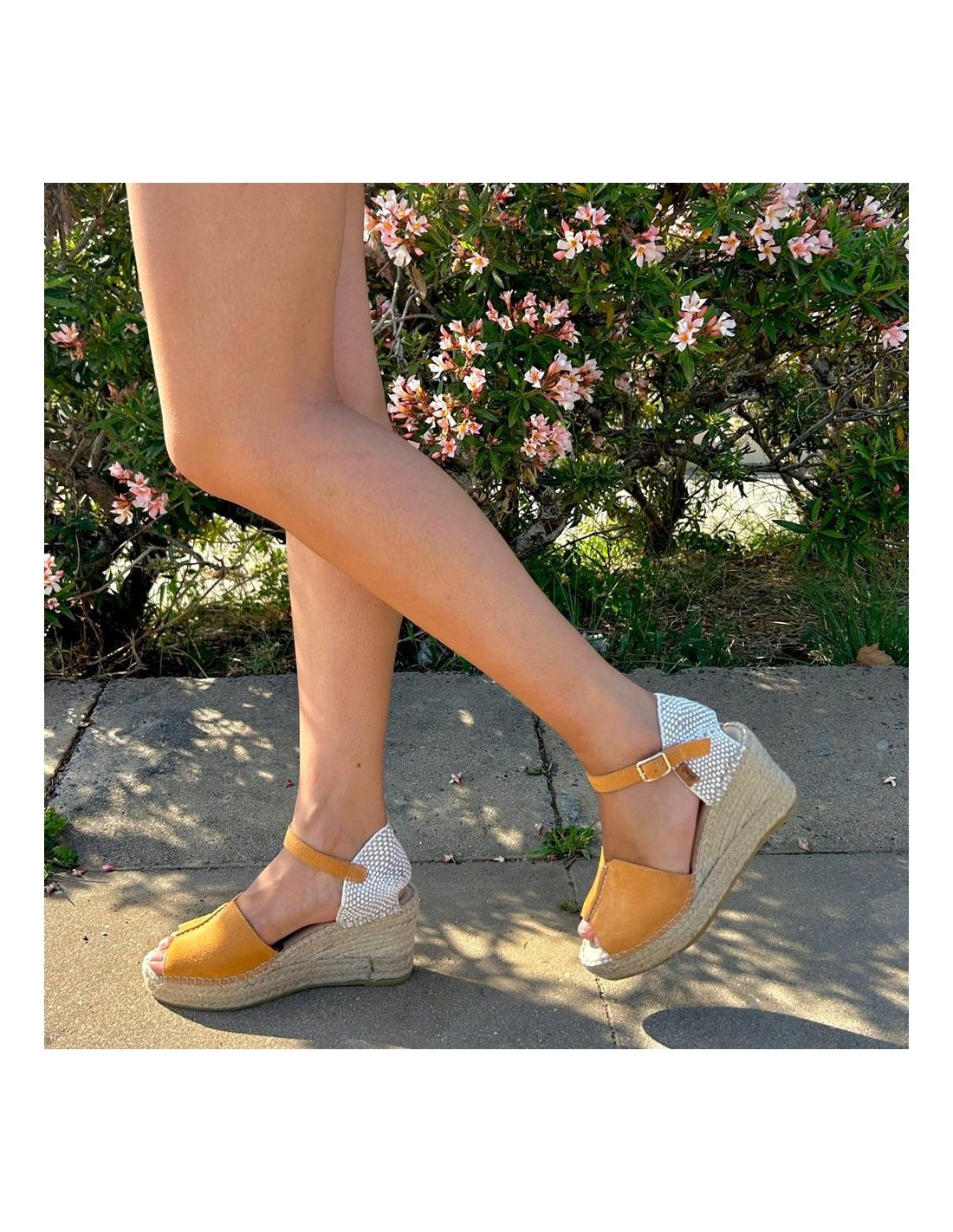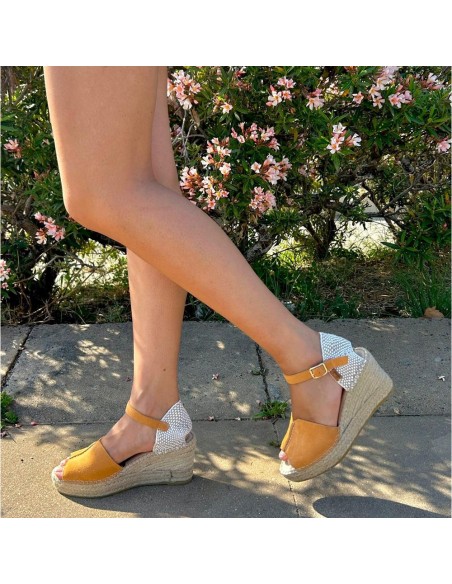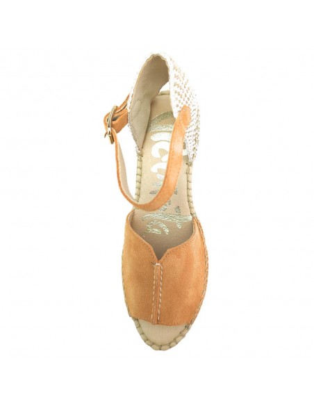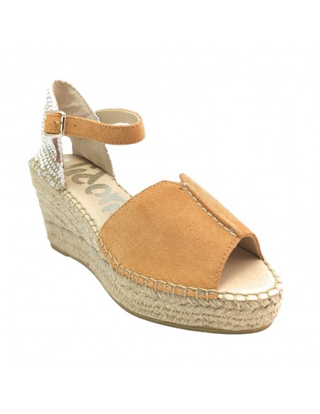 Descripción: Sandalia mujer VIDORRETA TILO 35800 de cuña de esparto natural con talonera y tira tobillera con ajuste de hebilla. En suave nubuck naranja. Piso goma antideslizante.