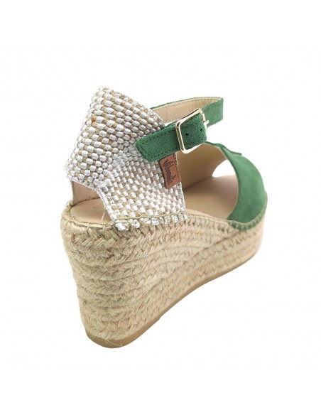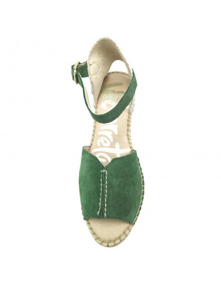 Descripción: Sandalia mujer VIDORRETA TILO 35800 de cuña de esparto natural con talonera y tira tobillera con ajuste de hebilla. En suave nubuck verde. Piso goma antideslizante.