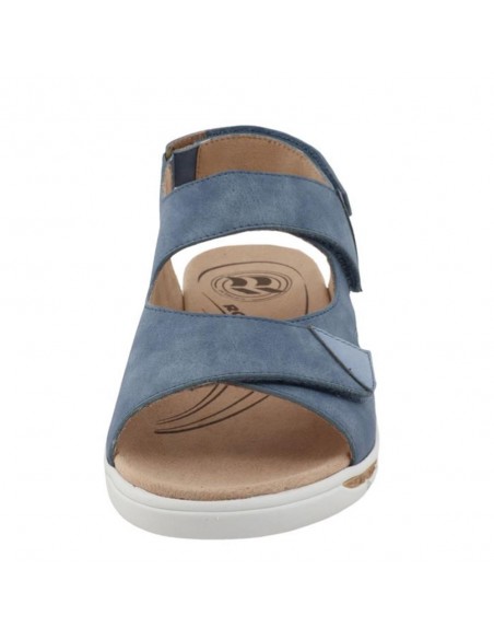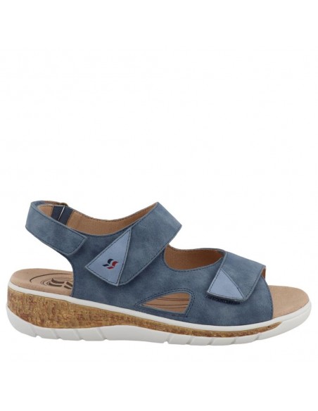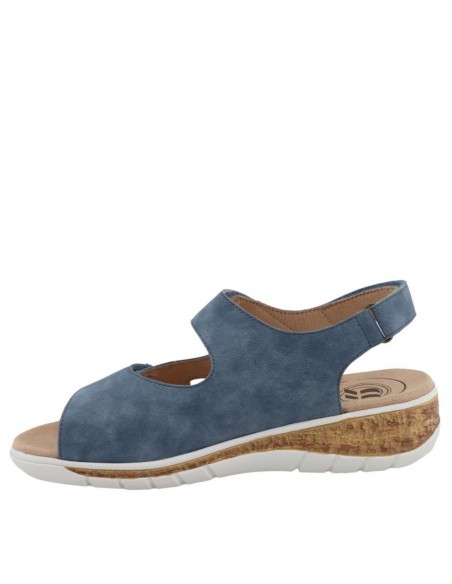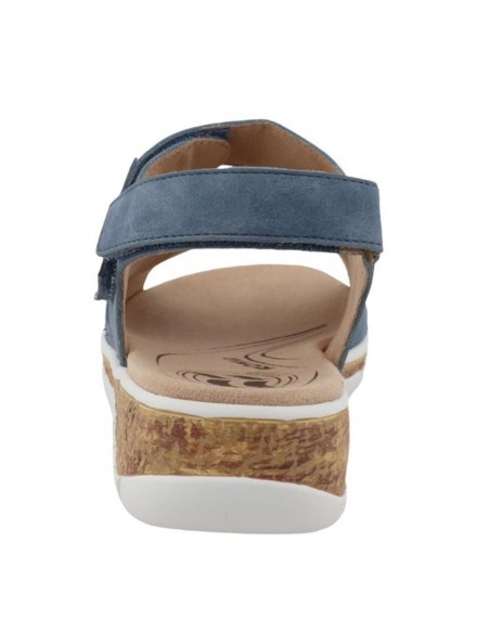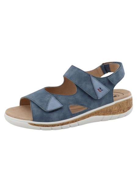 Descripción: Cómoda sandalia mujer de ROMIKA modelo 74R0262004 en suave tejido jeans. Ajuste con velcros. Planta acolchada. Cuña super ligera imitación corcho y piso con dibujo antideslizante.