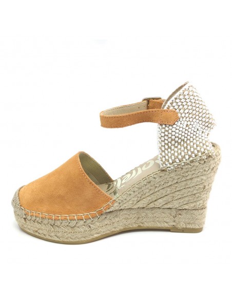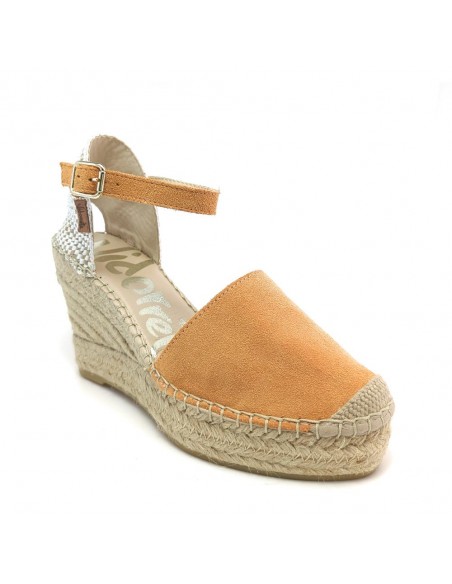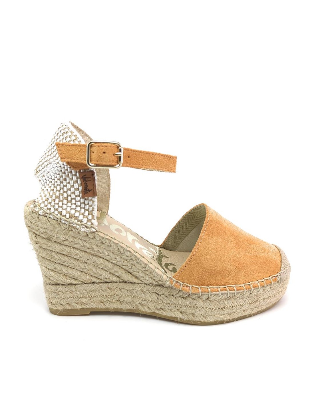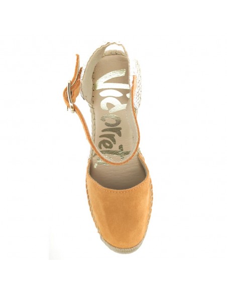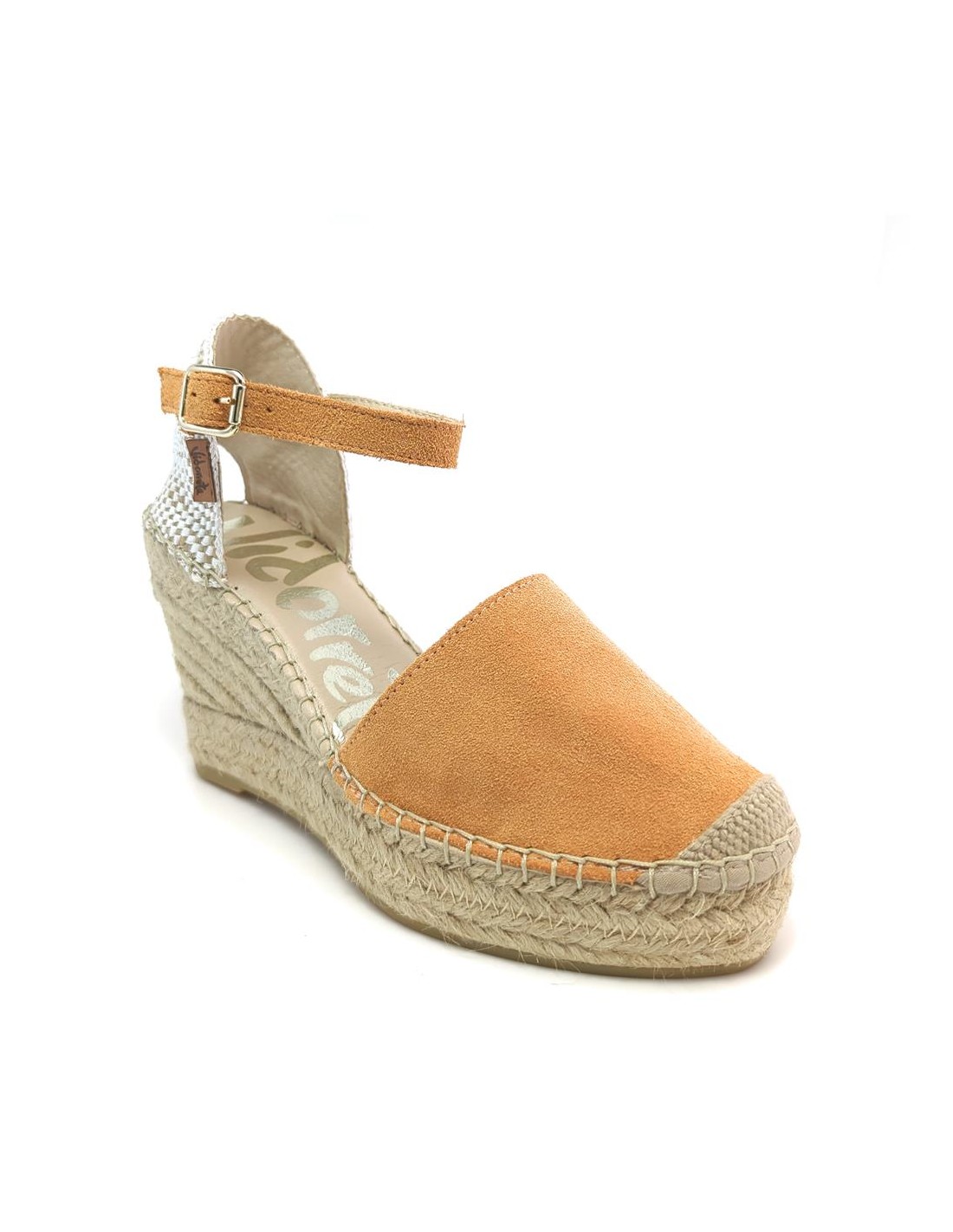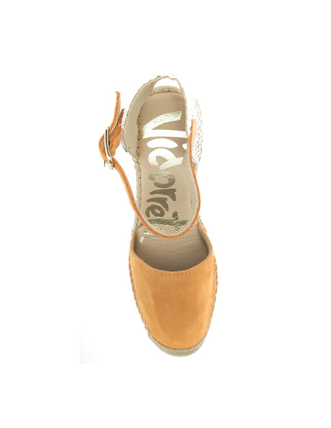 Descripción: Sandalia mujer VIDORRETA TILO 07100 de cuña de esparto natural con talonera y tira tobillera con ajuste de hebilla. En suave nubuck naranja y refuerzo en la puntera. Piso goma antideslizante.