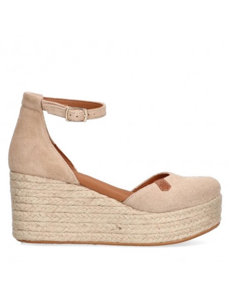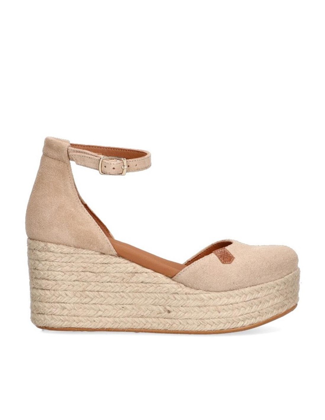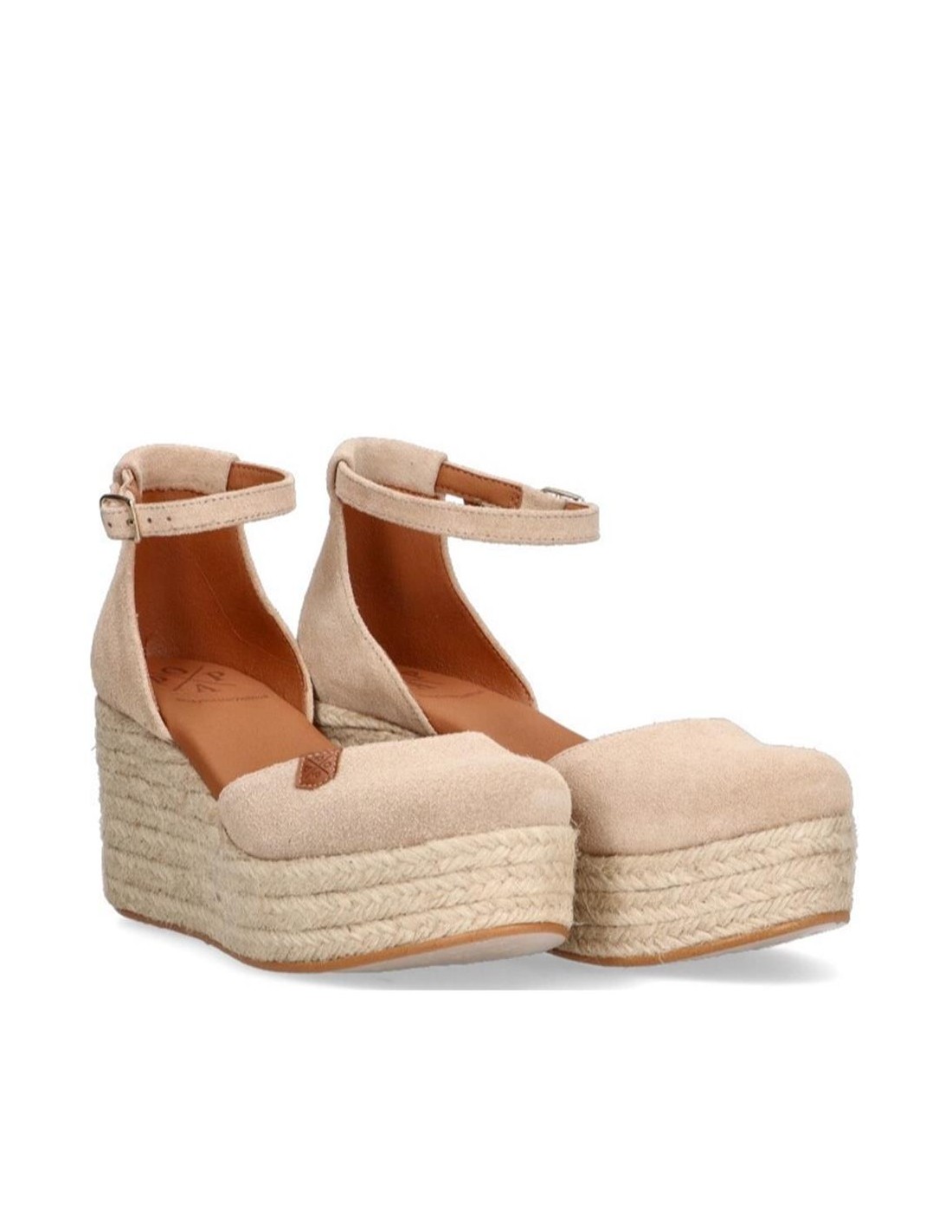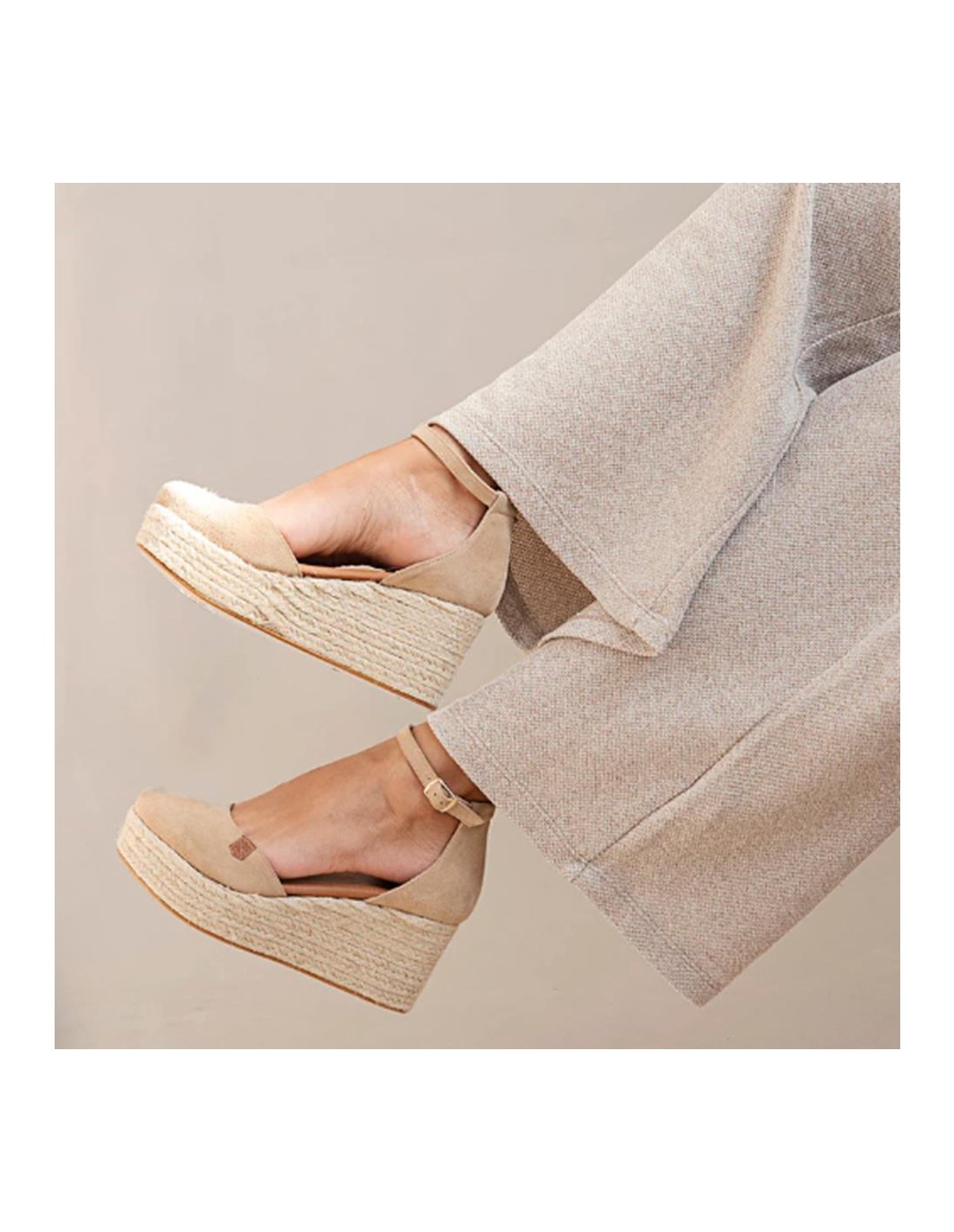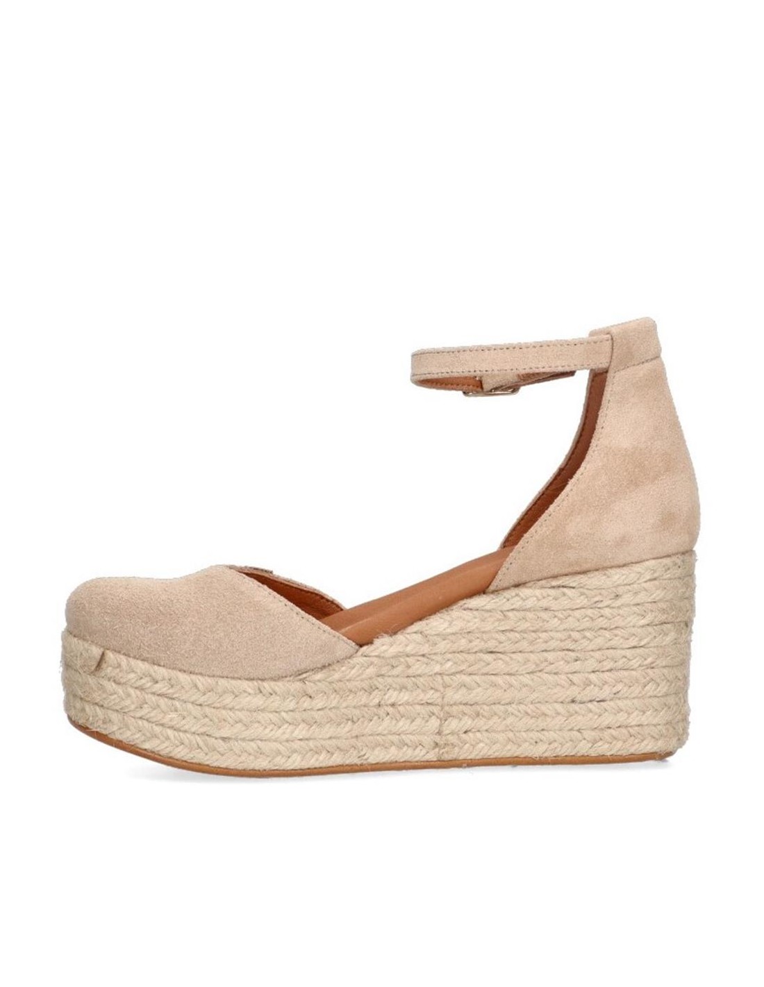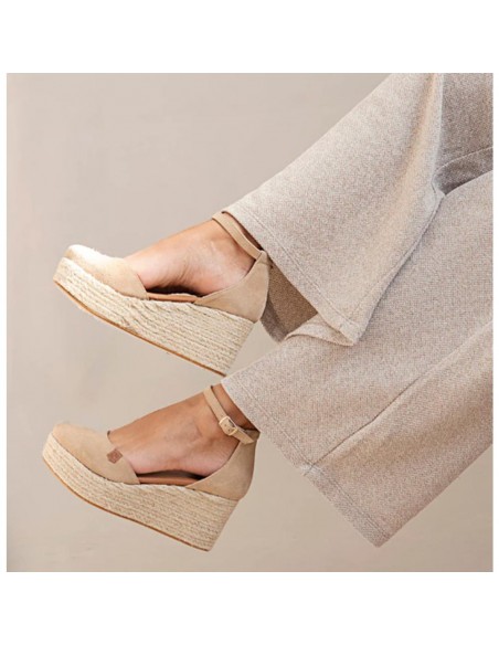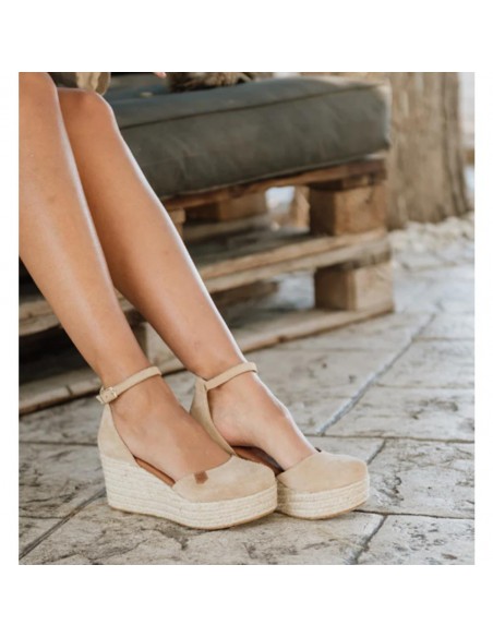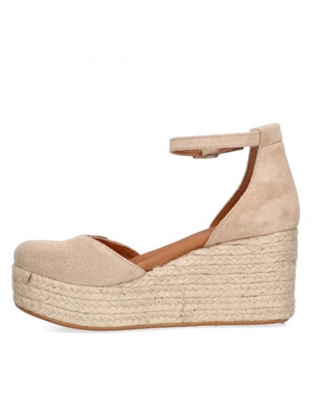Descripción: Elegante sandalia mujer ARAMBOL de POPA en nubuck beig cerrada de la puntera y tira tobillera ajustable con hebilla. Cómoda plantilla forrada. Cuña con plataforma de yute con piso de goma antideslizante.
