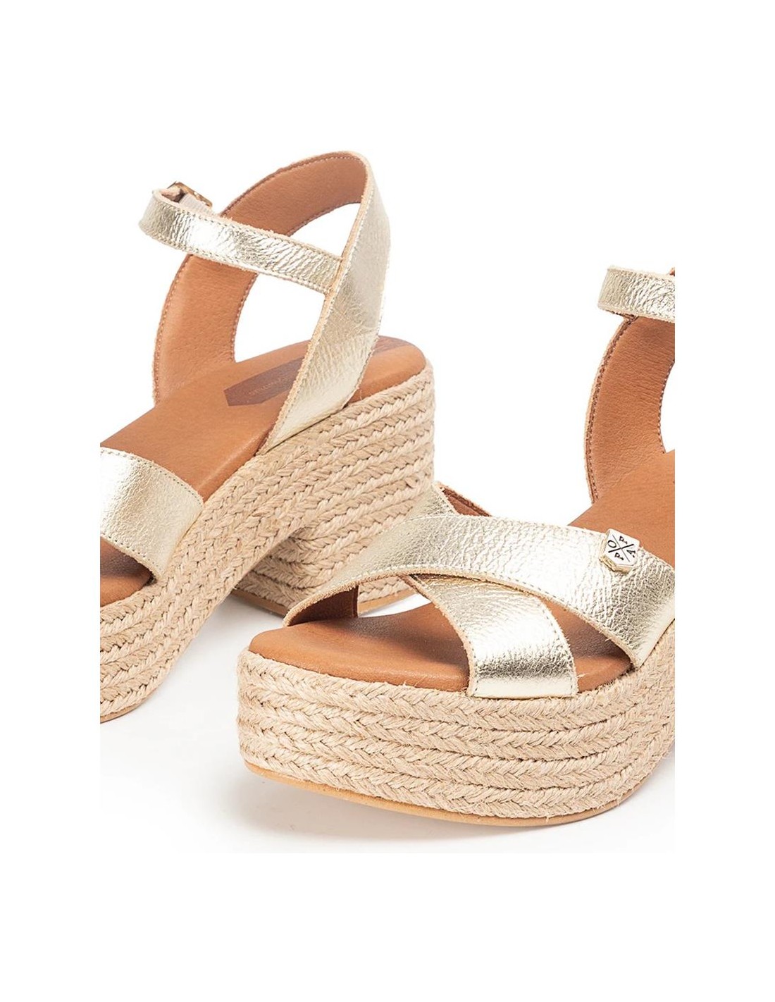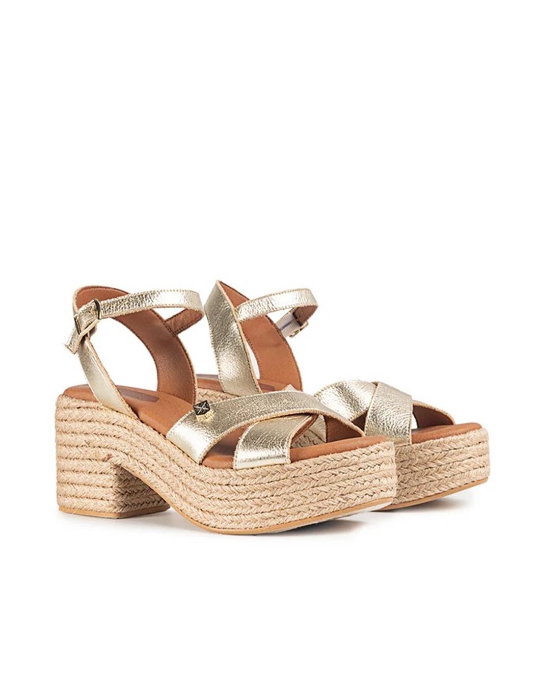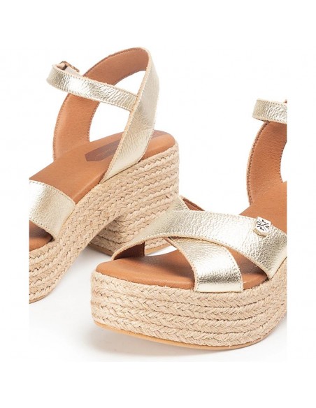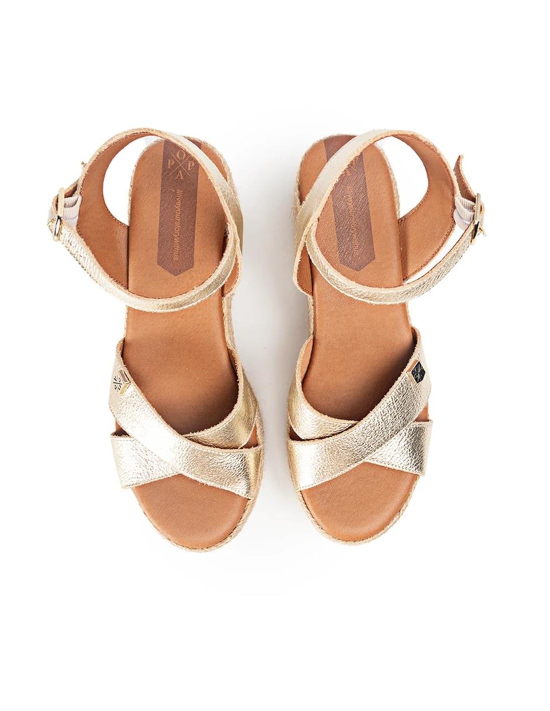 Descripción: Elegante sandalia mujer CLIIFTON de POPA en tiras cruzadas piel oro y tira tobillera piel ajustable con hebilla. Cómoda plantilla acolchada. Plataforma con tacón cuadrado forrados de yute
