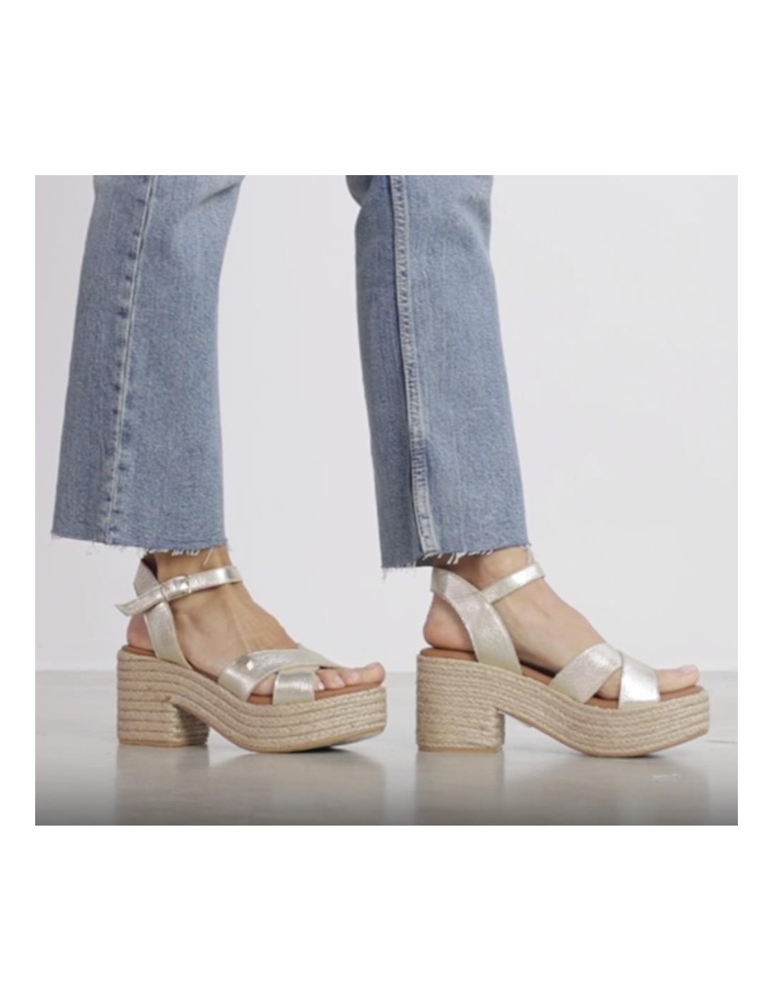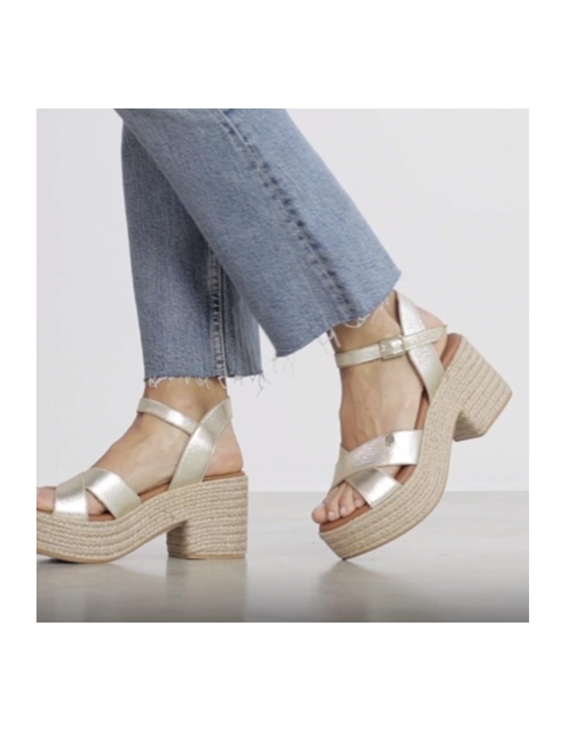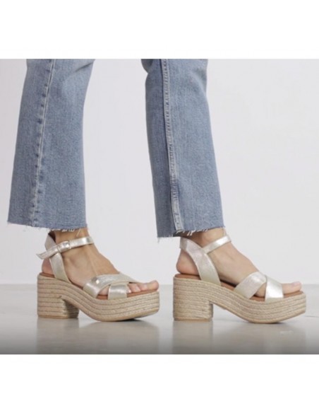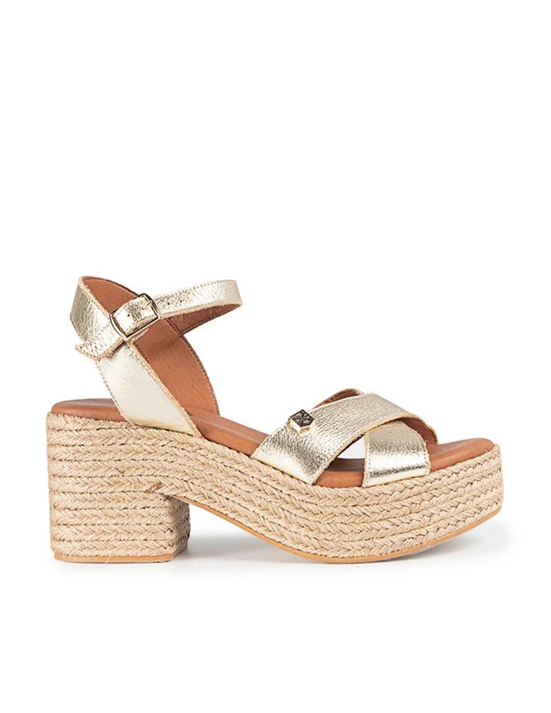 Descripción: Elegante sandalia mujer CLIIFTON de POPA en tiras cruzadas piel oro y tira tobillera piel ajustable con hebilla. Cómoda plantilla acolchada. Plataforma con tacón cuadrado forrados de yute