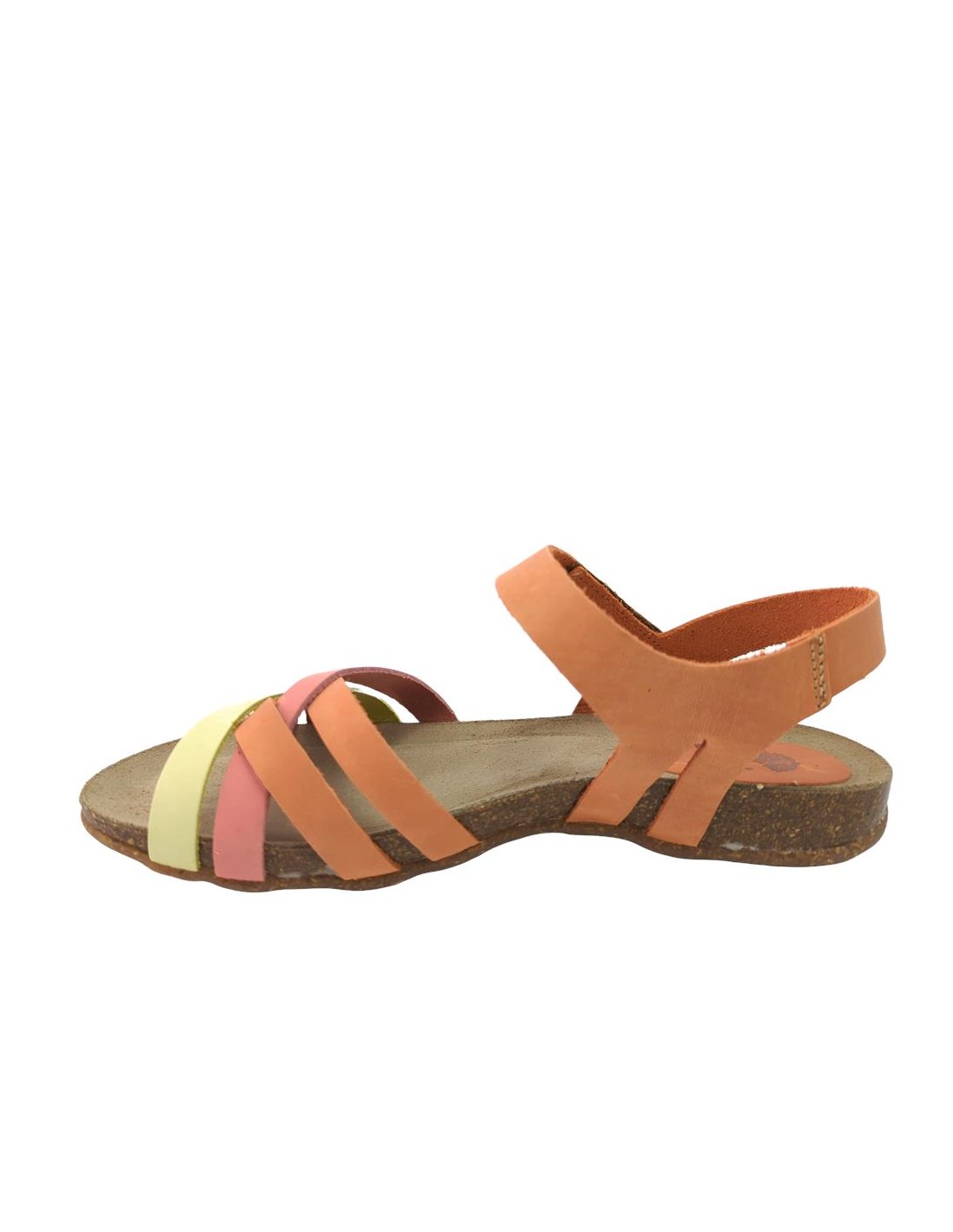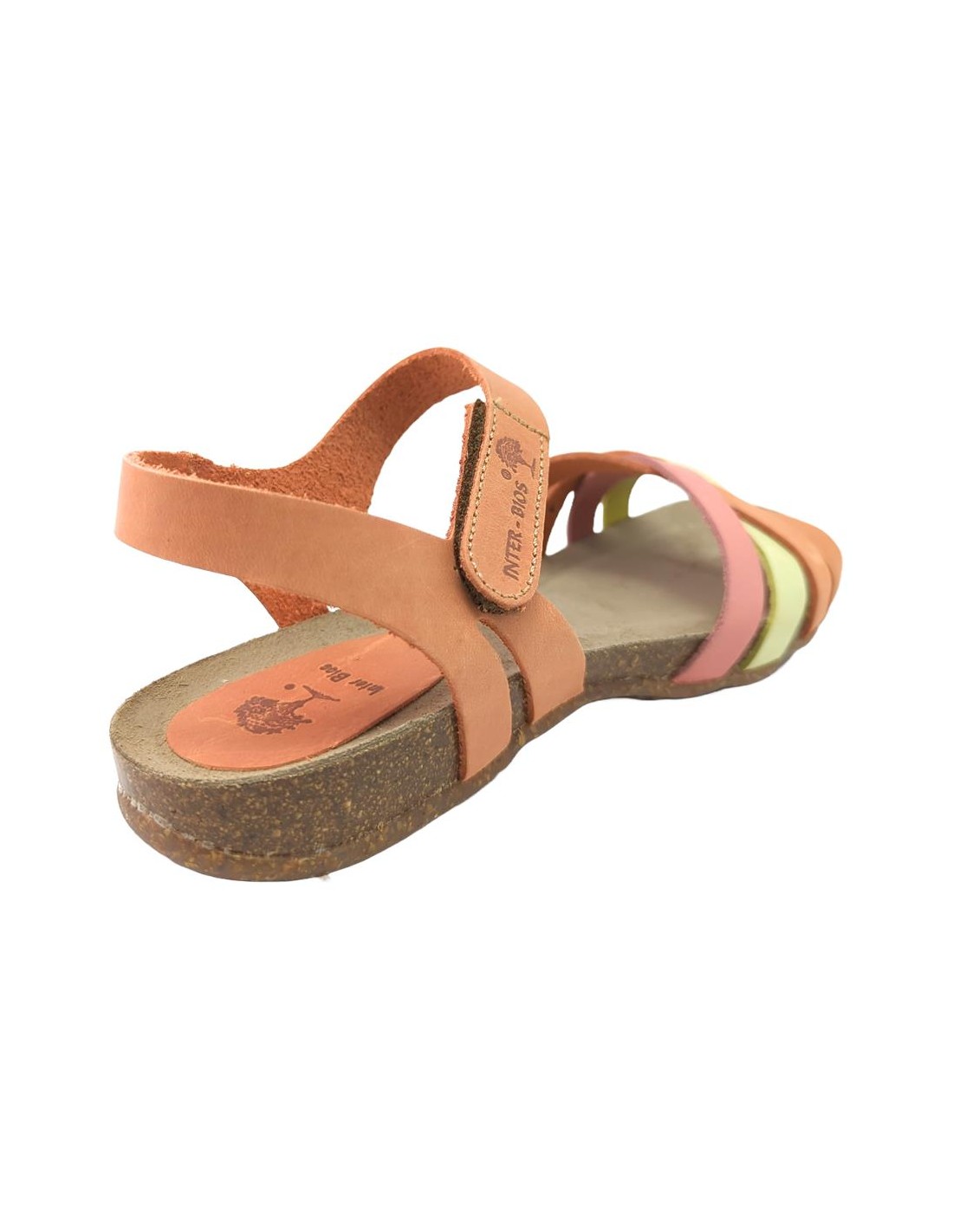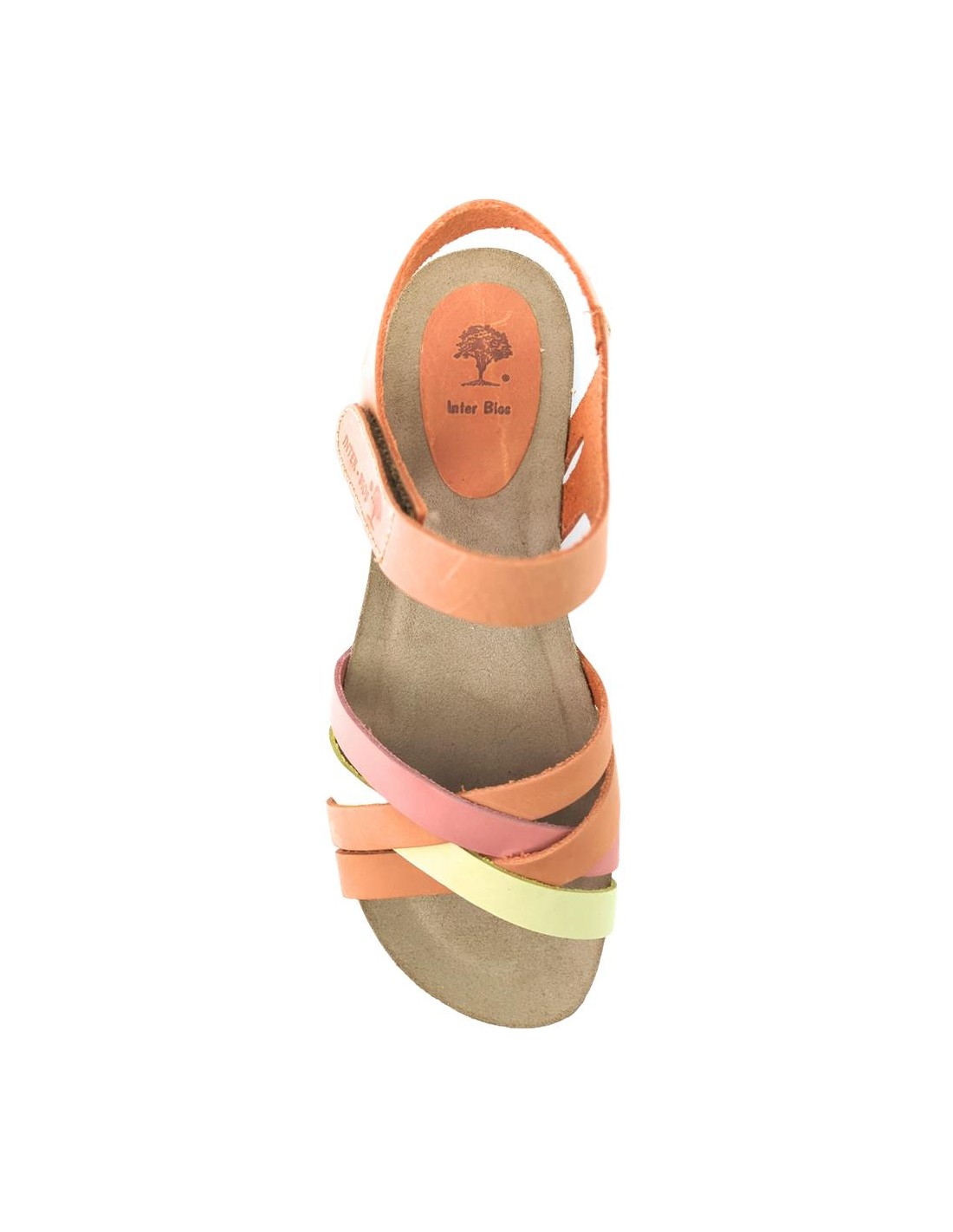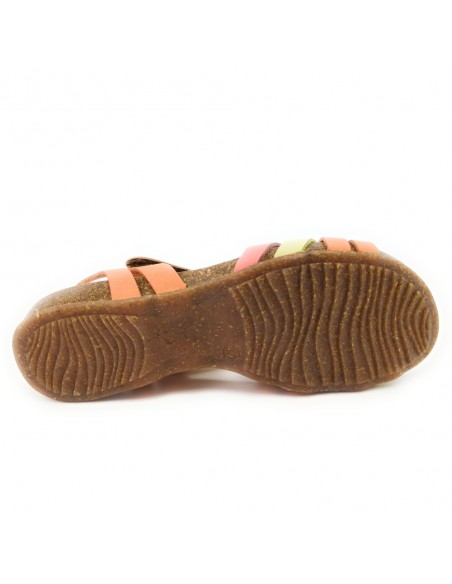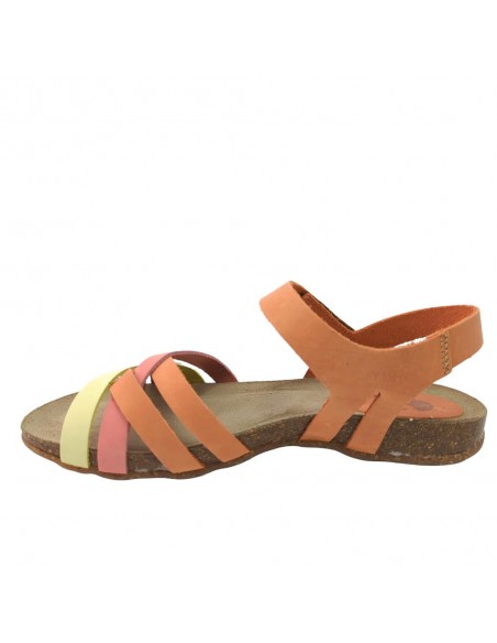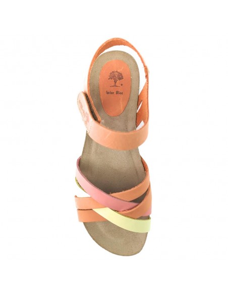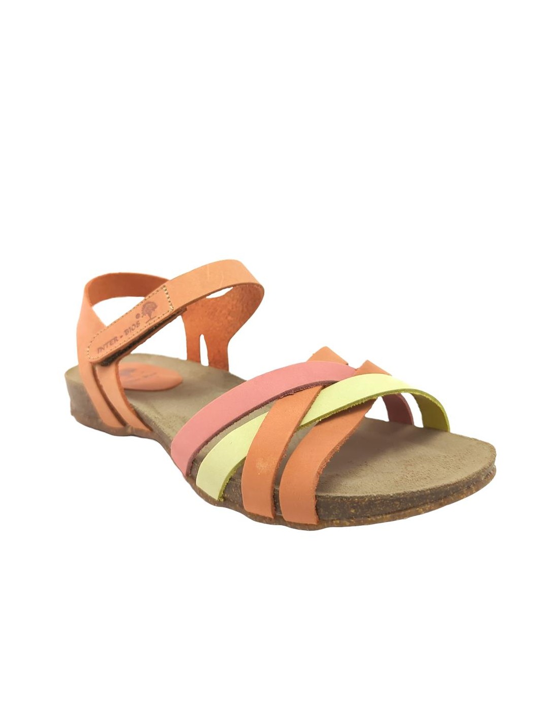 Descripción: Sandalia mujer INTERBIOS 4420. Cómoda planta anatómica en piel estilo BIO. Original combinación naranja desgastado-limón-carmín. Ajuste con cierre de velcro. Ligera cuña caucho con piso de goma antideslizante.