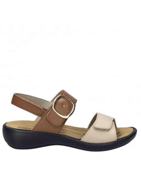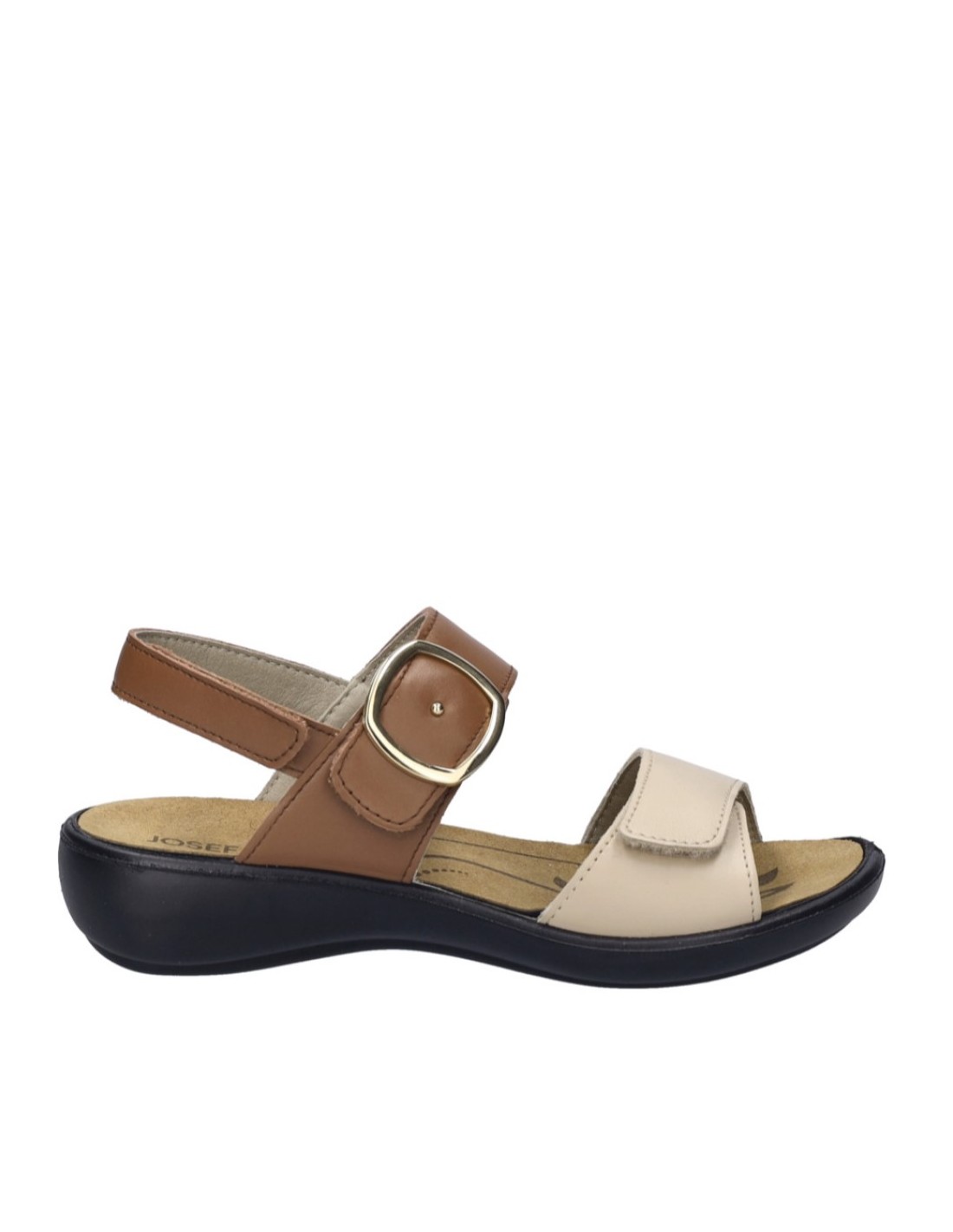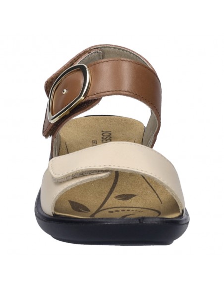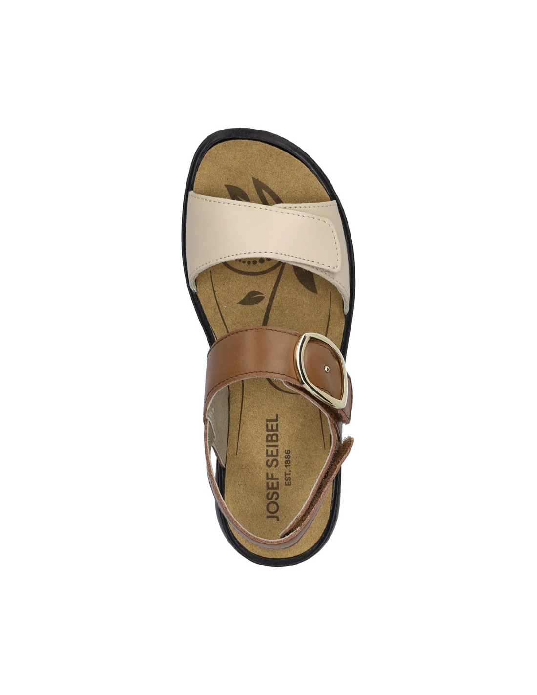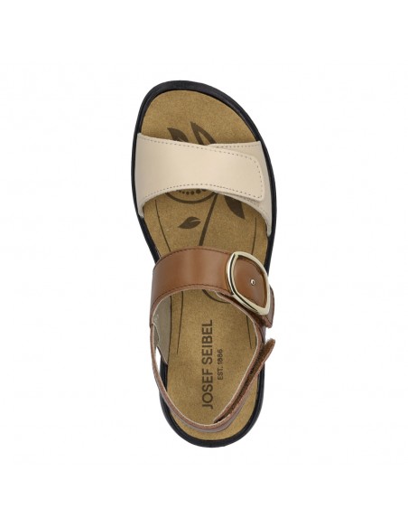 Descripción: Sandalia mujer de Josef Seibel IBIZA-12 en suave piel beig-cuero con detalle hebilla. Ajuste con velcros. Planta anatómica extraible. Piso de poliuretano inyectado ligero y con dibujo antideslizante.