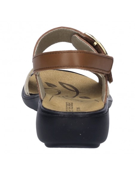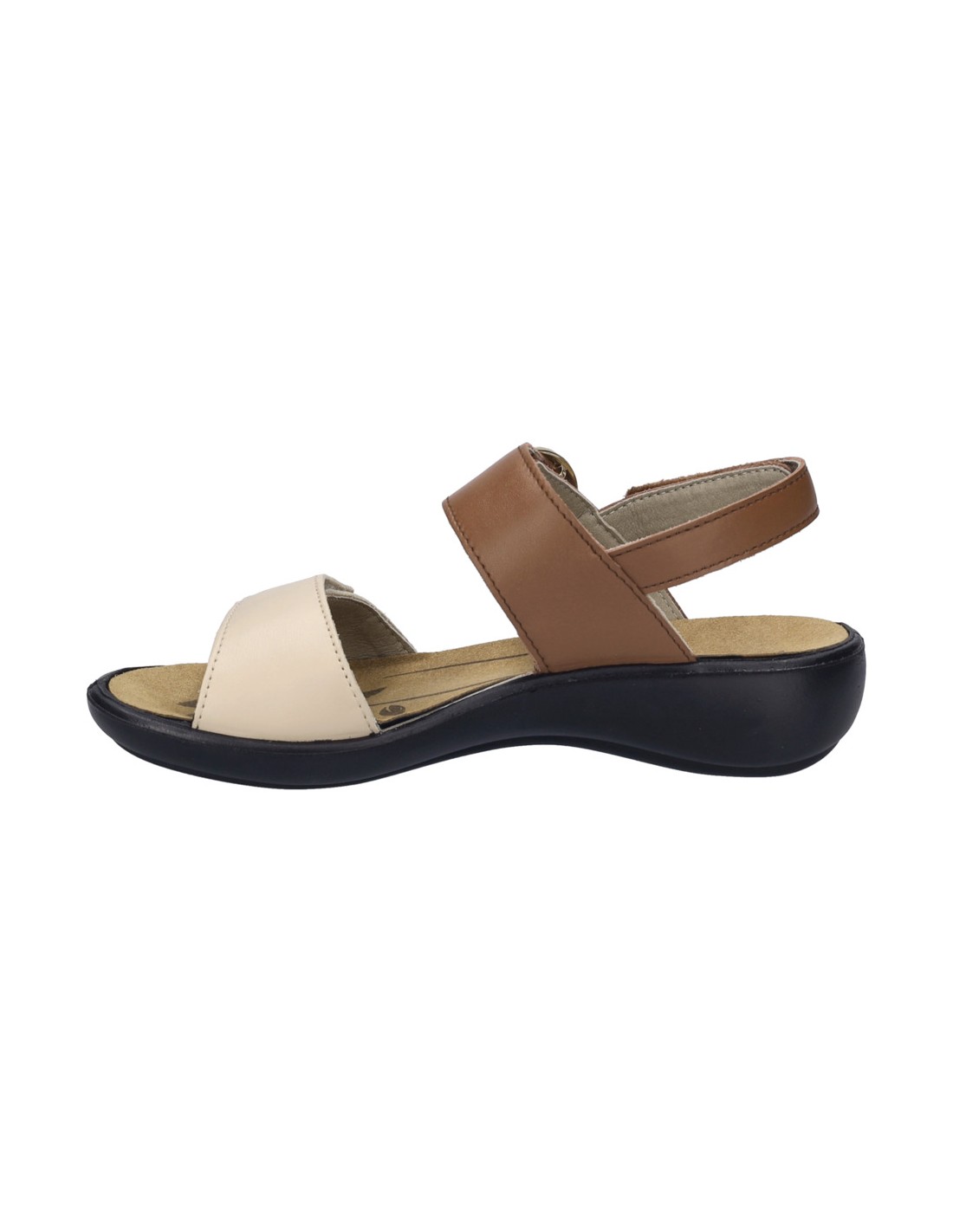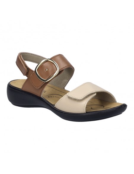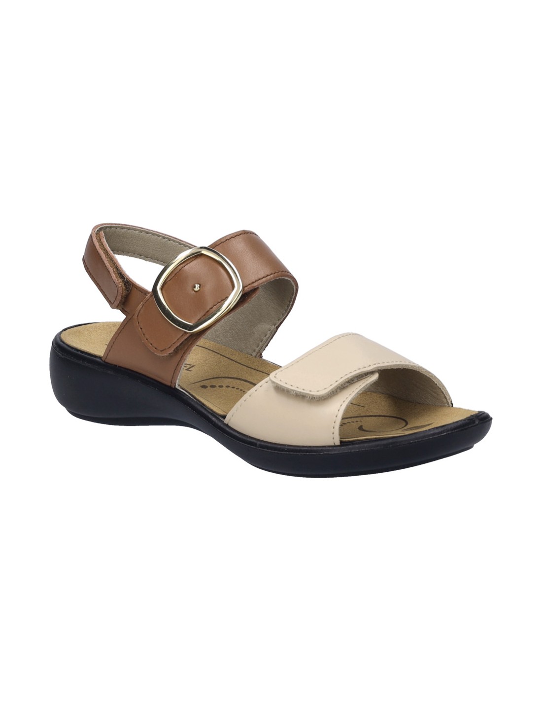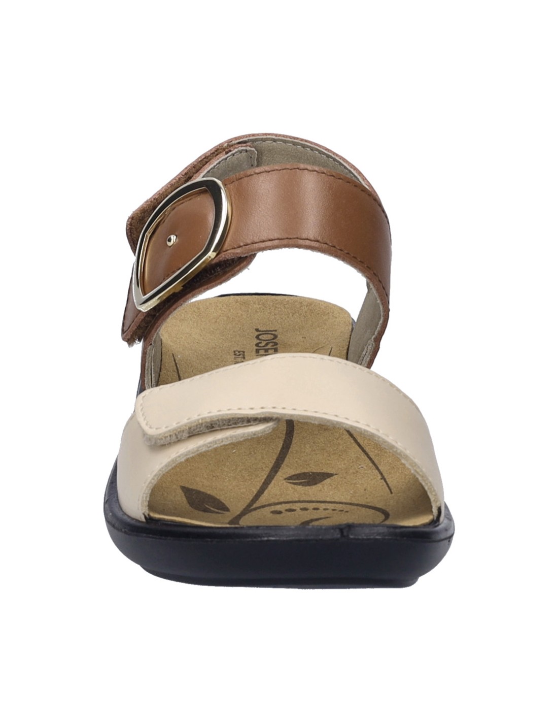 Descripción: Sandalia mujer de Josef Seibel IBIZA-12 en suave piel beig-cuero con detalle hebilla. Ajuste con velcros. Planta anatómica extraible. Piso de poliuretano inyectado ligero y con dibujo antideslizante.