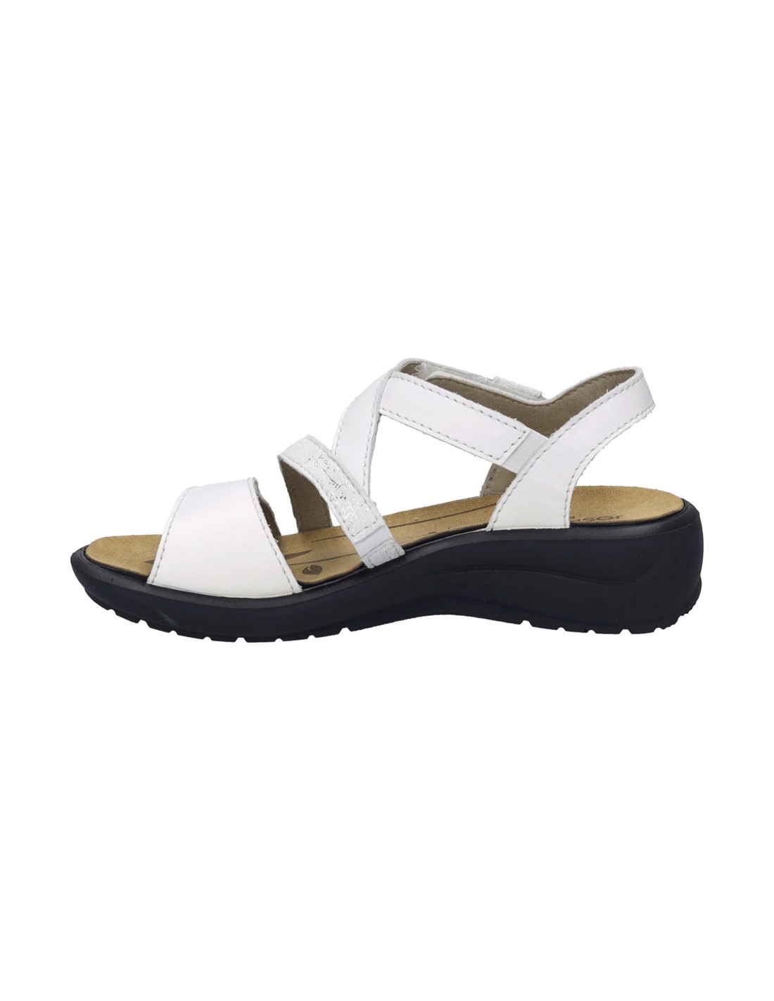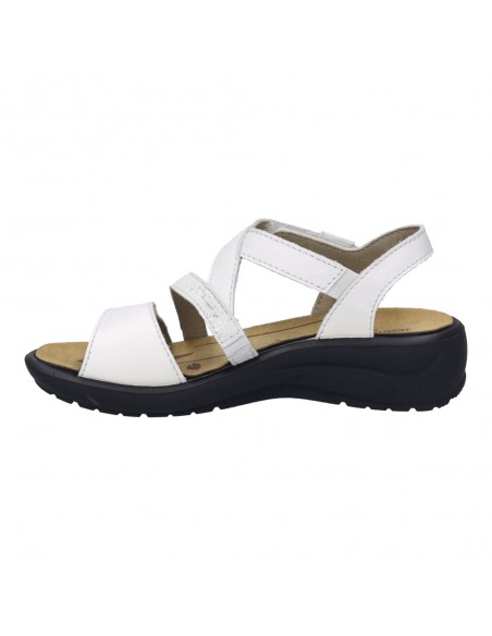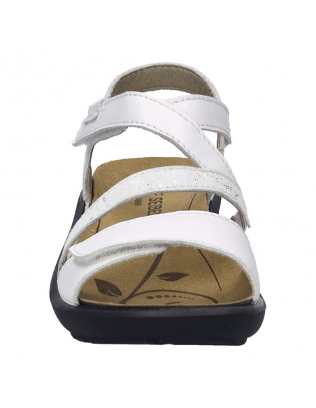 Descripción: Sandalia mujer de Josef Seibel ANNECY-12 en suave piel blanca-plata. Ajuste con velcros. Planta anatómica extraible. Piso de poliuretano inyectado ligero y con dibujo antideslizante.
