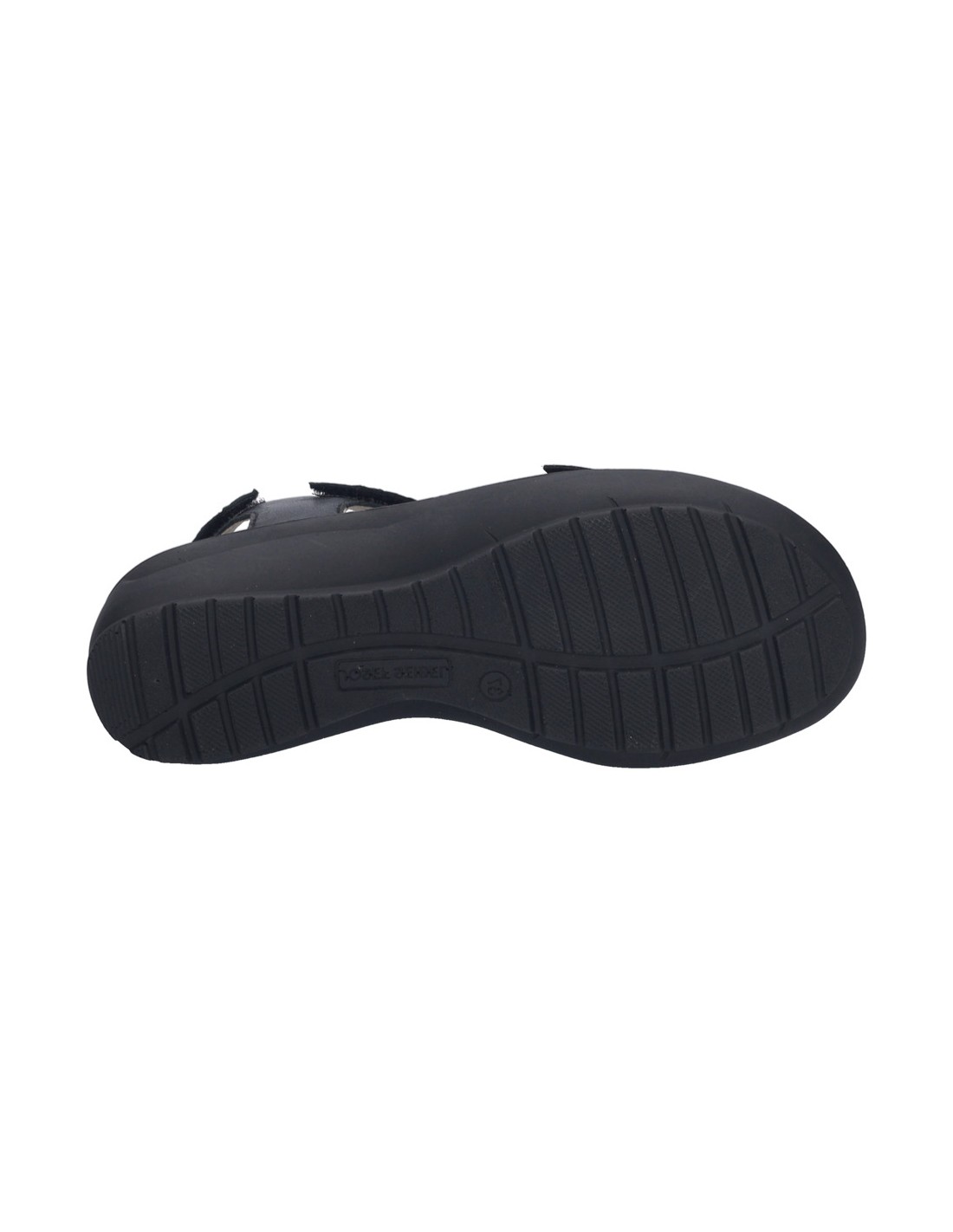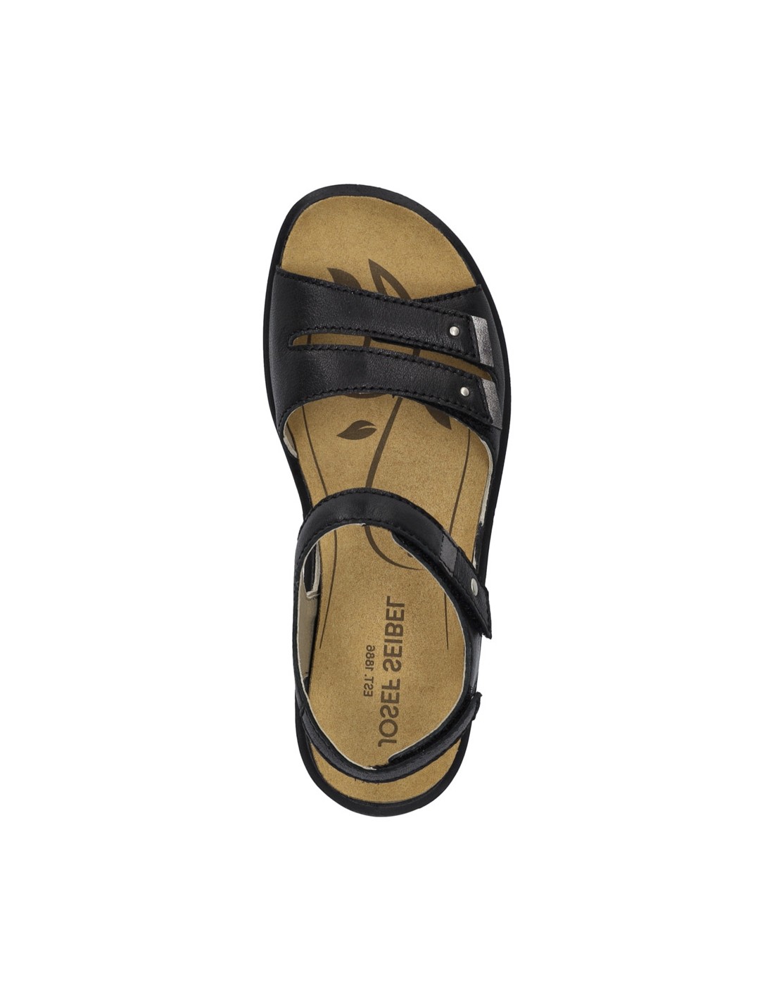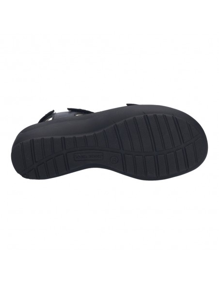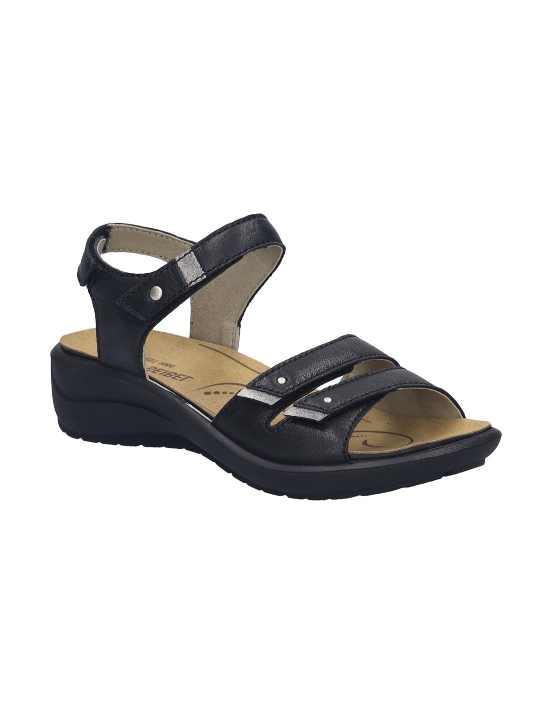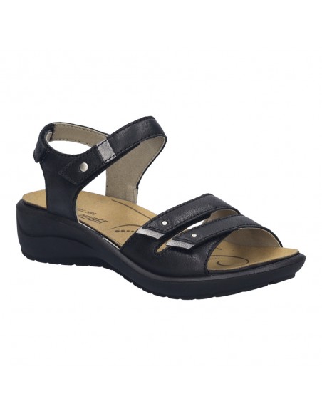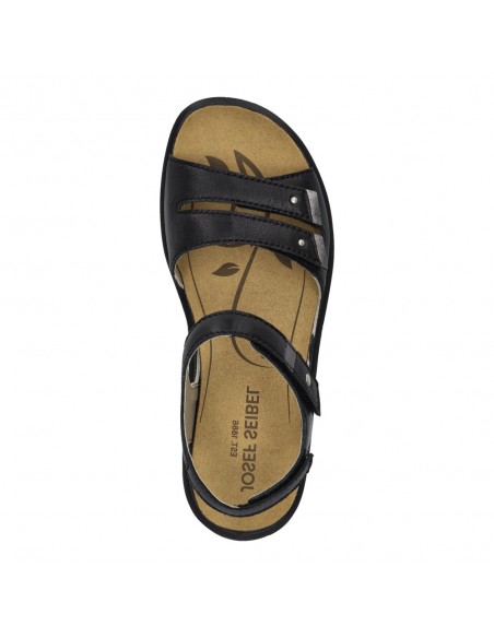 Descripción: Sandalia mujer de Josef Seibel ANNECY-02 en suave piel negra y detalles plata. Ajuste con velcros. Planta anatómica extraible. Piso de poliuretano inyectado ligero y con dibujo antideslizante.