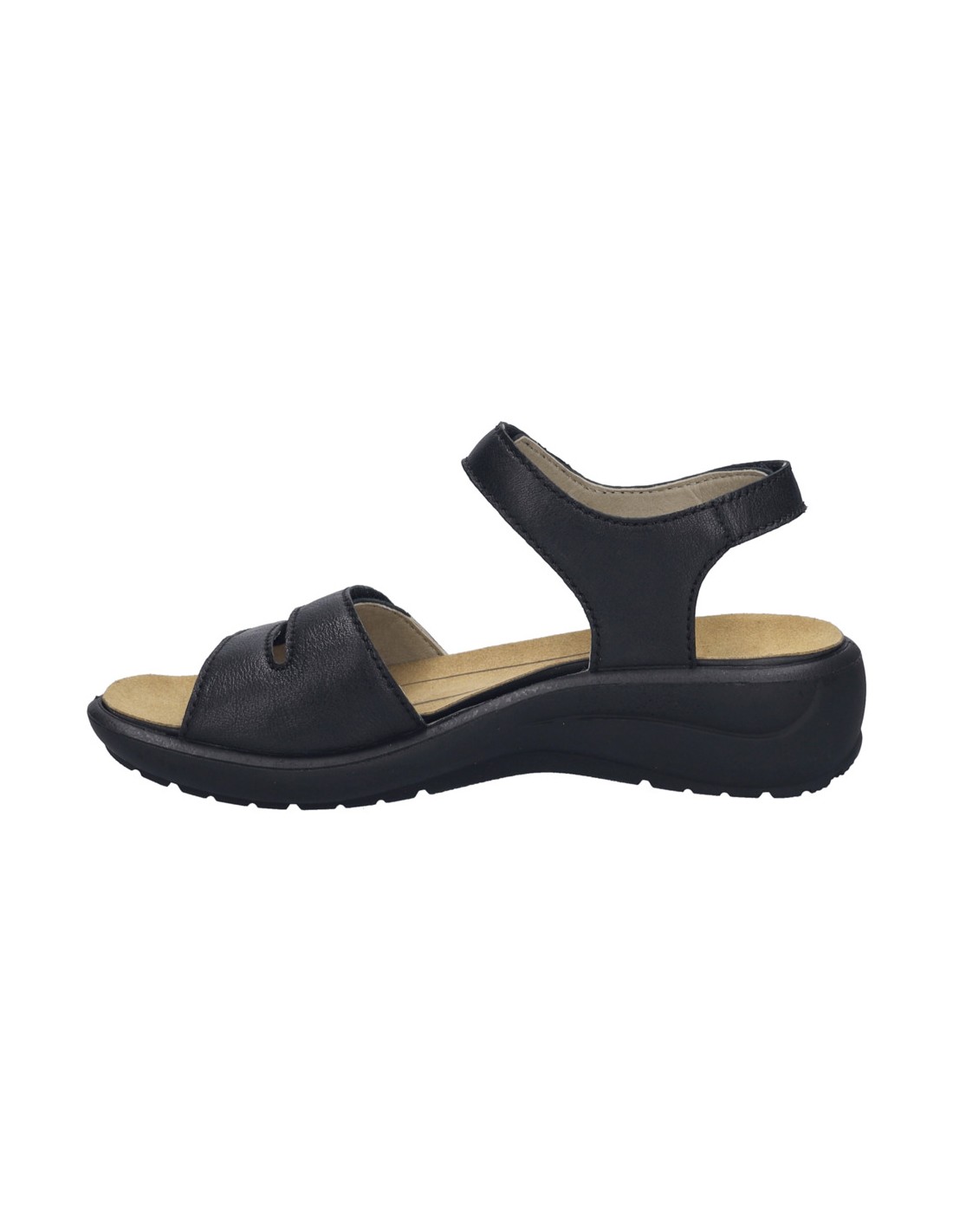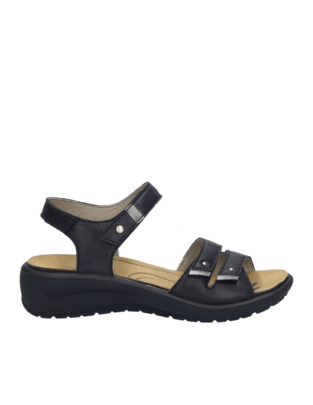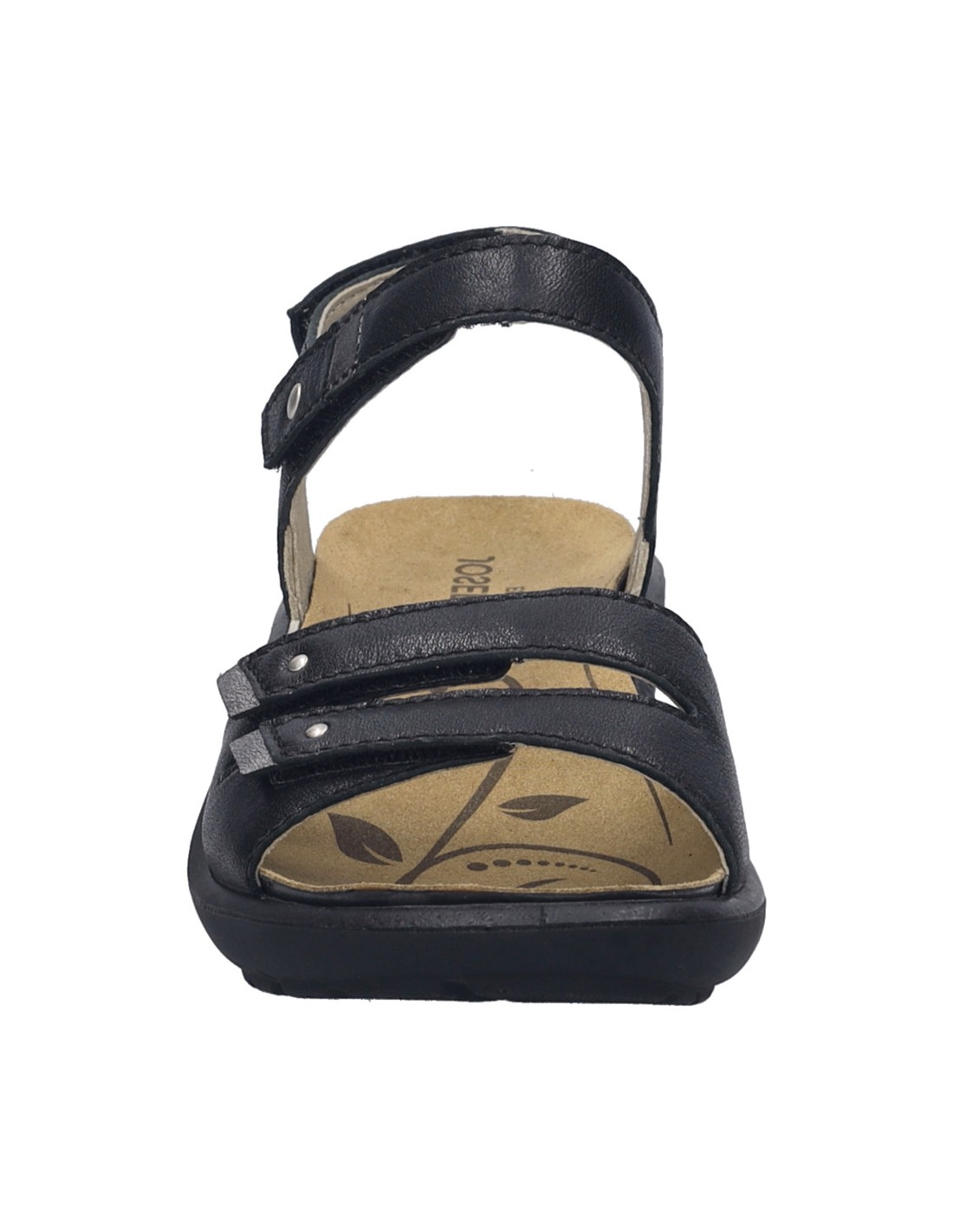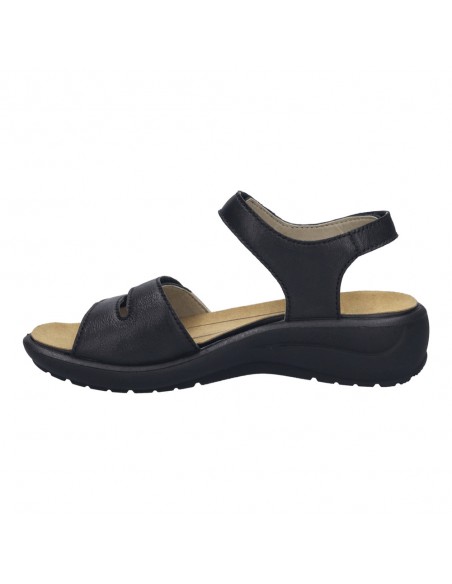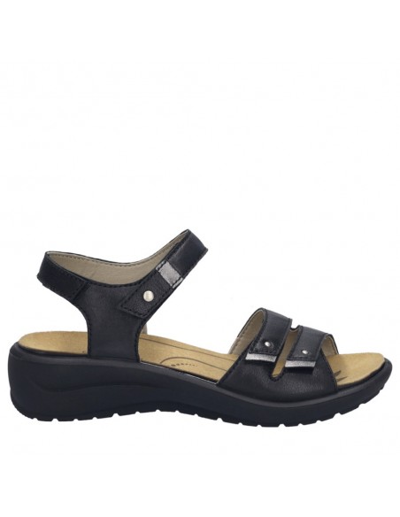 Descripción: Sandalia mujer de Josef Seibel ANNECY-02 en suave piel negra y detalles plata. Ajuste con velcros. Planta anatómica extraible. Piso de poliuretano inyectado ligero y con dibujo antideslizante.