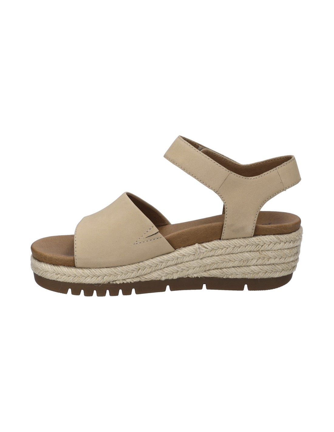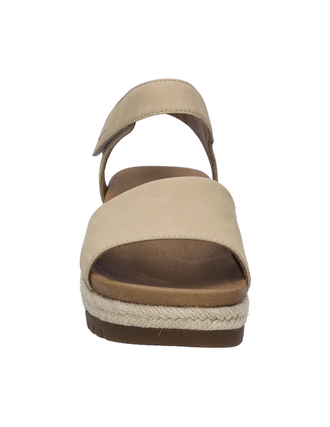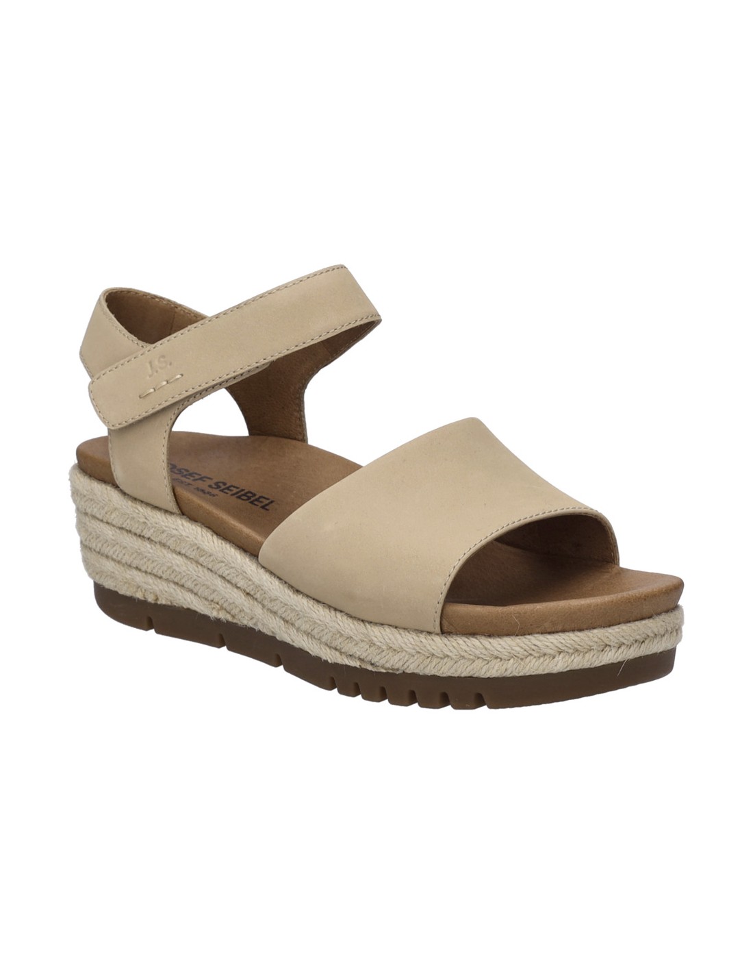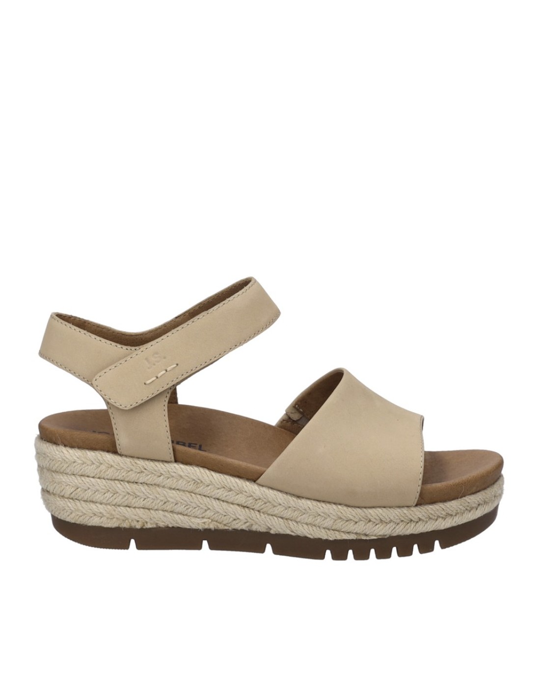Descripción: Sandalia mujer de Josef Seibel MIRANDA-02 en suave nubuck beig y tira con ajustes de velcro. Planta acolchada anatómica forrada de piel. Cuña con plataforma de yute con piso antideslizante.