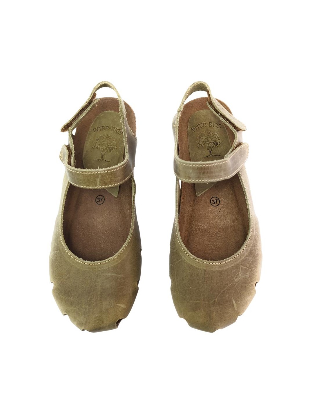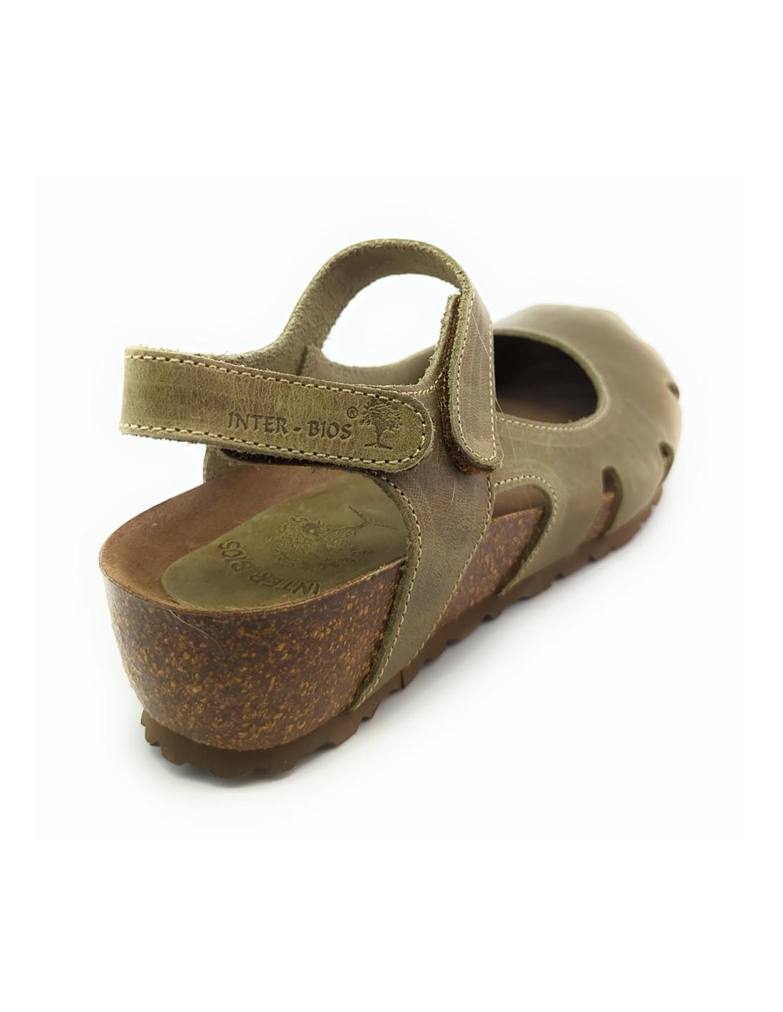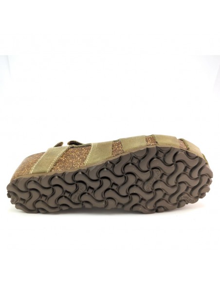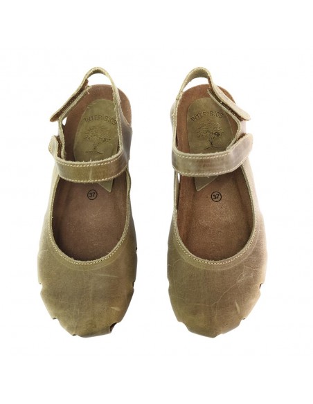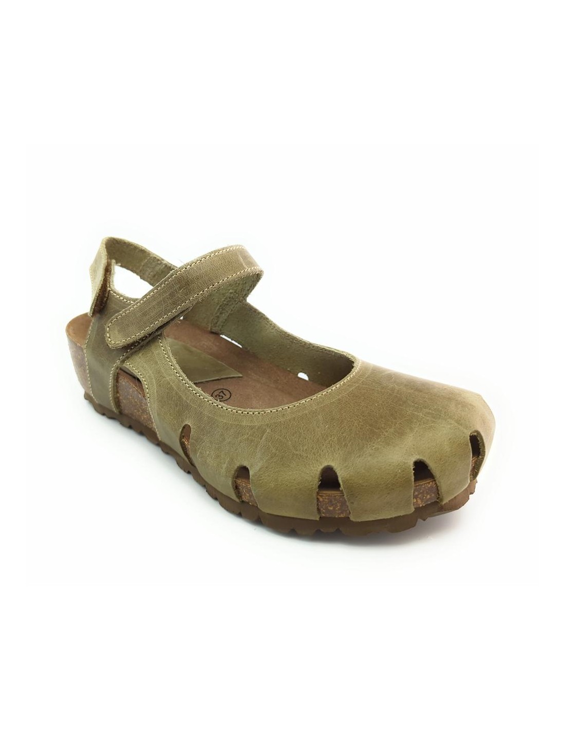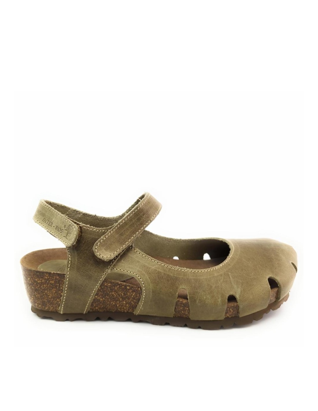 Descripción: Sandalia mujer INTERBIOS 5326 cerrada de la punta en piel natural kaki. Cómoda planta anatómica en piel estilo BIO . Ajuste con cierre de velcro. Piso de goma antideslizante.