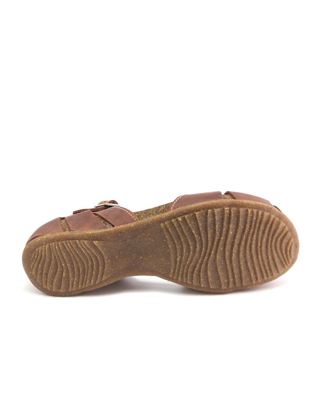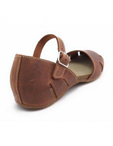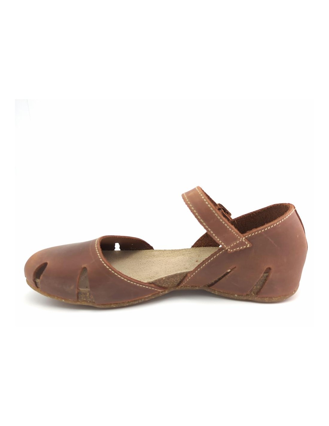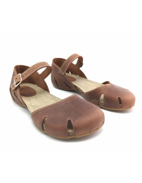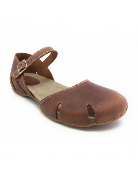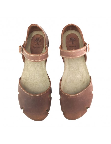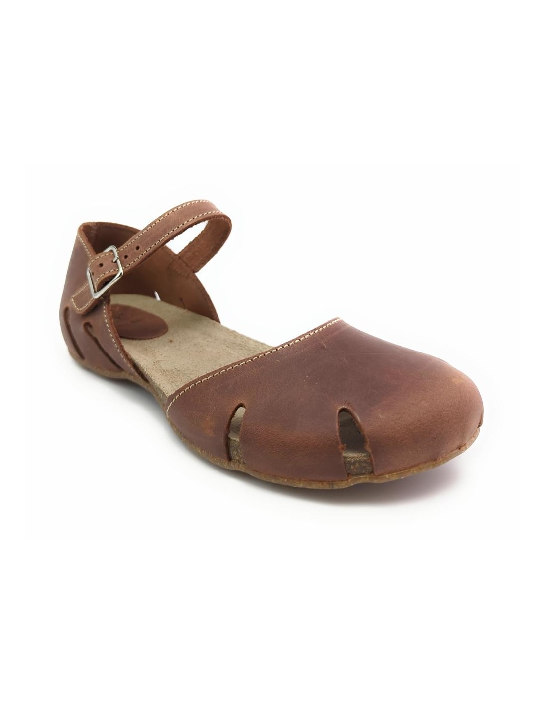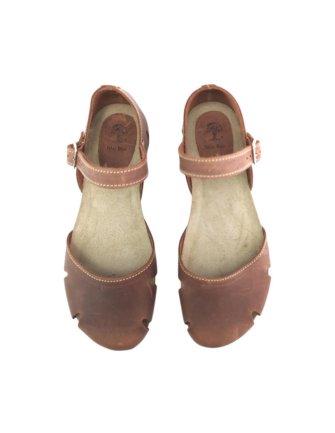 Descripción: Sandalia mujer INTERBIOS 4449 cerrada de la punta, con talonera y ajuste de tira con hebilla en piel natural tono cuero. Cómoda planta anatómica en piel estilo BIO. Piso de goma antideslizante.
