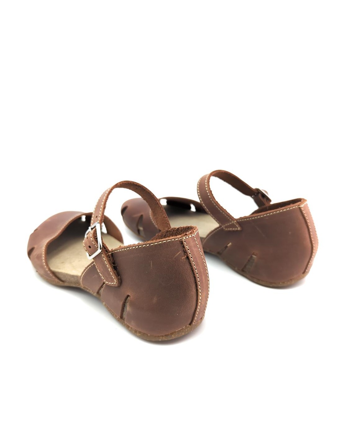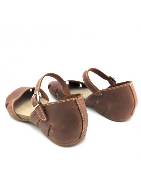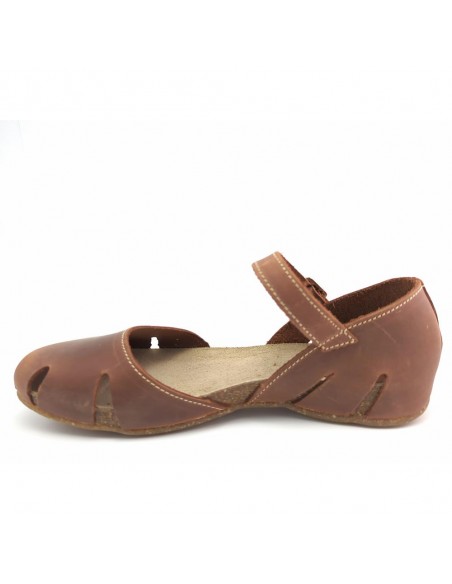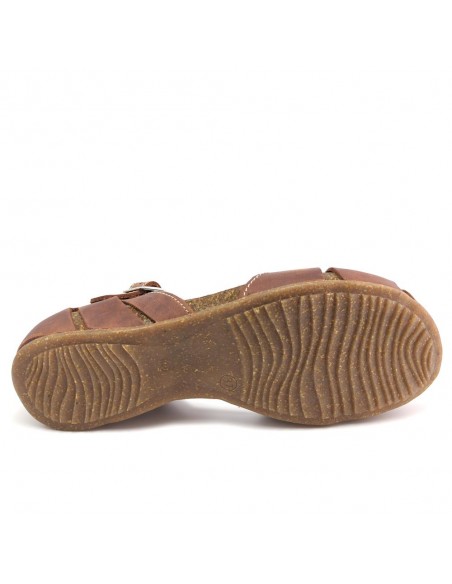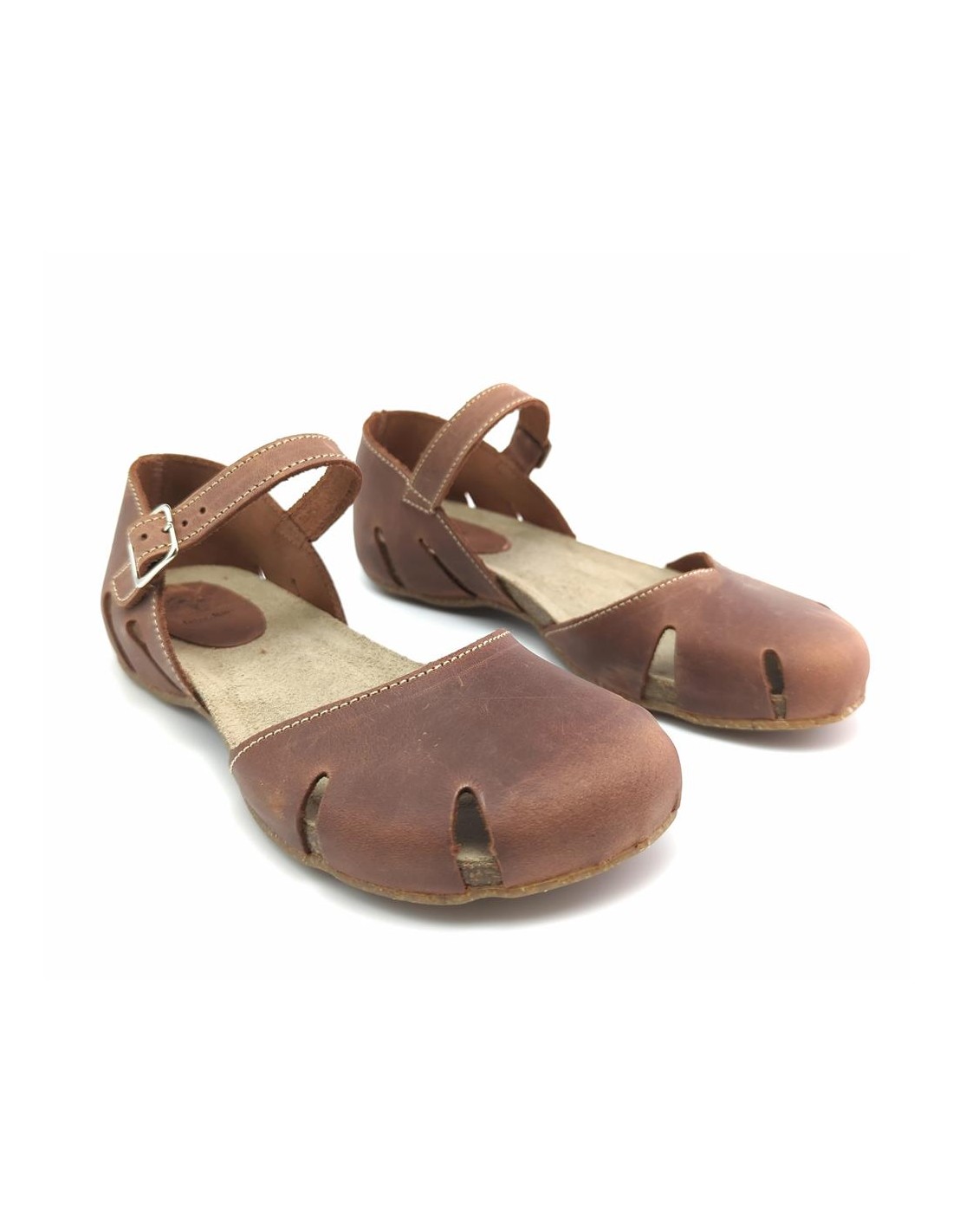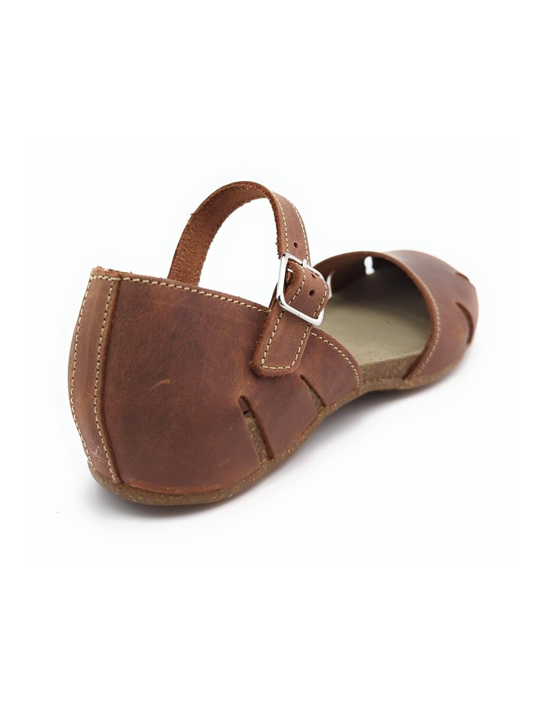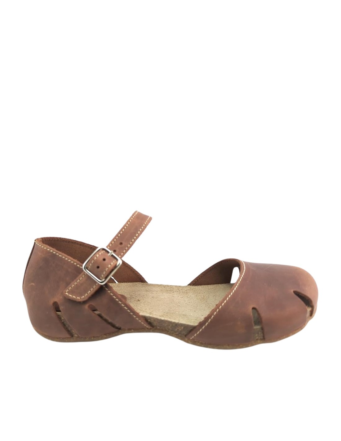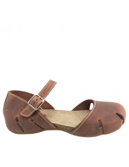 Descripción: Sandalia mujer INTERBIOS 4449 cerrada de la punta, con talonera y ajuste de tira con hebilla en piel natural tono cuero. Cómoda planta anatómica en piel estilo BIO. Piso de goma antideslizante.