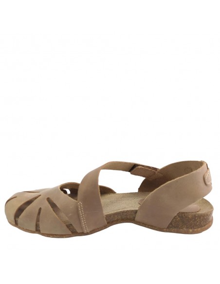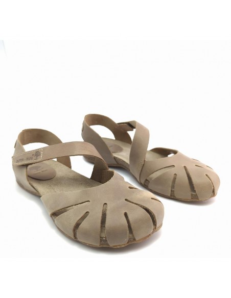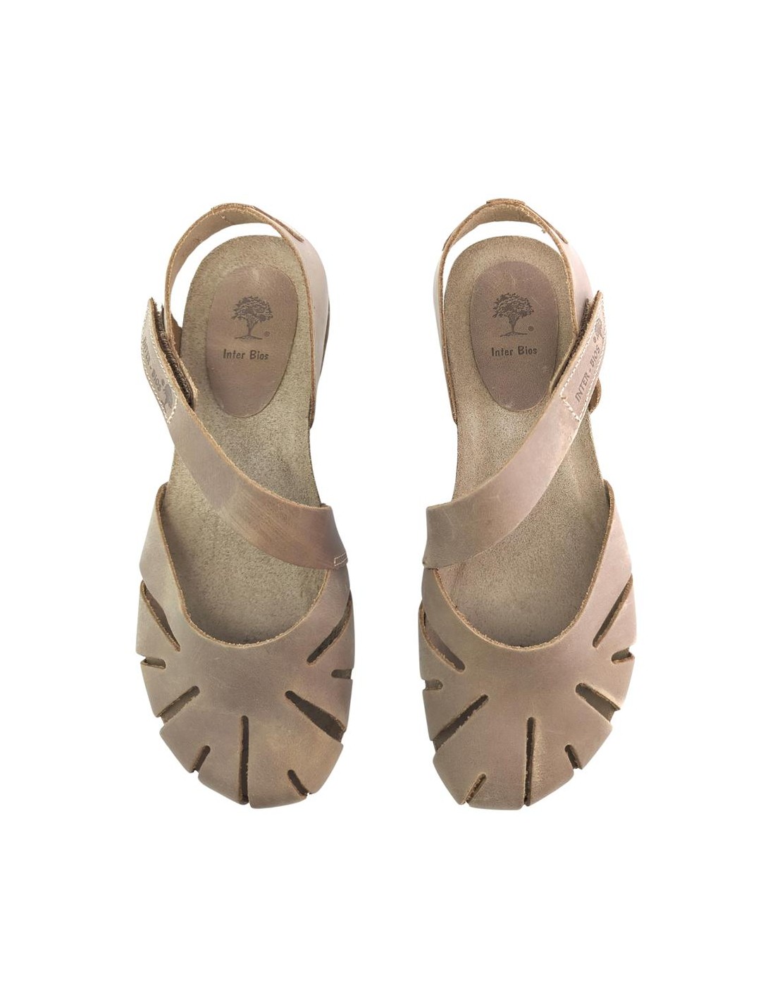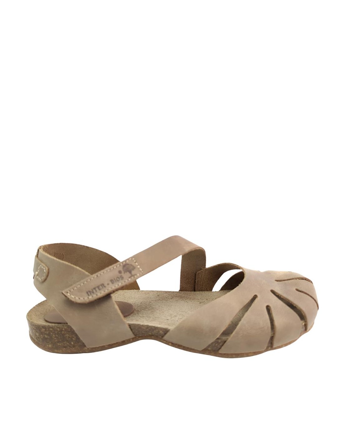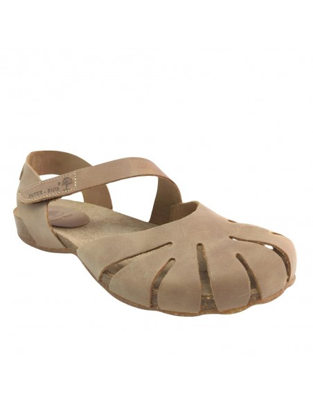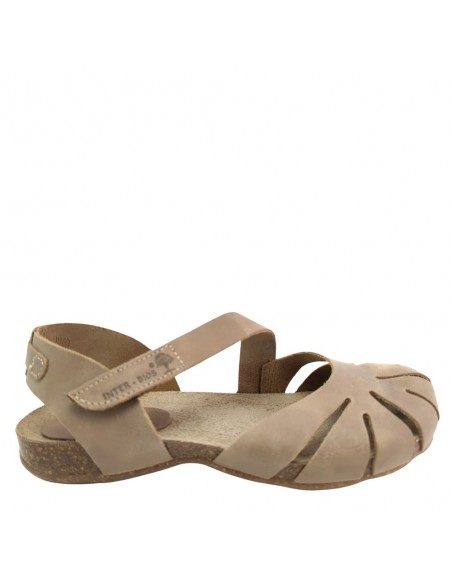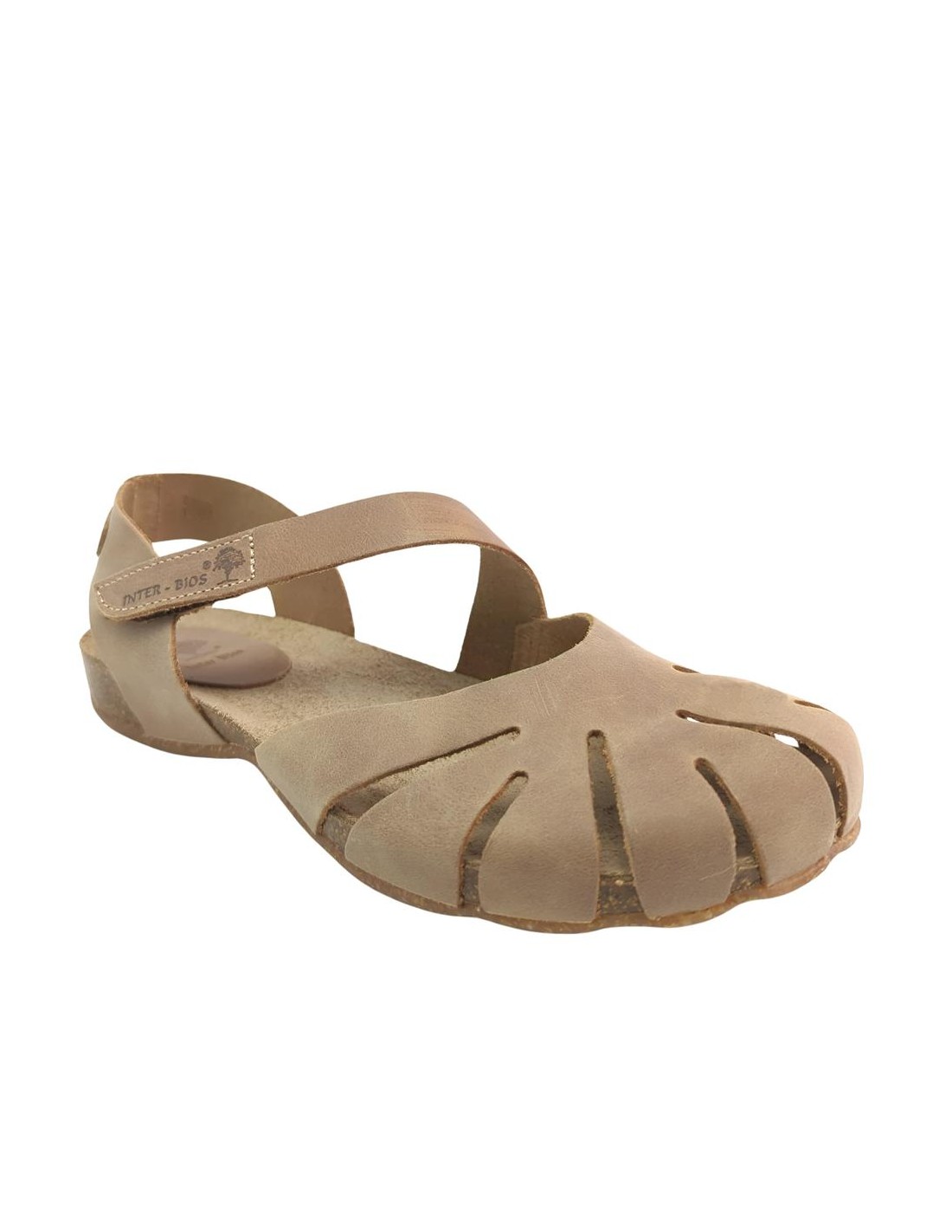 Descripción: Sandalia mujer INTERBIOS 4456 con puntera cerrada calada en piel natural beig. Cómoda planta anatómica en piel estilo BIO. Ajustable con banda cruzada de velcro. Piso de goma antideslizante.